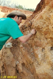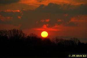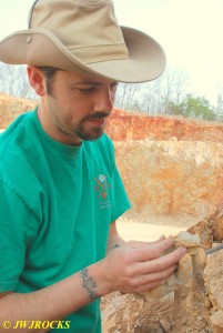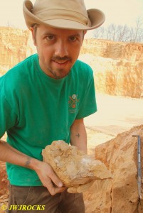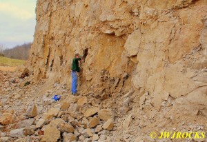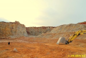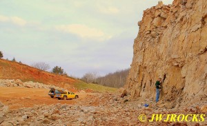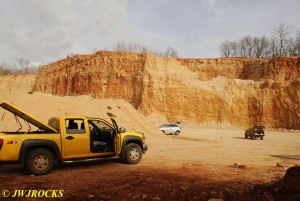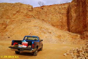 Missy and I got up early Saturday morning and drove down to MFQ, after I received a call Tuesday night at work from my buddy Jim, who told me that there was some new activity there earlier that day, near the coved wall. I was looking forward to seeing what could be found, as that wall has produced alot of pretty crystals in the past couple of years. Usually it starts getting light about 5:30 am, but each time I glanced to the east, all I saw were a low line of dark blue clouds as we traveled down the road. Only as I got close, did the sun finally make a beautiful appearance, in the form of a large fireball from the clouds…if you look close, you`ll notice the crescent moon just above the sun as well…..