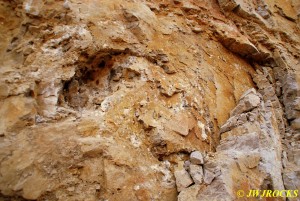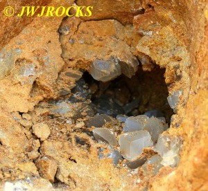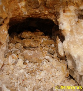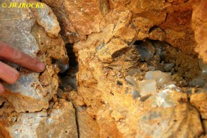 I decided not to climb up the bench ramp again this time, and walked around the base to see if I could spot any crystals that had rolled down the walls, that might indicate a pocket nearby. Within a few minutes, I spotted a couple of boulders embedded in the sloped wall, and it appeared that someone had found some druse in a pocket under the left boulder. I did some exploring and suddenly discovered some poker chips under the boulder on the right side….