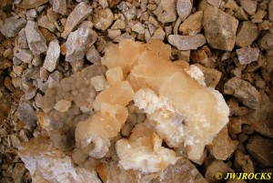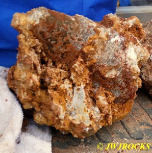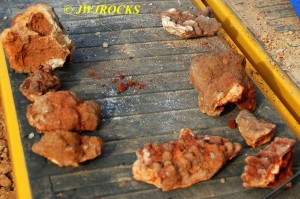I had been up on that bench a few weeks back and found just a few pockets with some nice calcite druse and poker chips mixed in, some of them had some nice dogtooth crystals as well…. on a Saturday, Â and then the next day I drove down to a location that a good friend of mine had told me about last year…I refer to it as the new secret spot….a location that has proven to be a very good place to find some great clusters of crystals, especially dogtooth crystals…on that particular day a few weeks ago, I def found something worth writing home about, but have chosen not to until recently when I told a few close friends about it. Suffice to say, I had a field day that day and brought home several canvas bags full of wrapped goodies, clusters, singles, twins, triples, all bright orange dogtooth crystals, from micro size to beachball sized, many of each. It`s been a few weeks and I am still cleaning many of them. I`ll post some photos of them when I get them cleaned up…I had a few of them cleaned up and on display when some new rock collecting friends showed up last week for a visit, and they were pretty impressed with them as well.