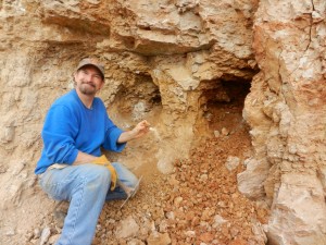 …after two hours on this pocket, I was ready for another bottle of cold water and I decided to wrap everything up and load it in the truck bed, and then evaluate to see how tired I was….the temps were climbing by now and the little shade I had by the boulders was just about gone and I had cleaned out the pocket quite well. After wrapping them all up, I had three bags completely full and then wrapped up ten large ones as well, basketball sized. Â I decided that I had a little more energy left and moved further east along the wall, looking for more potential for pockets…and soon found an area that I had once found several pockets, some filled with druse, but beautiful druse and sometimes when I find those druse pockets, I find poker chips attached to the druse as well….yesterday, I found two more pockets of the druse with poker chips attached…I had to do a bit more burrowing in like an armadillo again, but managed to do so safely again and filled two more bags with goodies, before finally wearing out…the temps had to be near 95 now and the humidity was getting bad as well. Jim and his wife stopped by to chat for a minute, they too were tired of the heat and headed to the river to sit and soak in it. Missy had been inside my truck in the ac for the past hour and I soon joined her.