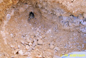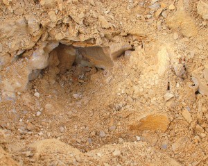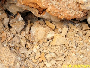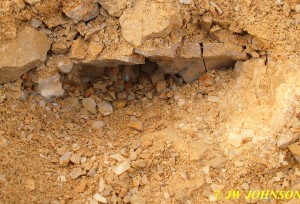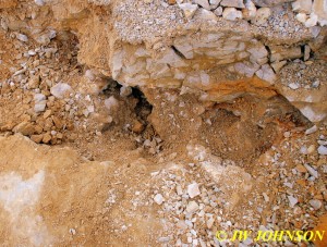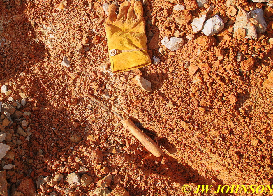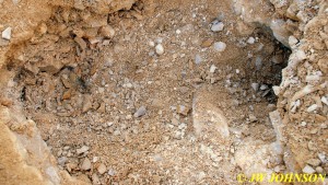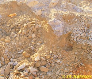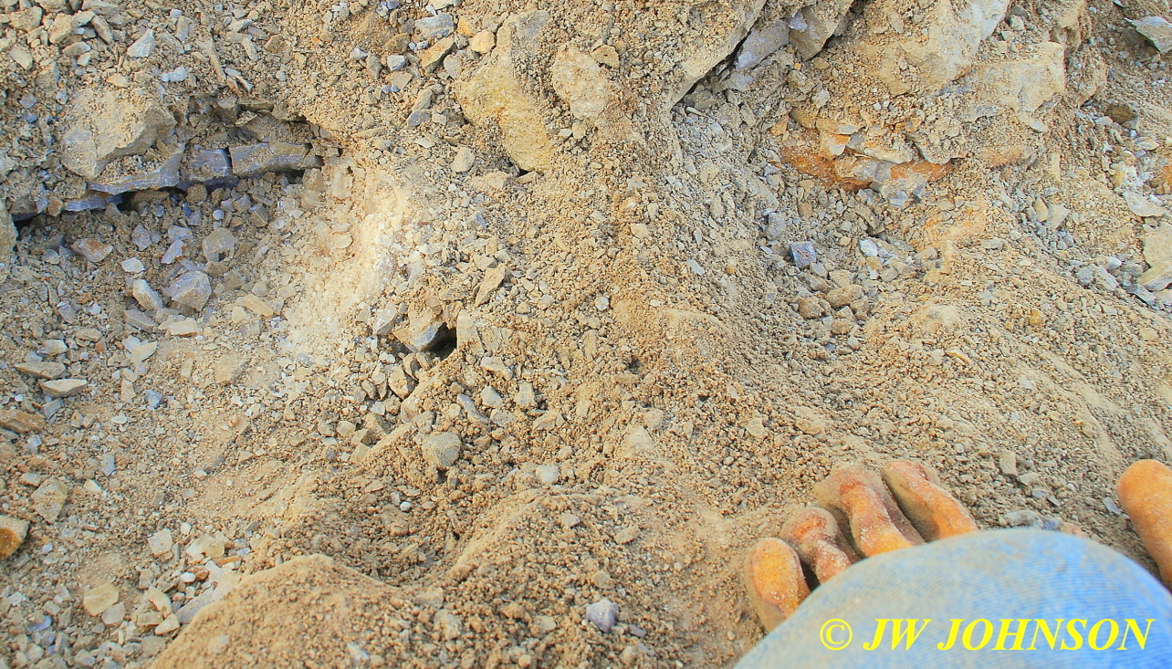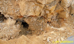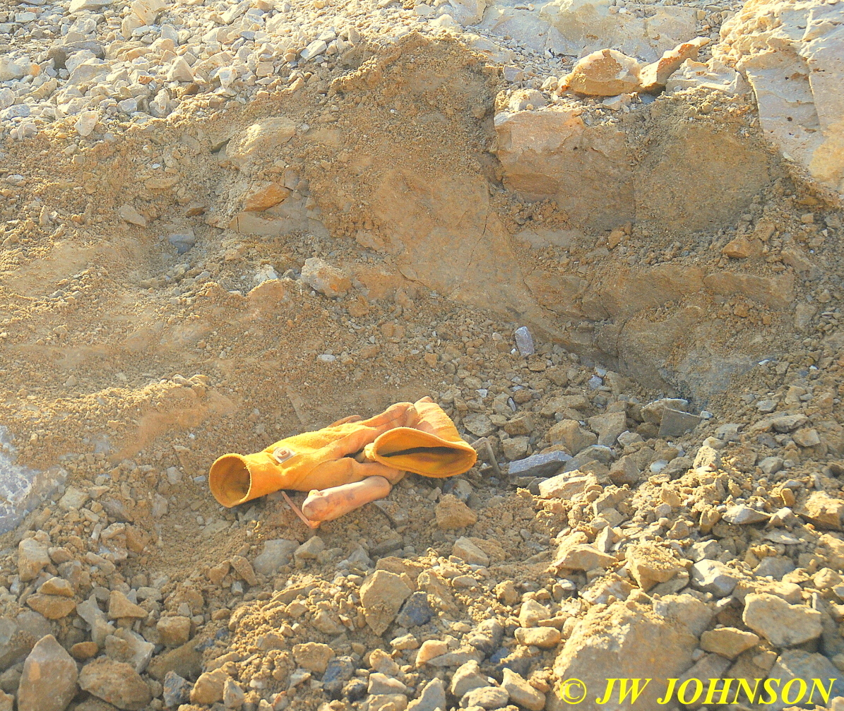 …the hole located in the right hand side in the middle of the photo above…I decided to see if I could rake around and find yet another entrance to this possible pocket, perhaps one easier to access, as I wasnt looking forward to moving alot of heavy rock around to get in if I didnt have to. As you can see in the photo above, I raked to the left and above about ten feet and then hit another soft spot and stopped where my gloves are, to explore further.