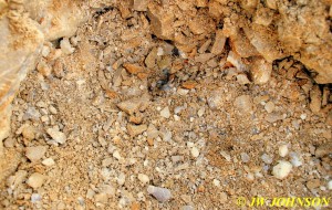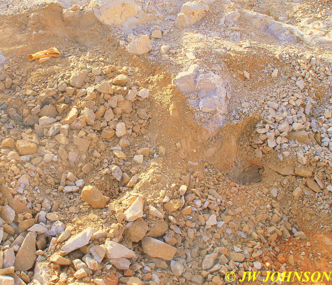 …I started moving big rocks around and out of my way that were sliding down the hill to the floor. I wasnt able to find a pocket opening in the floor where it intersected the hillside, but I was still seeing single poker chips on the hillside mixed in with the ugly rocks, so I decided to work my way up the ridge hillside and see if I could locate a pocket further up, as it appeared to me that the crystals were possibly originating from up higher on the hillside. Within another thirty minutes, I located a hole that appeared to drop down into a pocket, down below a large dome of heavy dolomite rock….