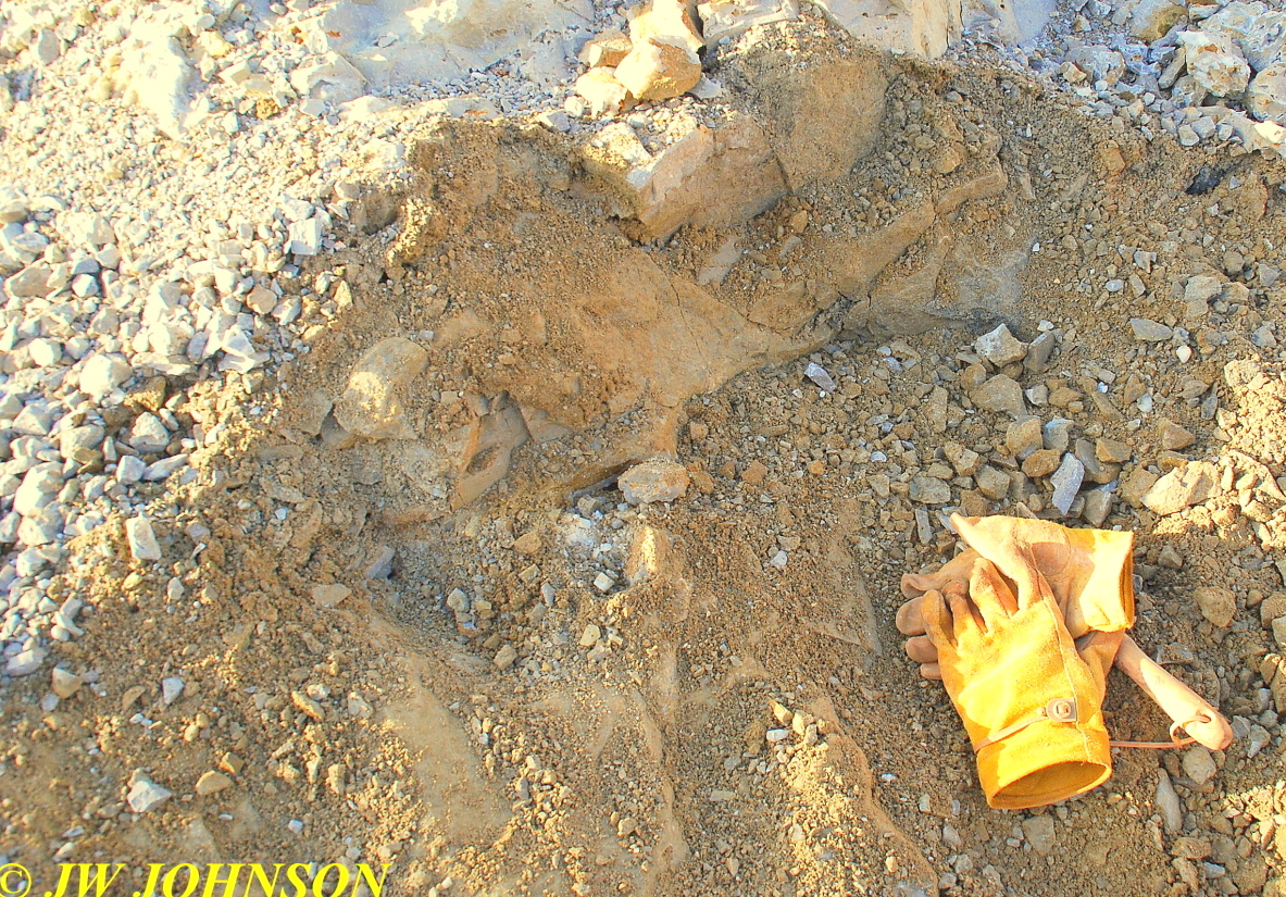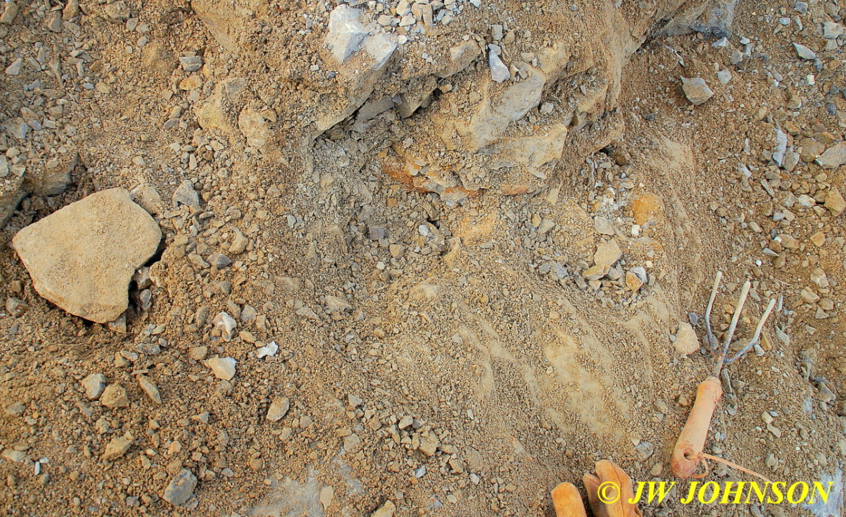 In that depression above my gloves in the photo above, I pulled some pretty druse plates out and set them up above, then started working my way down that little embankment toward my gloves, and then hit another soft spot and dug it out to reveal a bluff line….