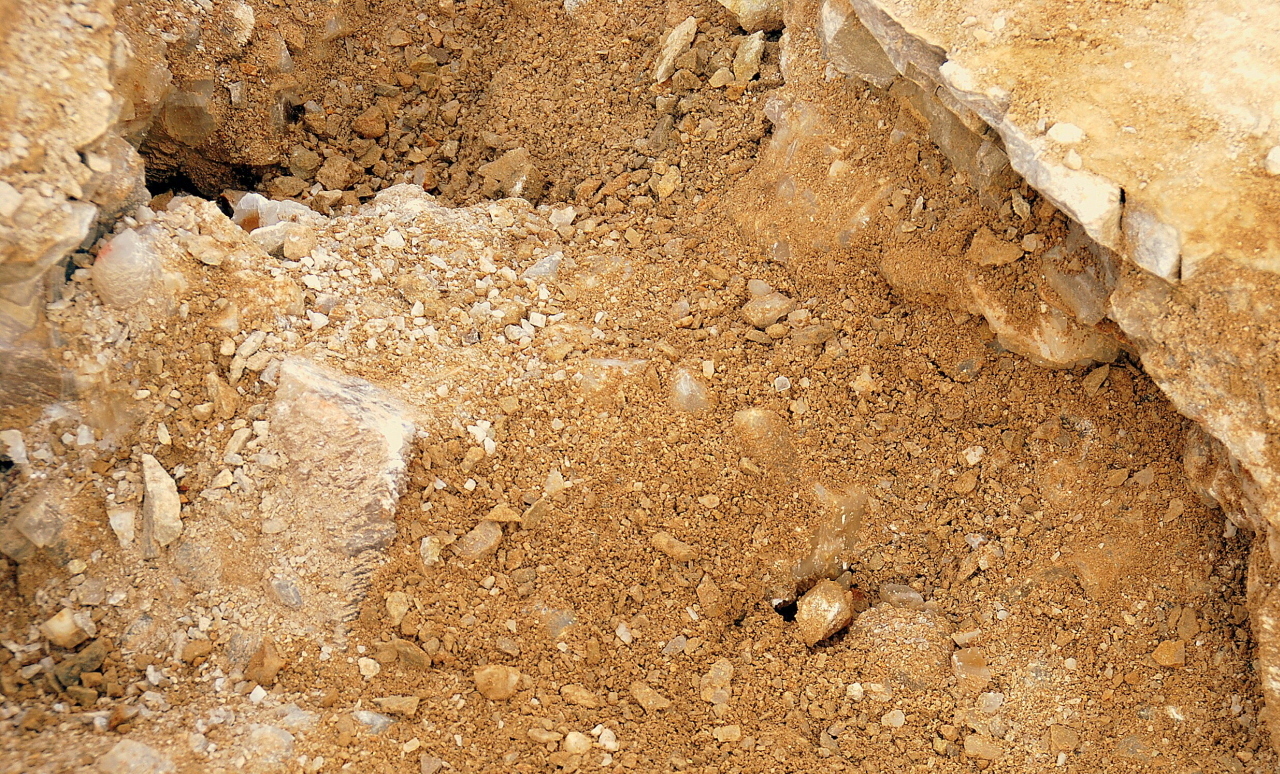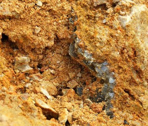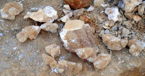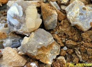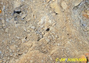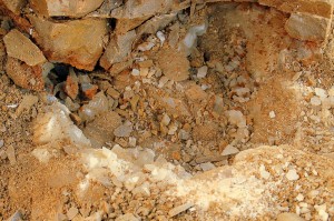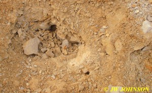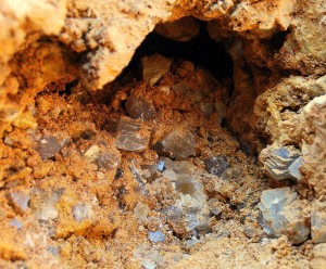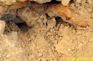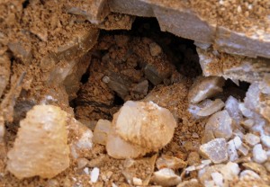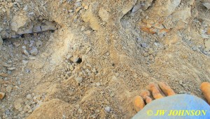 …and in this other photo you can see more crystals hidden in the dirt and gravel right under the surface at the entrance to the pocket….and the roof plates of the pocket just hanging there waiting to be pulled out….