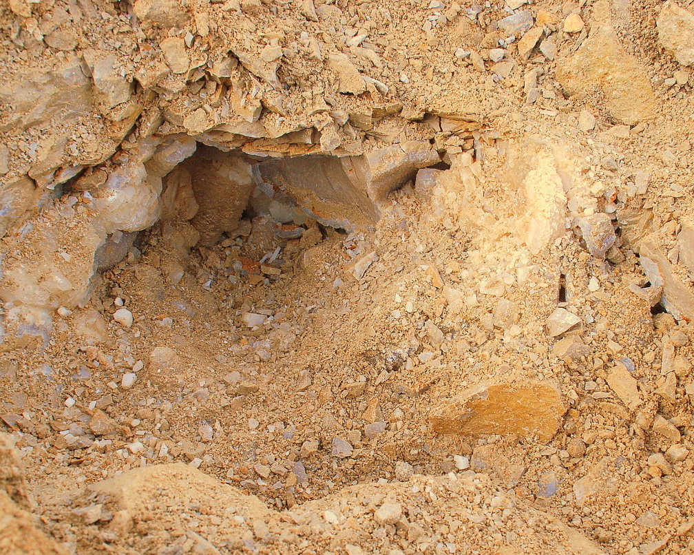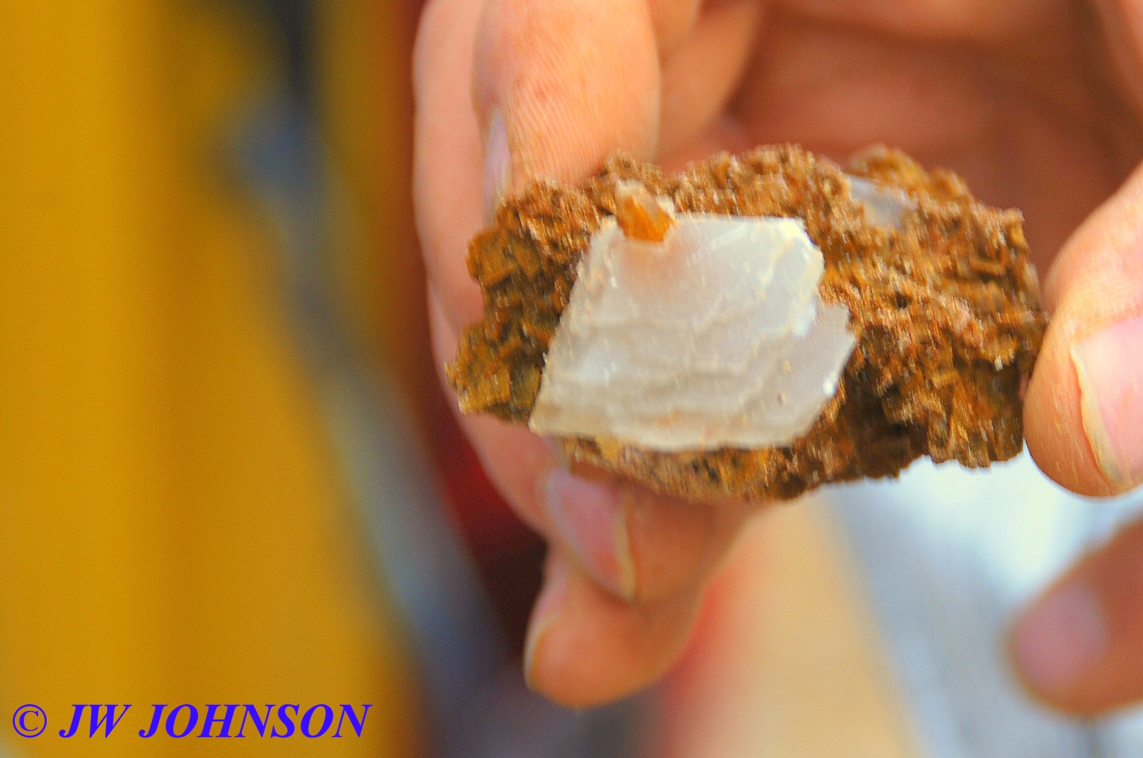 …and by the time 4 pm rolled around, I was just wrapping things up when I decided to check out this square hole in the end wall of the large hole I was sitting in….I had briefly checked it out before I left the evening before, and it appeared to be heading down into a pocket below, possibly another cavern pocket farther underneath…you can see the tunnel hole in the photo above, right above the yellow end of the chisel and below my bags…there was a plate right above the hole and to the left side a bit…I figured if I removed it I might be able to get my hand in the tunnel hole and see if I could pull some crystals out….so I chipped it out of the way and when I did that, WOW, behind it…..
