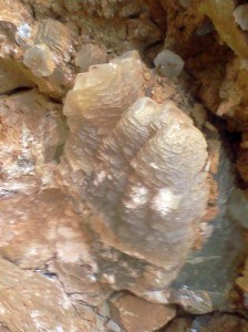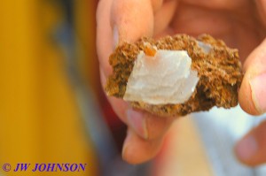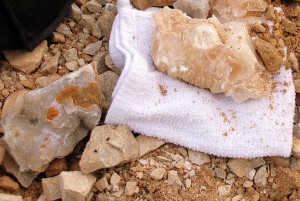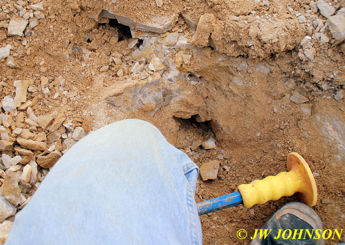 Sunday morning, after breakfast, Missy and I loaded up the truck and drove back down to the secret spot, this time we went in a different way and didnt encounter any mud. I put my boots on and grabbed my hammer and chisels and bags and walked over and started chipping out the clusters from the walls on the side of the hole….
