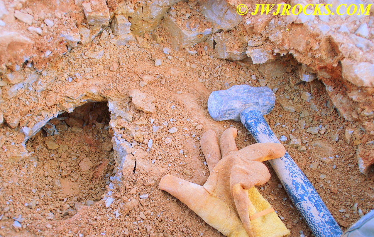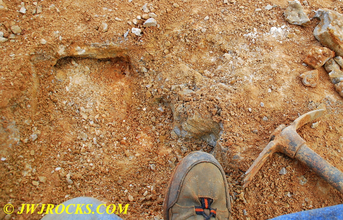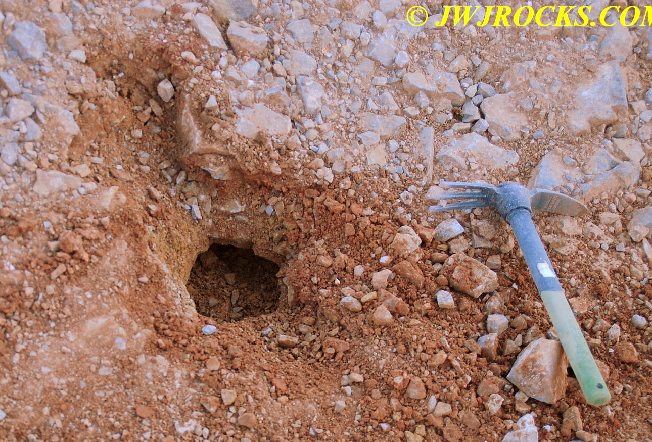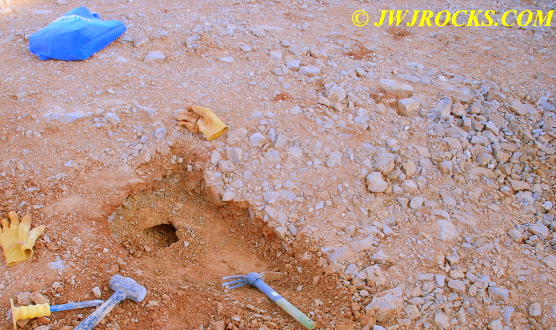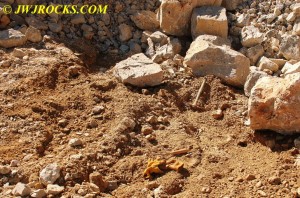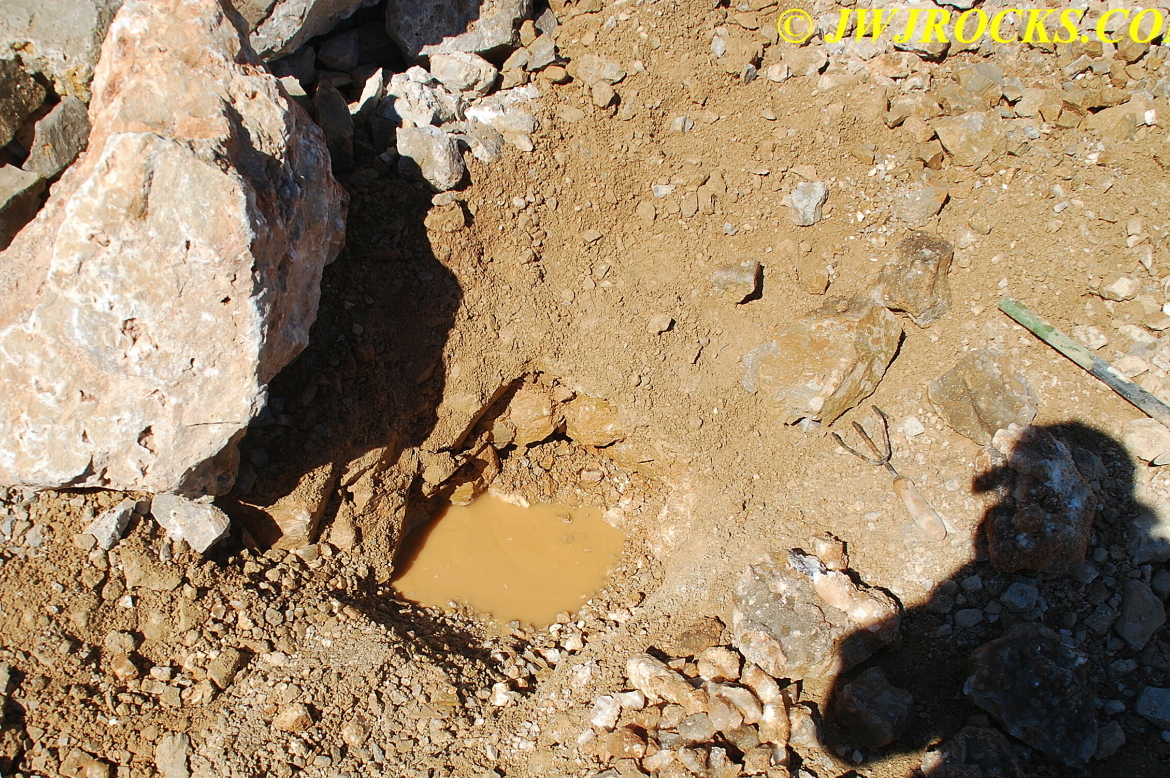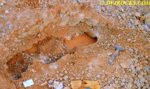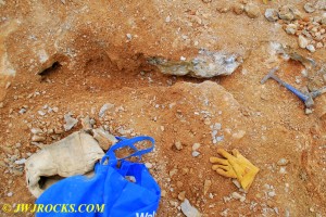 …oh well, still a lot of area to search for pockets remaining there…so I sat about to find one, walking over to the area where they removed the rock for this new wall and finding evidence of a pocket real fast…and sat about digging it out….