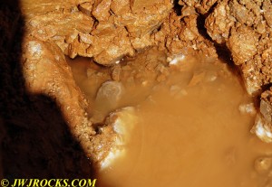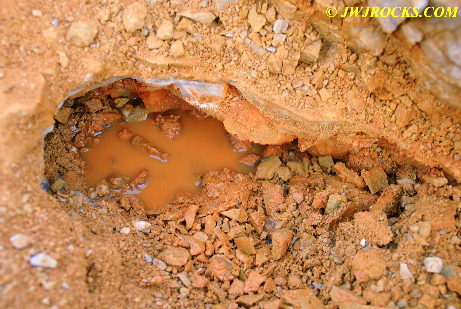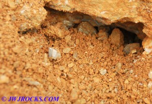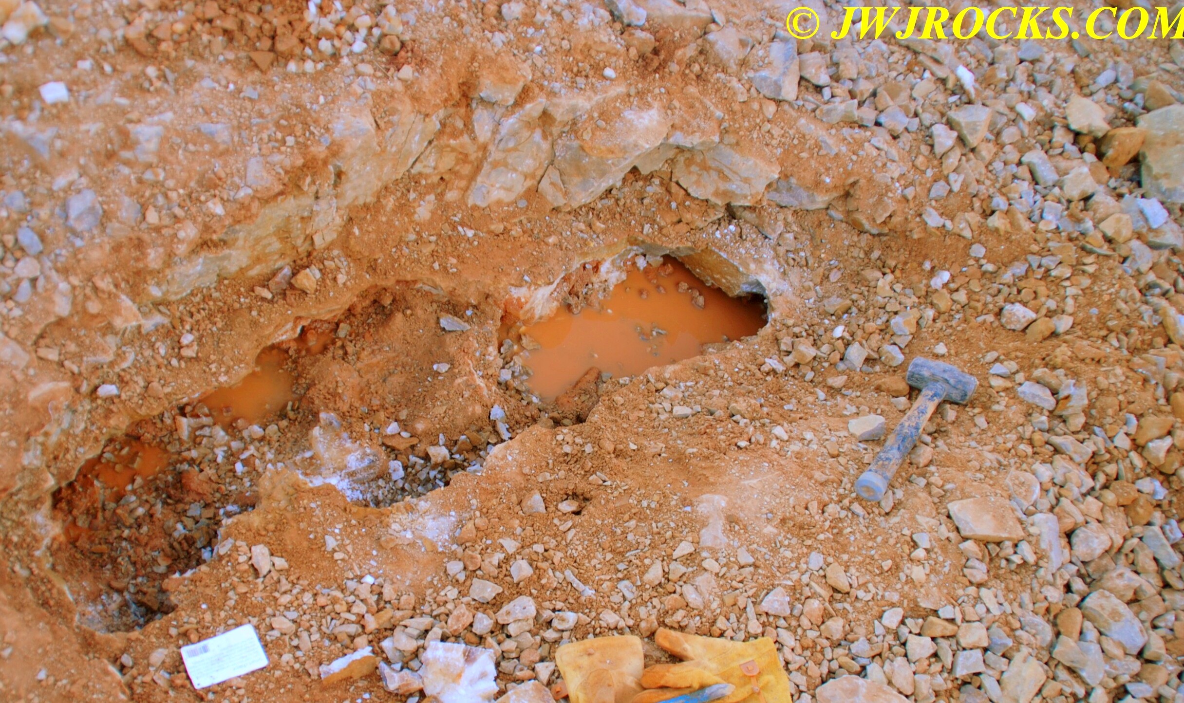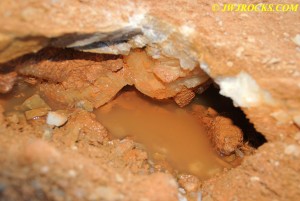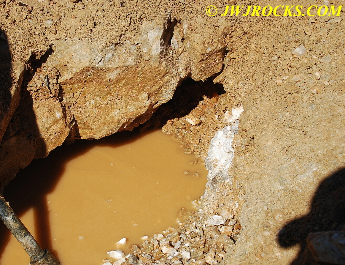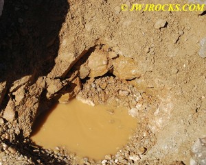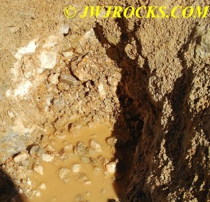 ….and then I hammered out the roof of that middle pocket as well and pulled a few chips from it, too. I then started back to the hole near where I was sitting before my break and started cleaning out around it and a few seconds later, yet another hole opened up….…for a brief minute of working this new hole, I got a bit excited…as I was moving rocks and dirt around, some of the rocks fell into the hole and went into water, and it was a loud ” kerplunk ” indicating a deep hole of water…so I cleaned the hole opening some more…only to discover a drill hole and water about thirty inches down…so I filled the water hole up with more loose rocks and filled it completely up….and started working on the pocket a few inches away on the other side of that area where the first hole had opened up….