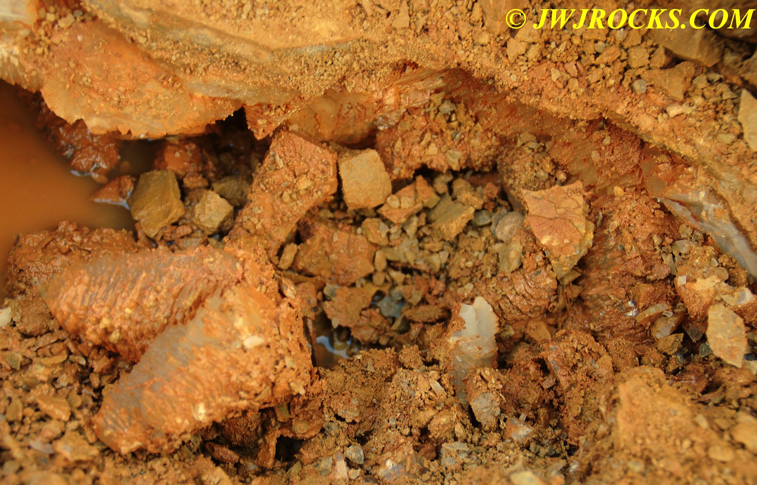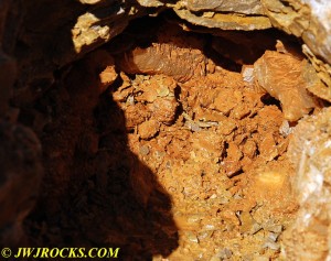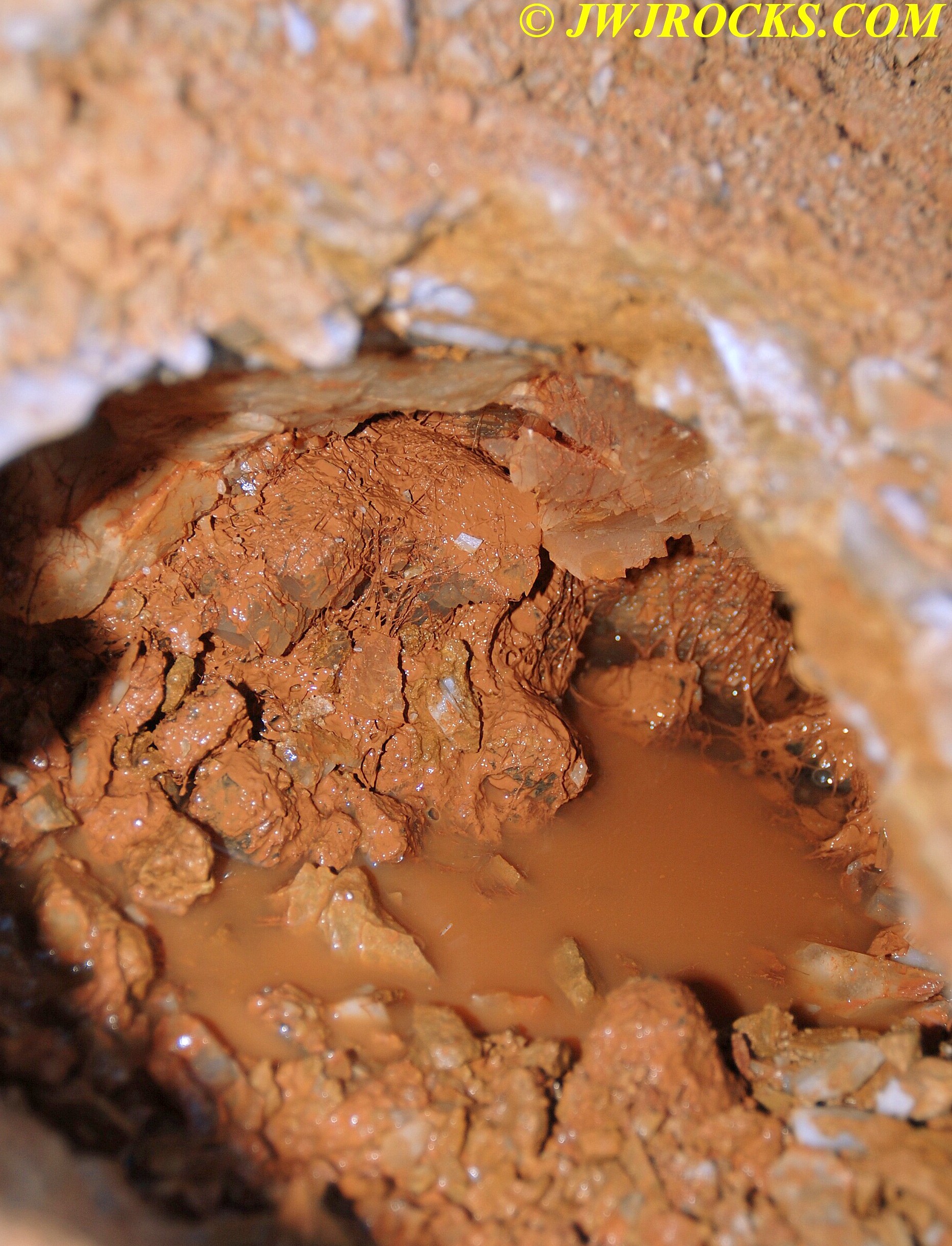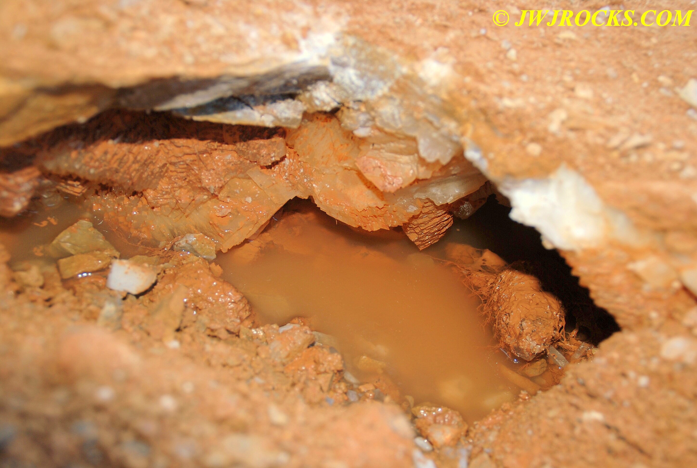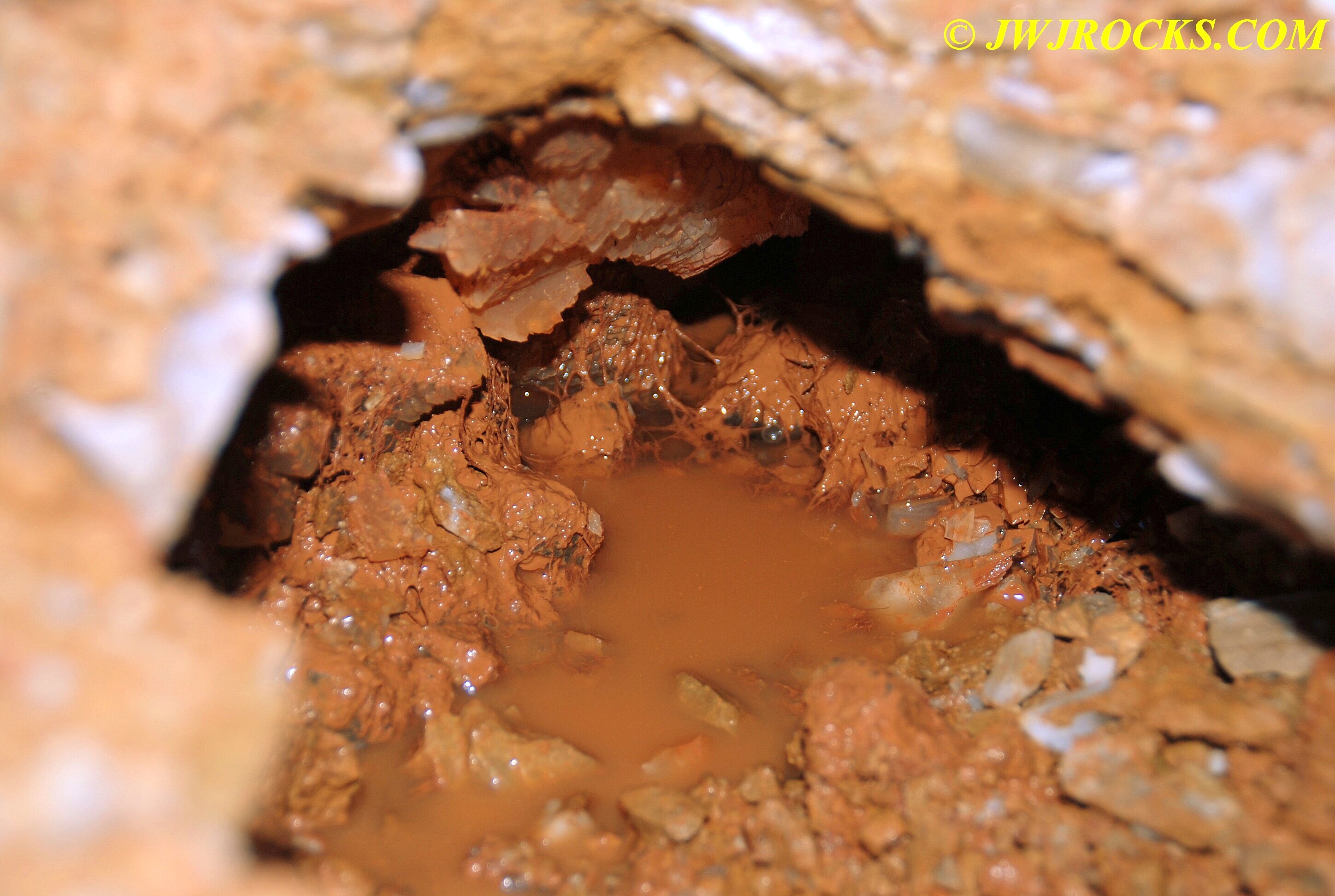….and then I hammered out the roof of that middle pocket as well and pulled a few chips from it, too. I then started back to the hole near where I was sitting before my break and started cleaning out around it and a few seconds later, yet another hole opened up….…for a brief minute of working this new hole, I got a bit excited…as I was moving rocks and dirt around, some of the rocks fell into the hole and went into water, and it was a loud ” kerplunk ” indicating a deep hole of water…so I cleaned the hole opening some more…only to discover a drill hole and water about thirty inches down…so I filled the water hole up with more loose rocks and filled it completely up….and started working on the pocket a few inches away on the other side of that area where the first hole had opened up….