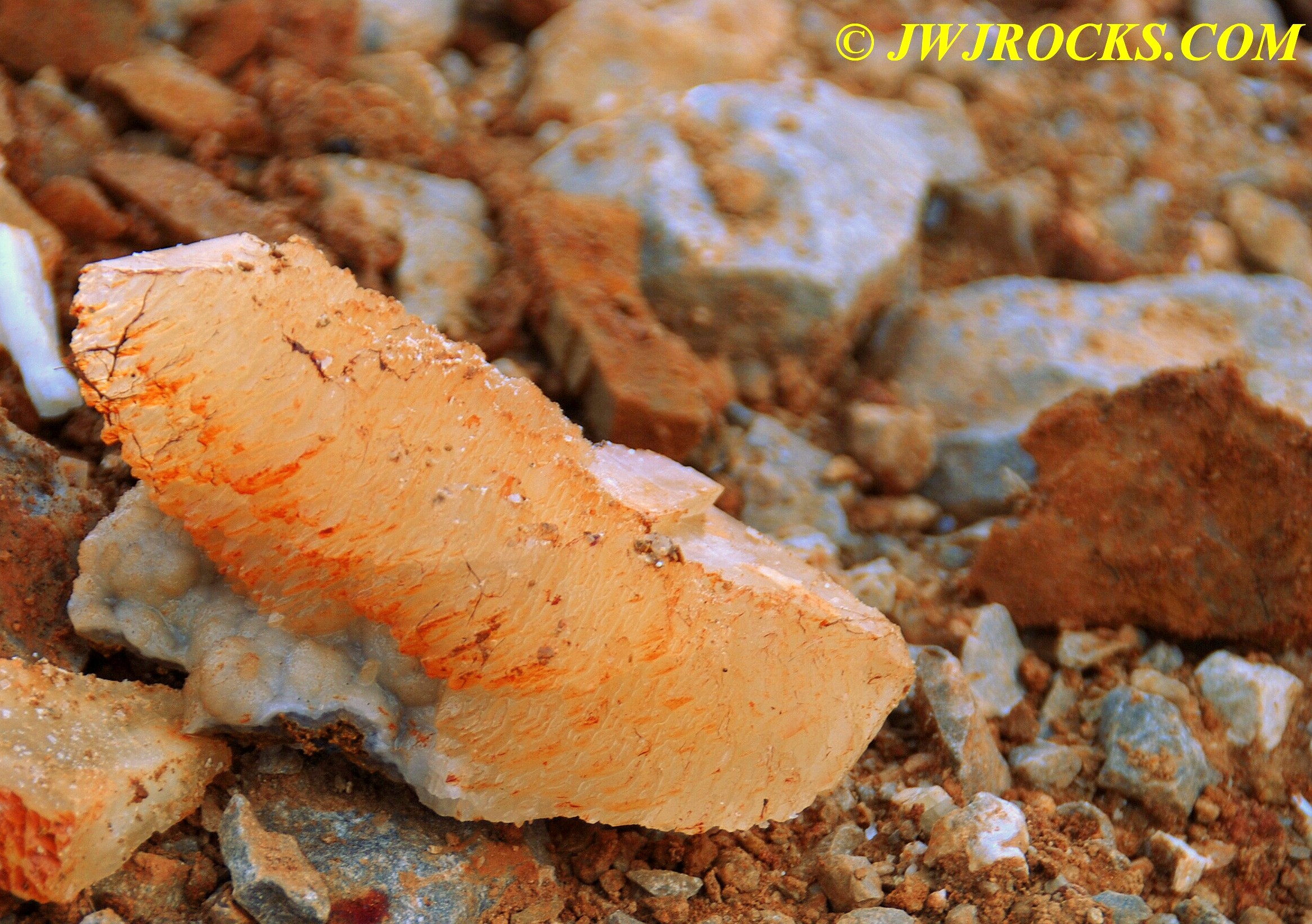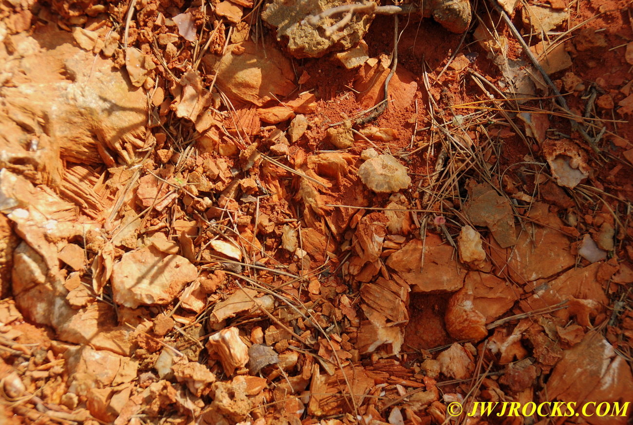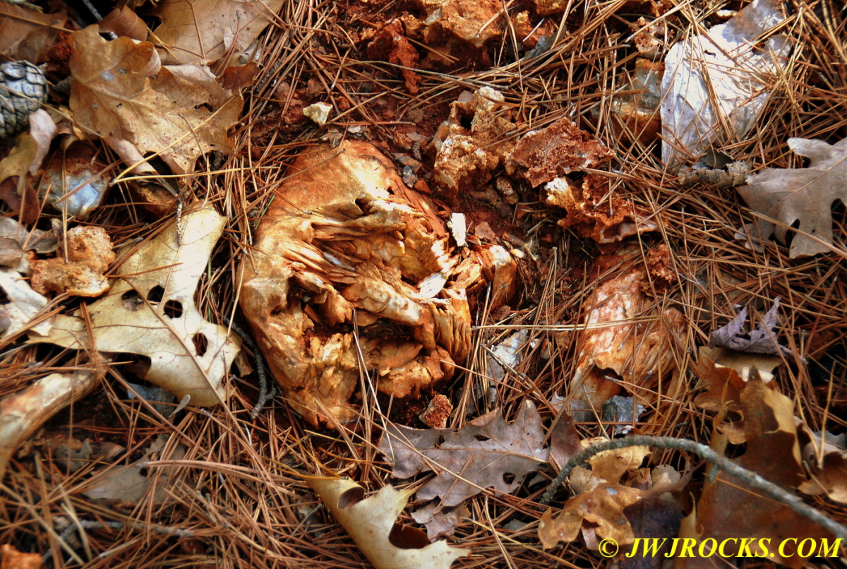 …and I decided to do a short walk around and just see if I could spot anything laying around that would indicate a pocket nearby…I walked over to the pile and spotted a pleasant surprise…a brown dogtooth calcite crystal with some poker chip formation deteriorated away from it, exposing the top of the crystal….