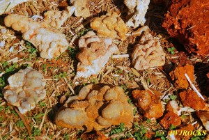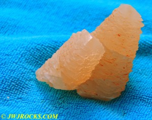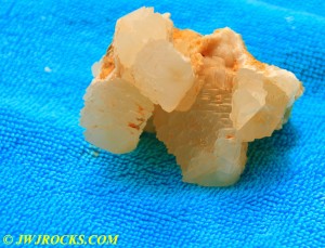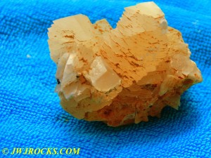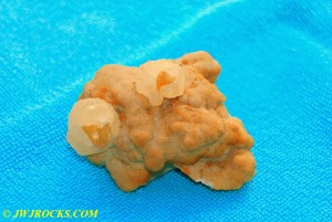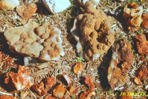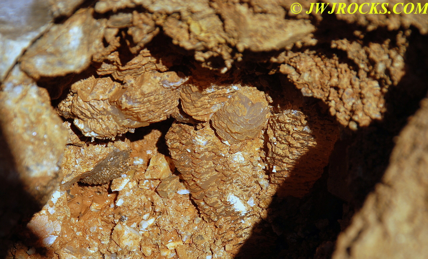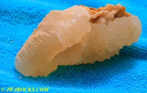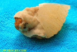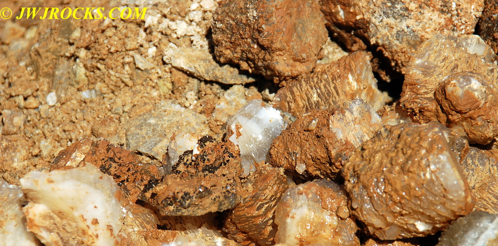 …and I decided to do a short walk around and just see if I could spot anything laying around that would indicate a pocket nearby…I walked over to the pile and spotted a pleasant surprise…a brown dogtooth calcite crystal with some poker chip formation deteriorated away from it, exposing the top of the crystal….
