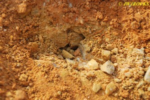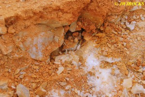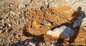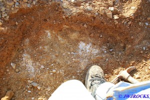 Steven and April made it out to the mine about 10:30 am and April`s mom was with them again this trip, she decided to see what she could find up in the loose dirt tailings, while Steven and April came over to the pit where I was at and we decided to dig down to the vein like we did last year. We were a bit higher up on the bank this time and so Steve had to dig down a little deeper to find it…about four feet down in fact and then widened it so at least one of us could get down into it.