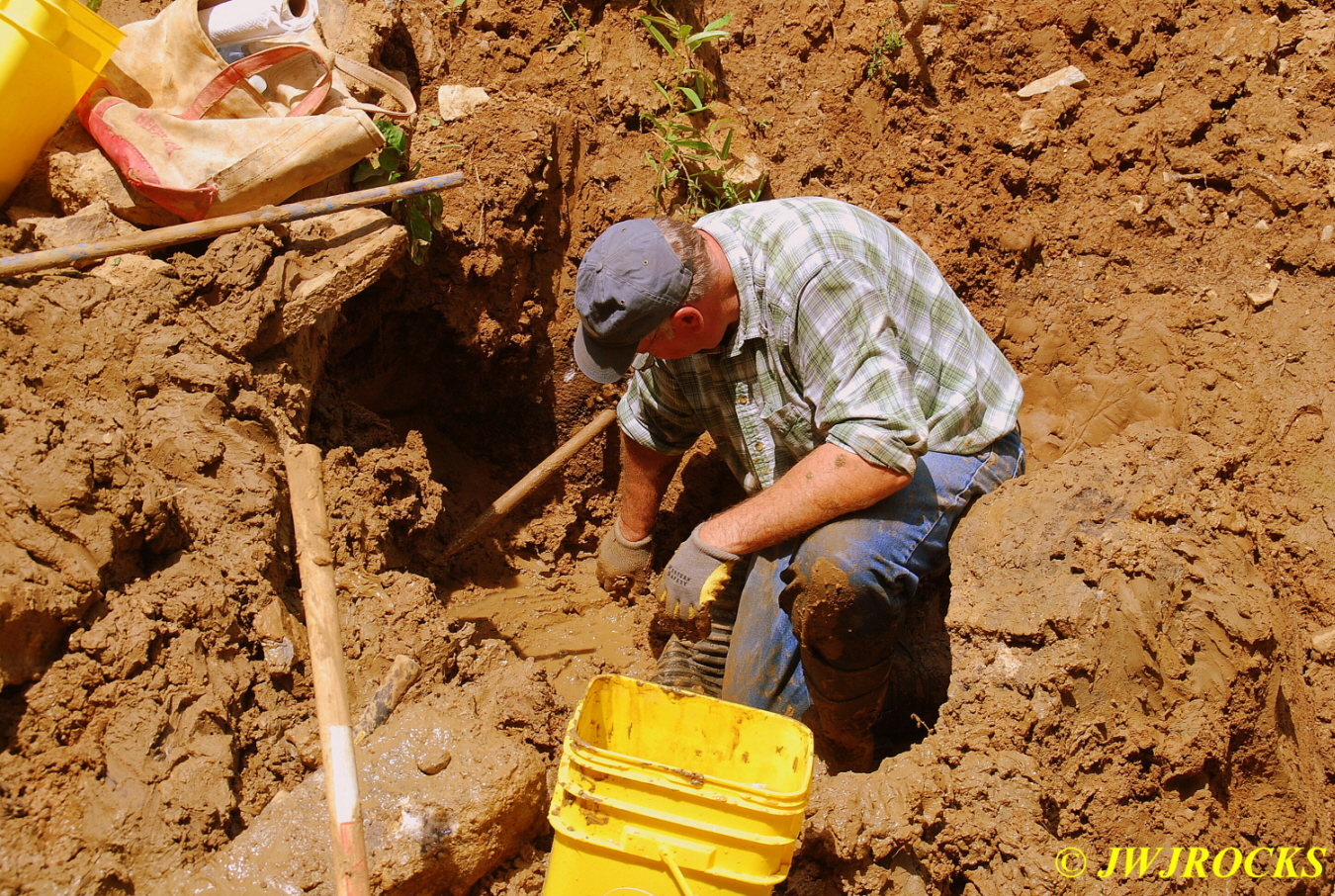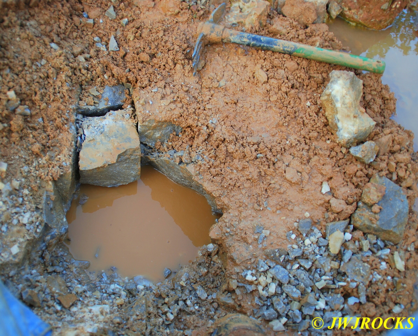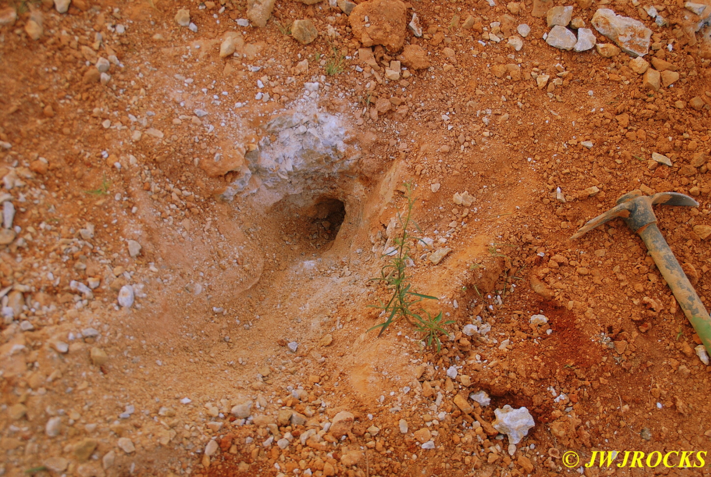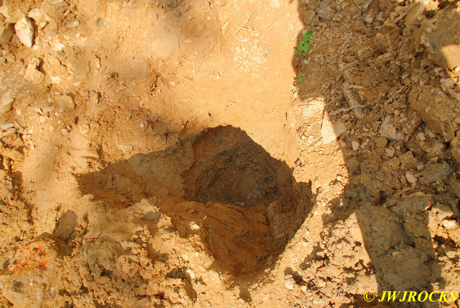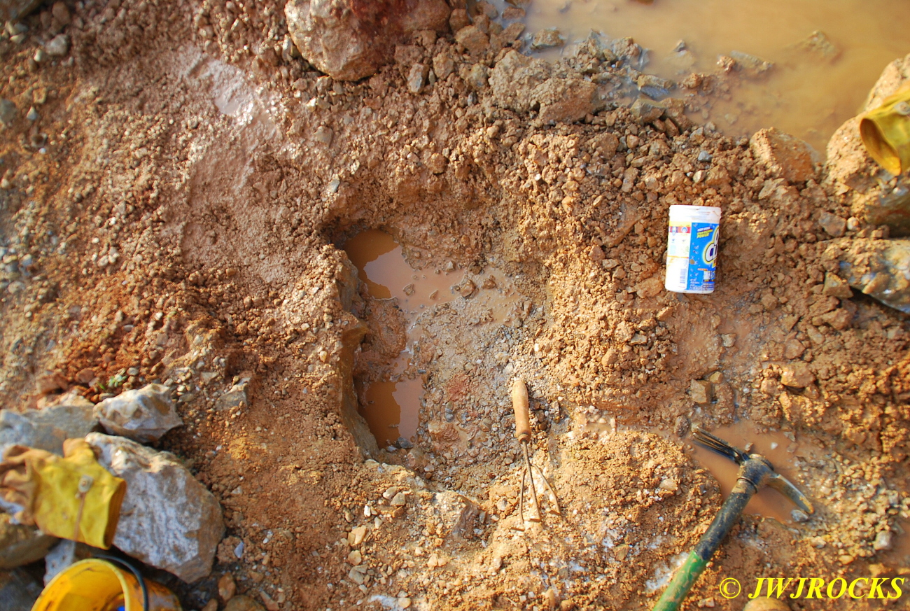 I jumped down into it first and began pulling crystals and clusters out right and left…I was standing on what I thought was the vein, and was pulling some clusters and crystals out from under it…after a bit, Steve was able to get the shovel under it and pry it up and then we found out it wasnt the vein, it was simply a boulder with big crystals on the underside of it…eventually I was able to lift it up and lift it up to Steve who pulled it on out of the hole and set it nearby…it is now resting comfortably in my mom`s rock garden. Once it was removed, we started pulling clusters and crystals from the bottom clay layer about ten inches above the bottom of the hole as well as from the floor of the hole, and this worked out well for us too. As soon as I get some cleaned up, I`ll post them on here.