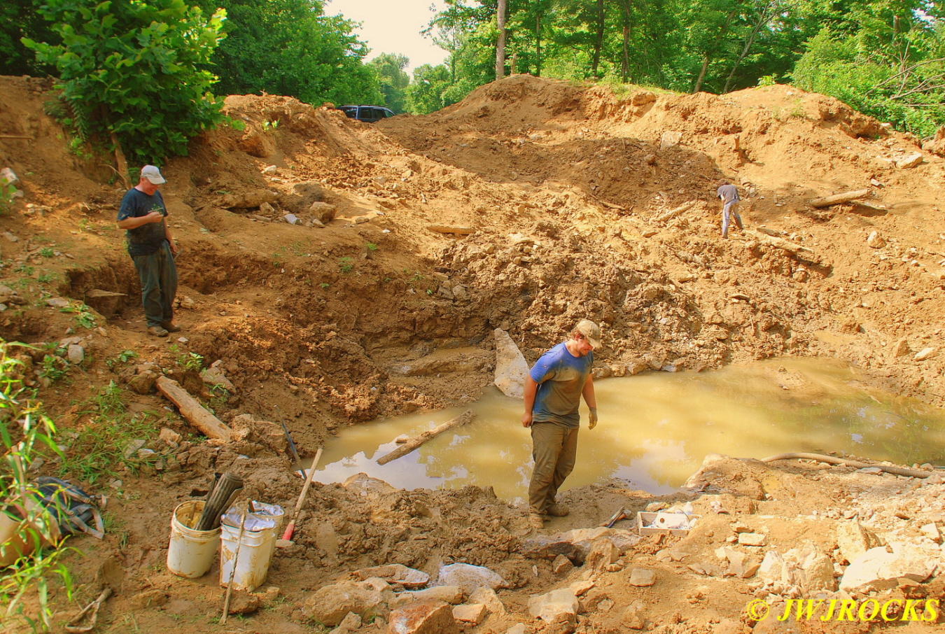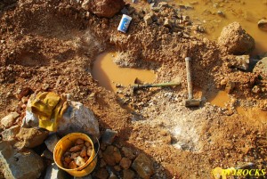 The diggers started showing up about 8 am this time, led off by Chris and his dad David, and Chris started pounding those pockets out once again. Steve and April were going to check out the rock show again, so I did a little exploratory digging down on the saddle where Rex had stopped digging the day before. By the time they arrived about mid morning, I had pulled a few more clusters out of the side pockets that Rex had found on Saturday and let April take over and work it. Steve decided to work across the water pond from us and dig out the side vein going to the right, and April`s mom can be seen up the bank behind Steve….