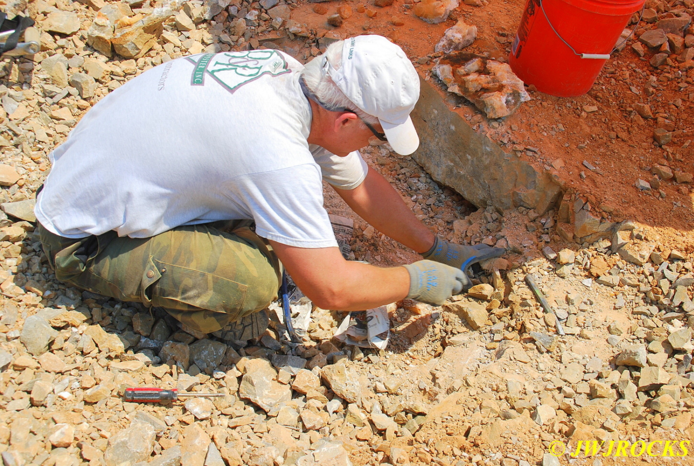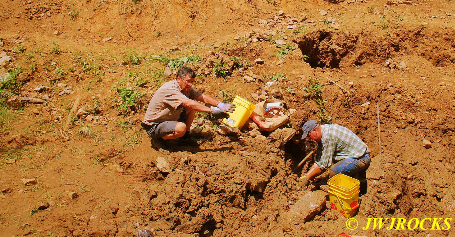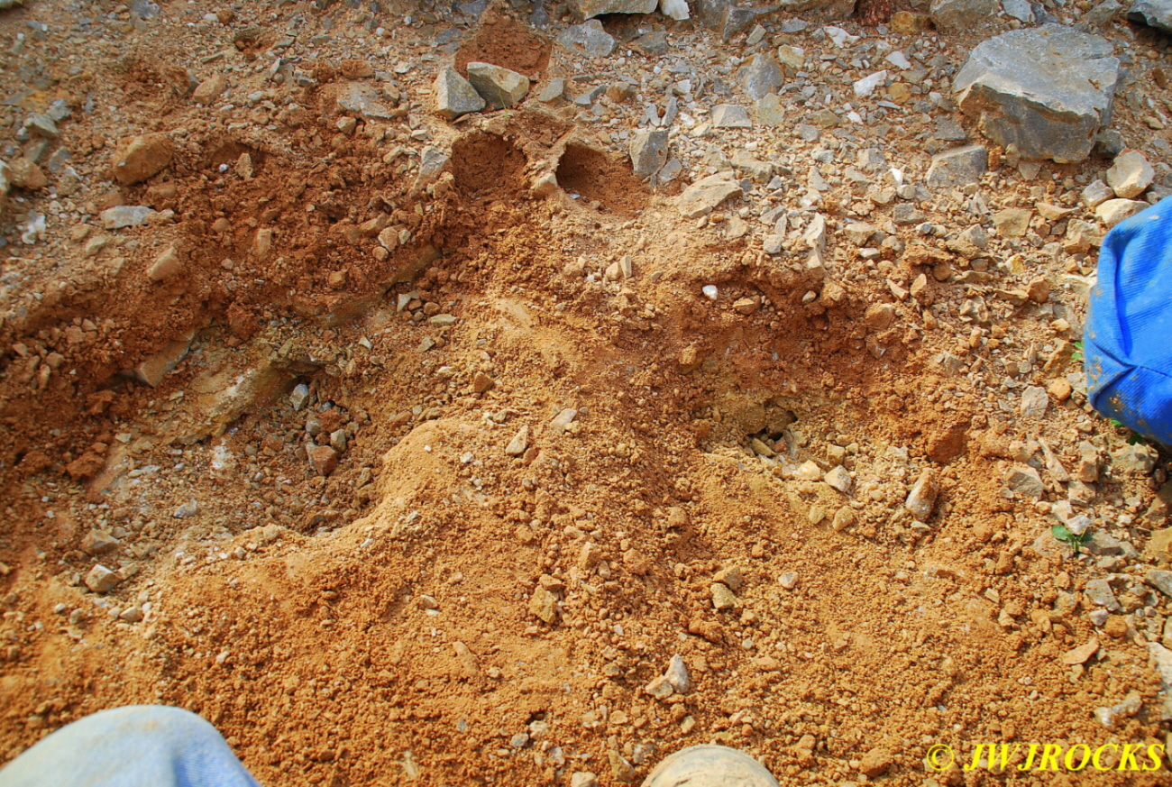 …but let me tell you, the attention quickly shifted Saturday mid morning to his dad David, who was continuing to work the corner next to him, especially when David hit a pocket of calcite dogtooth crystals on some plates. Here is the first small plate that he found up behind this huge boulder that required both him and Chris to muscle out of the way….