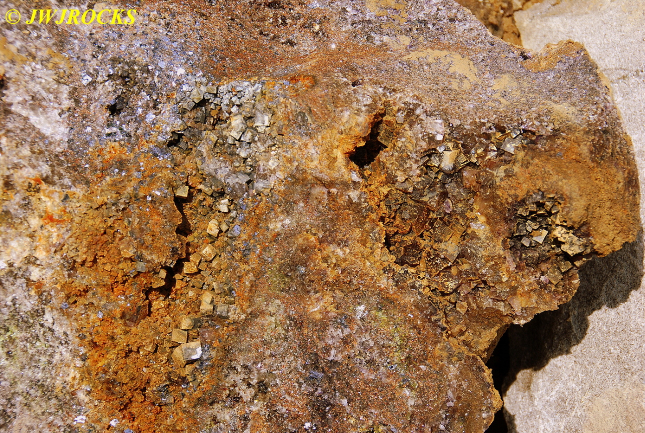 …the one I took home has four pockets of fluorite cubes, one pocket of galena cubes and fluorite cubes, and there is greenockite all the way across it….