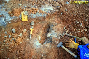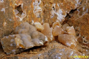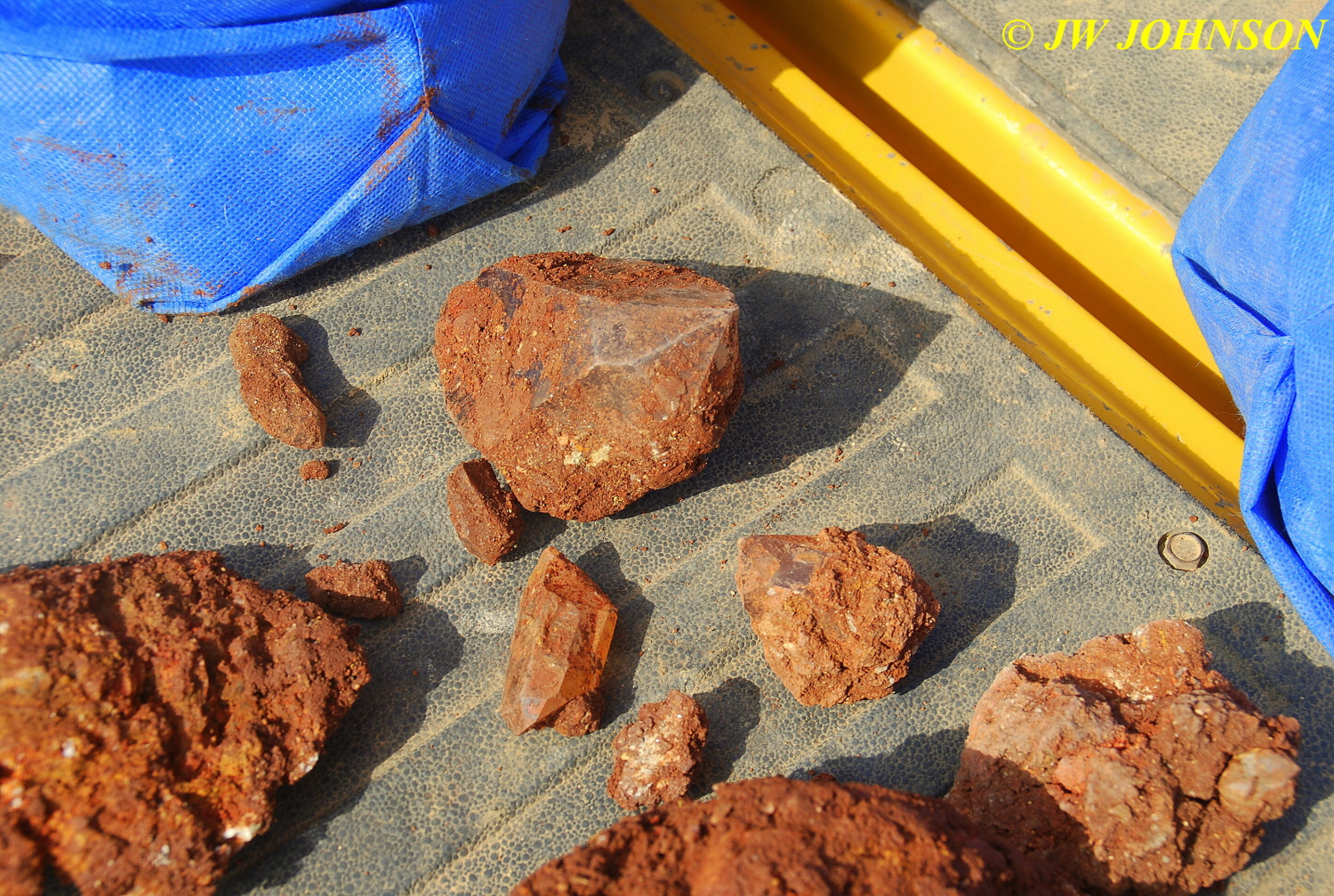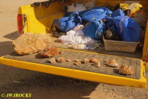 …after digging a few hours here… we started wrapping things up and on the way back to the trucks, Ray discovered a place where someone had recently excavated an entire sandstone shelf, apparently finding quite a few crystals of all sizes, yet breaking several in the process of removing them from the host rock. We were able to find a few in their highgrade pile as well as a few singles just sticking out from the host wall, to take home with us.