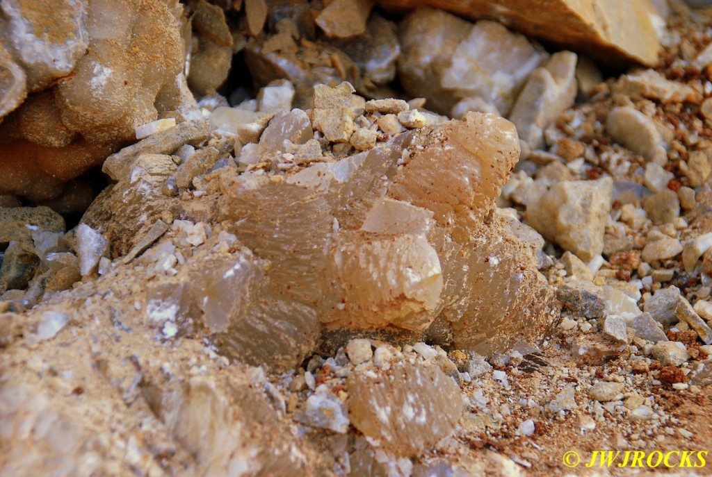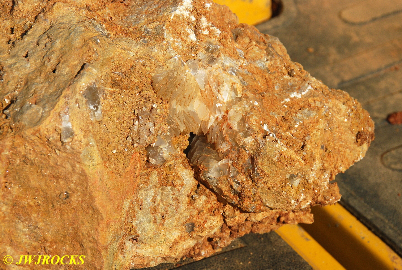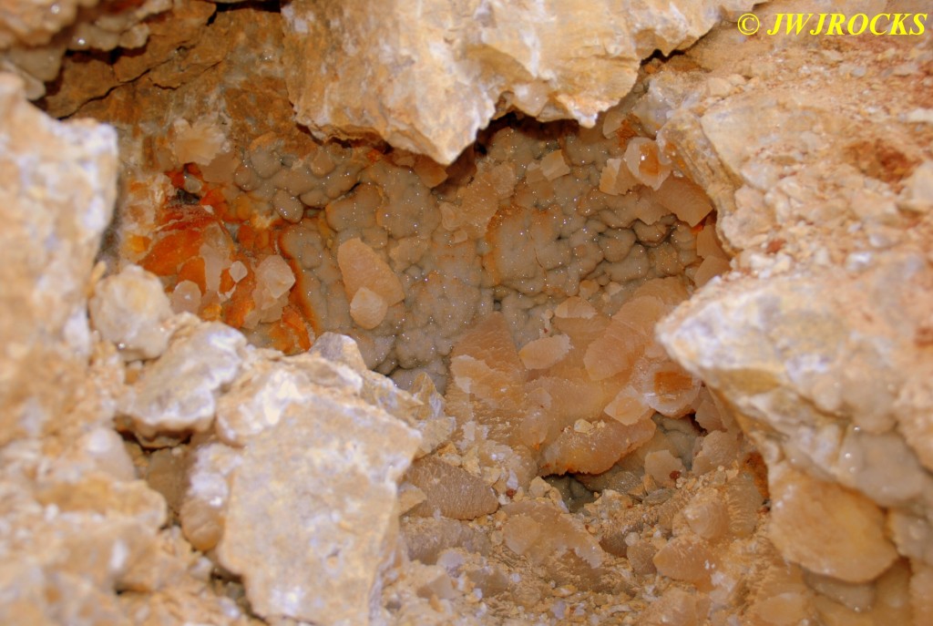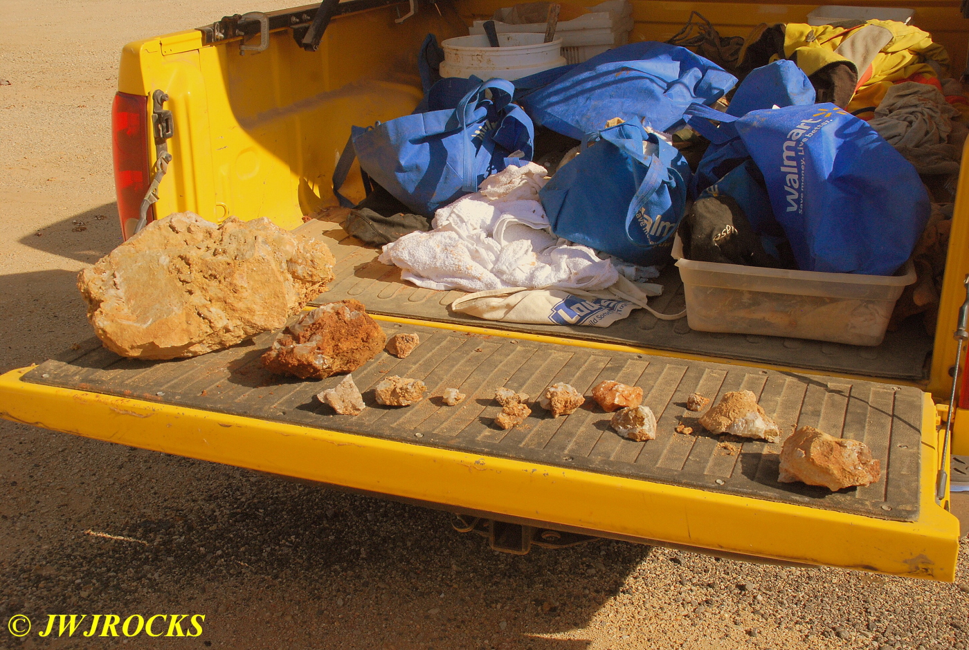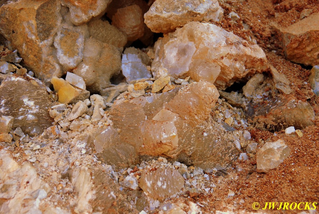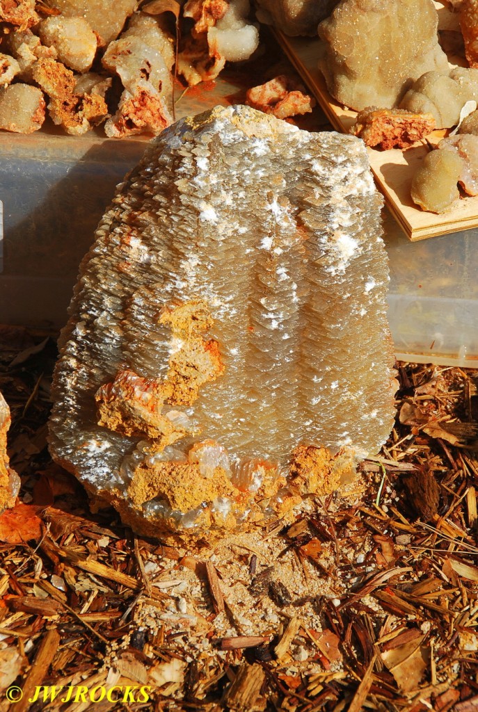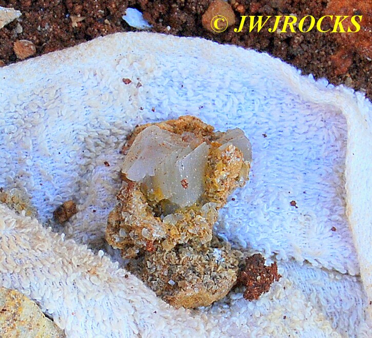 And now for the rest of the story on the history of this mine, told to me by several sources down there….several years ago, Ocus sold his remaining lease on the mine to Jimmy Coleman, who took his digging equipment up there and dug down into the sandstone and dirt…. discovering a huge crystal cavern, with large crystals in single points, doubles, and clusters with VERY BIG crystals attached to the walls and the ceiling…they removed as many as they could and took them to the Tucson show, where he made a huge profit selling them. The story I was told…by two different people who dont know each other but know that area well…was that while removing those crystal clusters, a hole opened up in the back wall behind that cluster… they took a flashlight and looked inside…. saw a cavern even bigger and deeper than the one they were standing in, also loaded with crystals and clusters, some of them looking like they would fit on a pallet just fine. They covered the opening to the original cavern with plywood and dirt…. and made plans to return to excavate the second cavern, but alas, the Forest Service refused to allow Jimmy back in nor honor the remaining time left on his lease. After hearing what he had paid the Forest Service for that lease, I can well understand why many people have no respect for our Forest Service any longer. Things like this can leave a bad taste in your mouth.