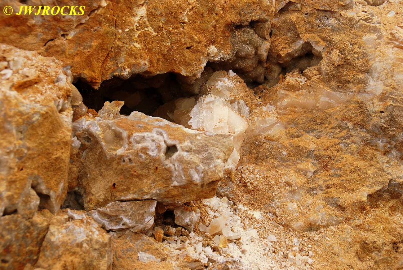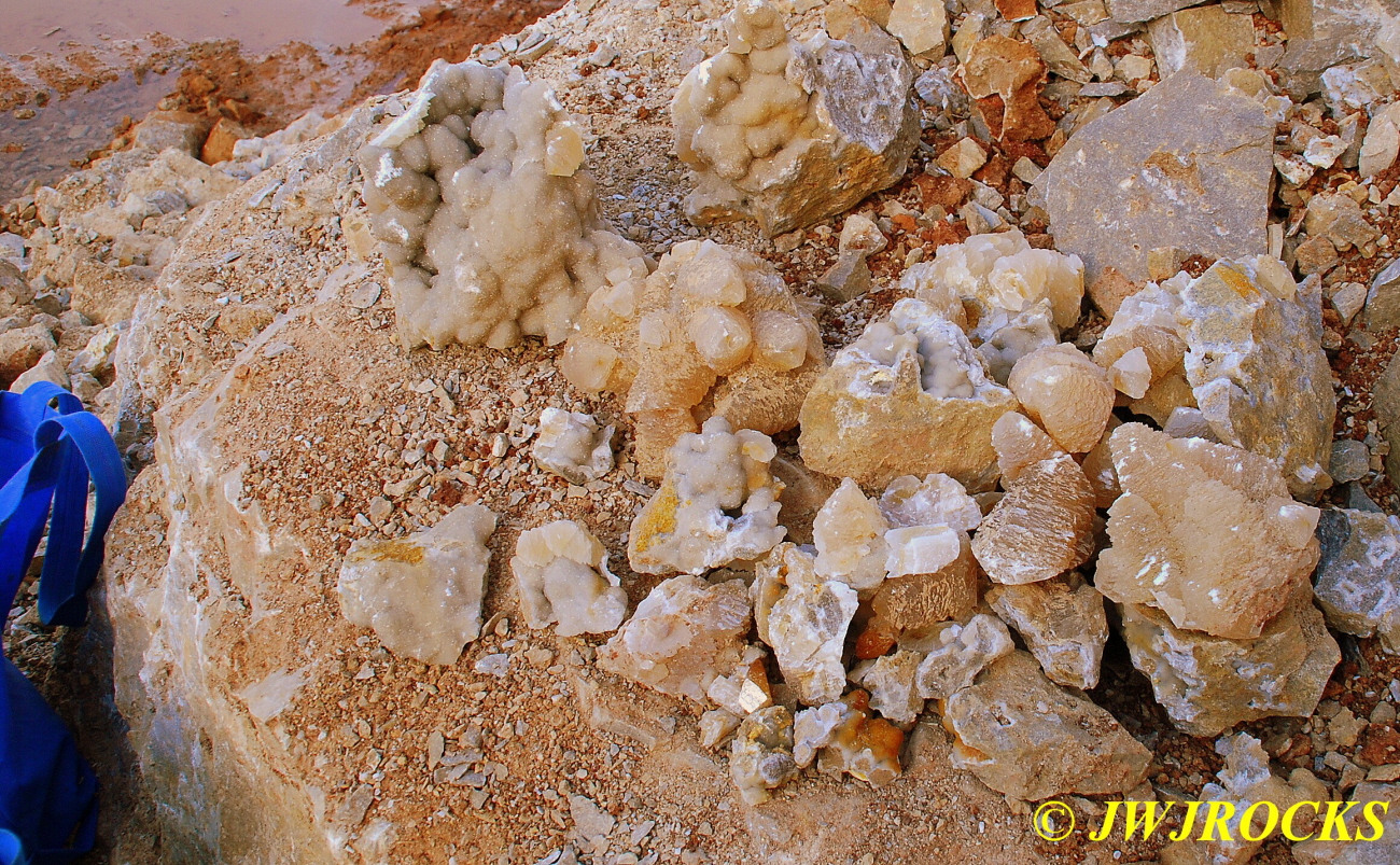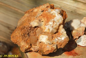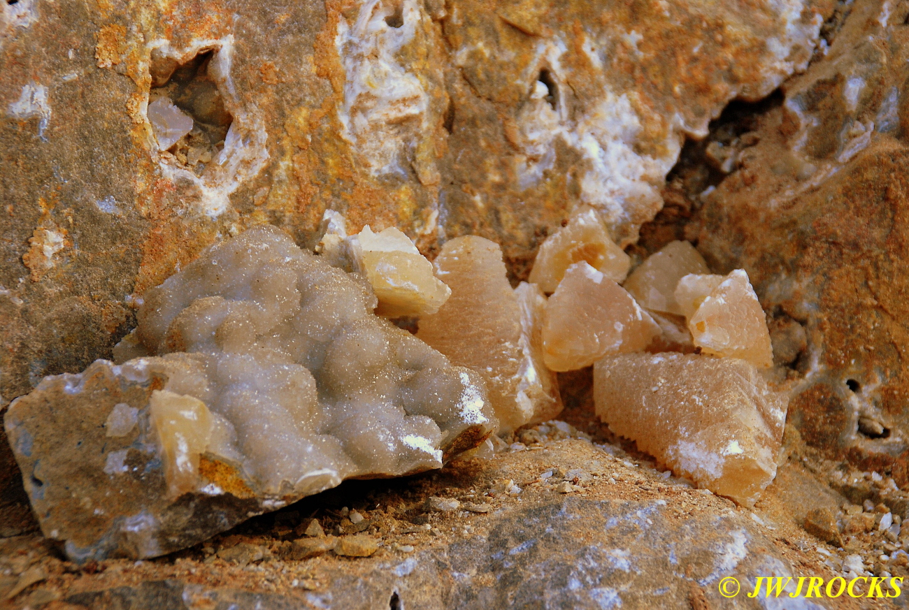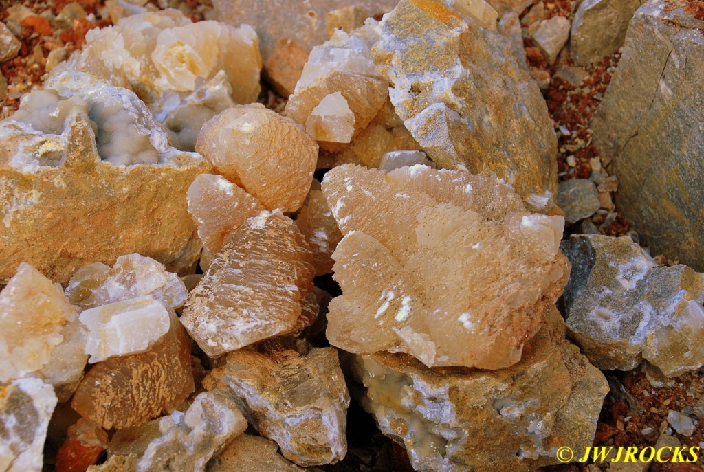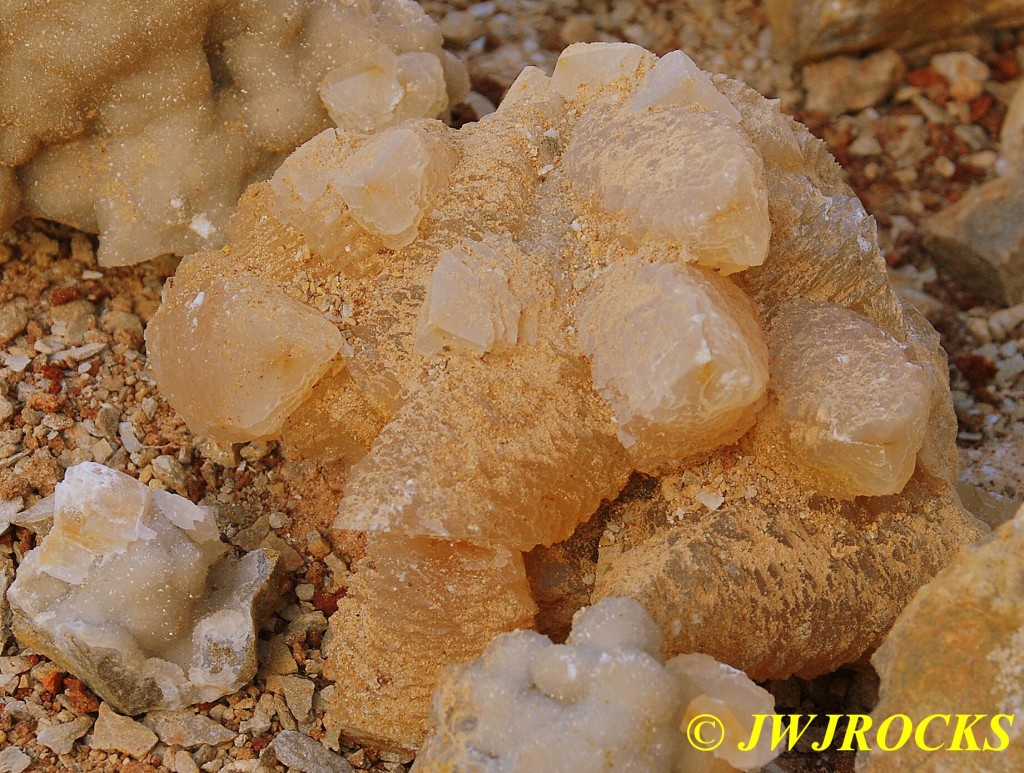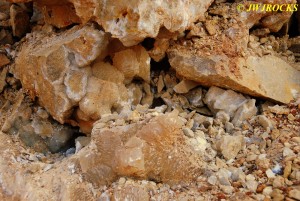 And now for the rest of the story on the history of this mine, told to me by several sources down there….several years ago, Ocus sold his remaining lease on the mine to Jimmy Coleman, who took his digging equipment up there and dug down into the sandstone and dirt…. discovering a huge crystal cavern, with large crystals in single points, doubles, and clusters with VERY BIG crystals attached to the walls and the ceiling…they removed as many as they could and took them to the Tucson show, where he made a huge profit selling them. The story I was told…by two different people who dont know each other but know that area well…was that while removing those crystal clusters, a hole opened up in the back wall behind that cluster… they took a flashlight and looked inside…. saw a cavern even bigger and deeper than the one they were standing in, also loaded with crystals and clusters, some of them looking like they would fit on a pallet just fine. They covered the opening to the original cavern with plywood and dirt…. and made plans to return to excavate the second cavern, but alas, the Forest Service refused to allow Jimmy back in nor honor the remaining time left on his lease. After hearing what he had paid the Forest Service for that lease, I can well understand why many people have no respect for our Forest Service any longer. Things like this can leave a bad taste in your mouth.