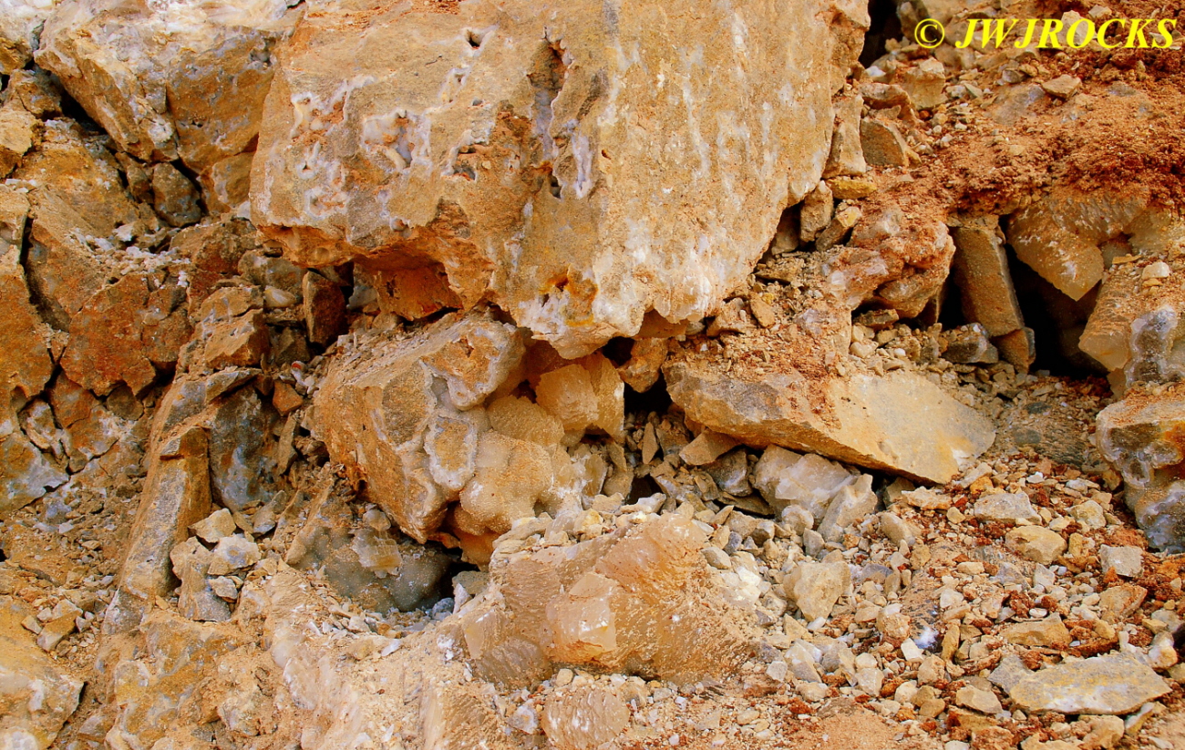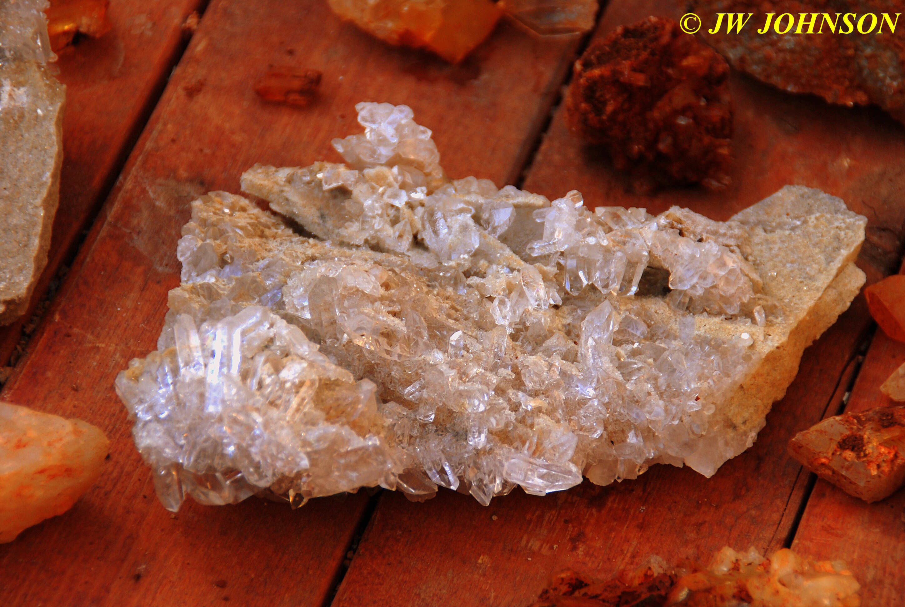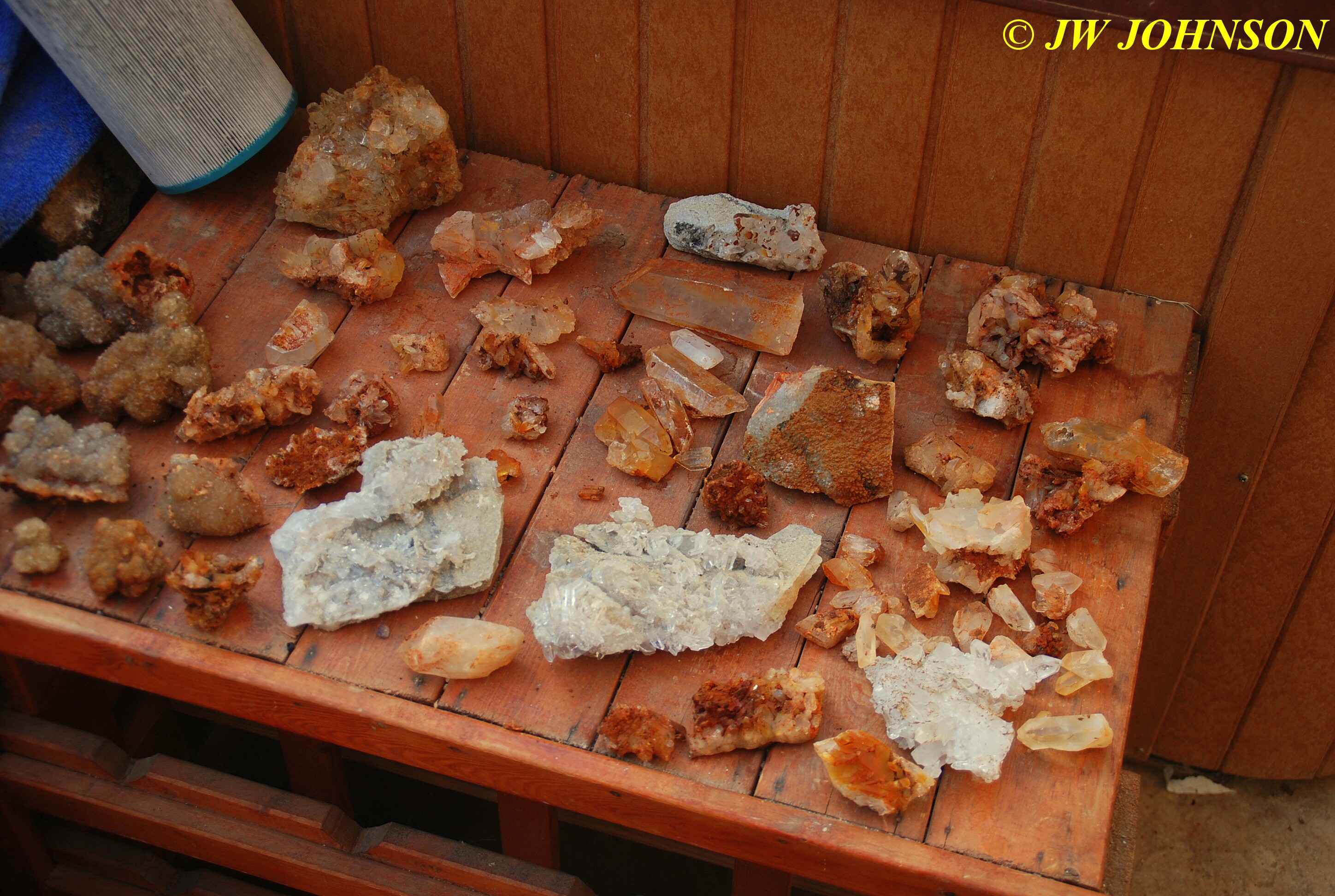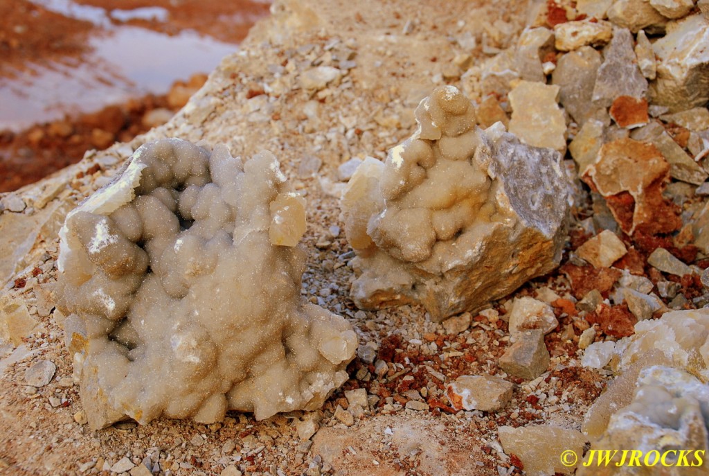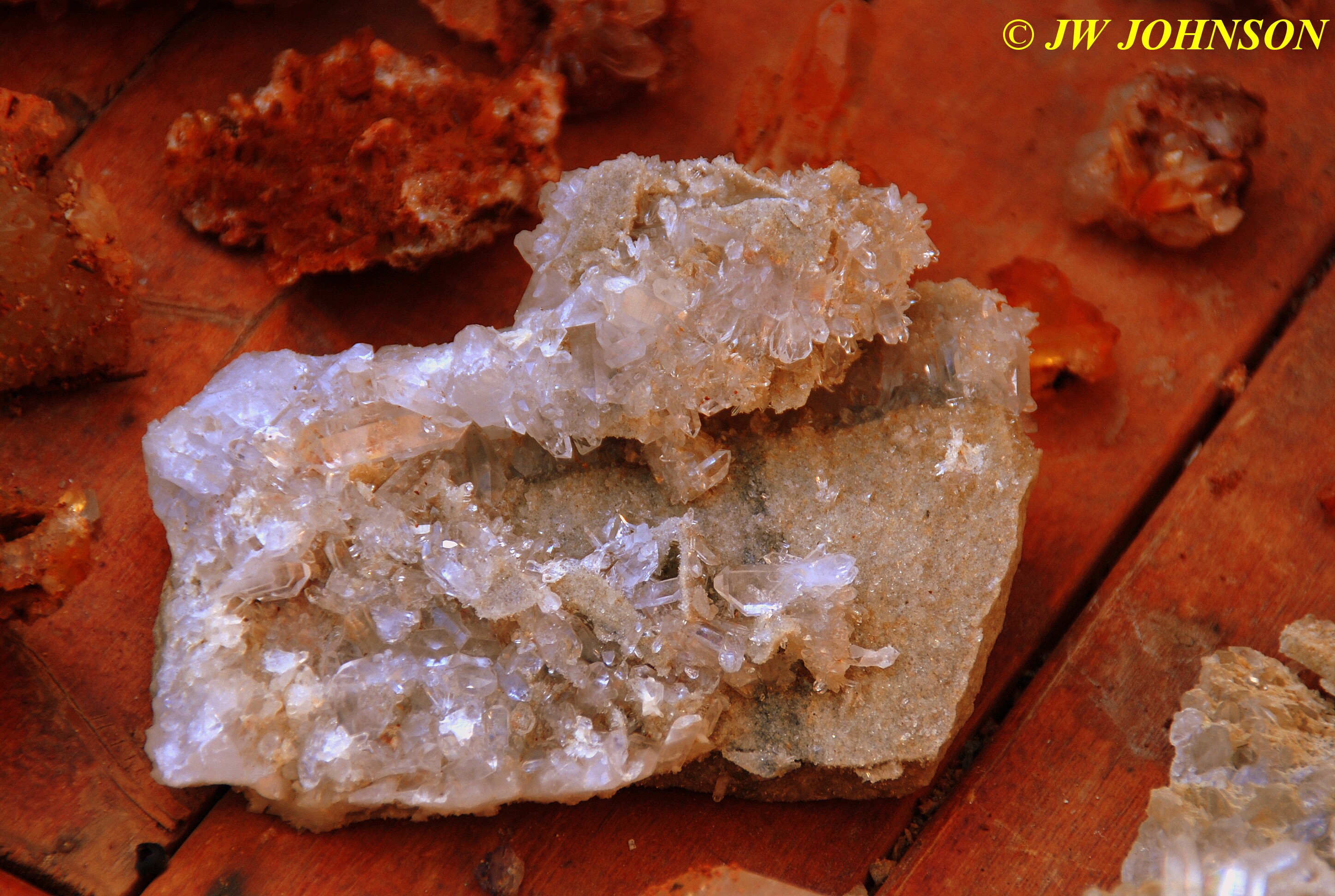 And now for the rest of the story on the history of this mine, told to me by several sources down there….several years ago, Ocus sold his remaining lease on the mine to Jimmy Coleman, who took his digging equipment up there and dug down into the sandstone and dirt…. discovering a huge crystal cavern, with large crystals in single points, doubles, and clusters with VERY BIG crystals attached to the walls and the ceiling…they removed as many as they could and took them to the Tucson show, where he made a huge profit selling them. The story I was told…by two different people who dont know each other but know that area well…was that while removing those crystal clusters, a hole opened up in the back wall behind that cluster… they took a flashlight and looked inside…. saw a cavern even bigger and deeper than the one they were standing in, also loaded with crystals and clusters, some of them looking like they would fit on a pallet just fine. They covered the opening to the original cavern with plywood and dirt…. and made plans to return to excavate the second cavern, but alas, the Forest Service refused to allow Jimmy back in nor honor the remaining time left on his lease. After hearing what he had paid the Forest Service for that lease, I can well understand why many people have no respect for our Forest Service any longer. Things like this can leave a bad taste in your mouth.