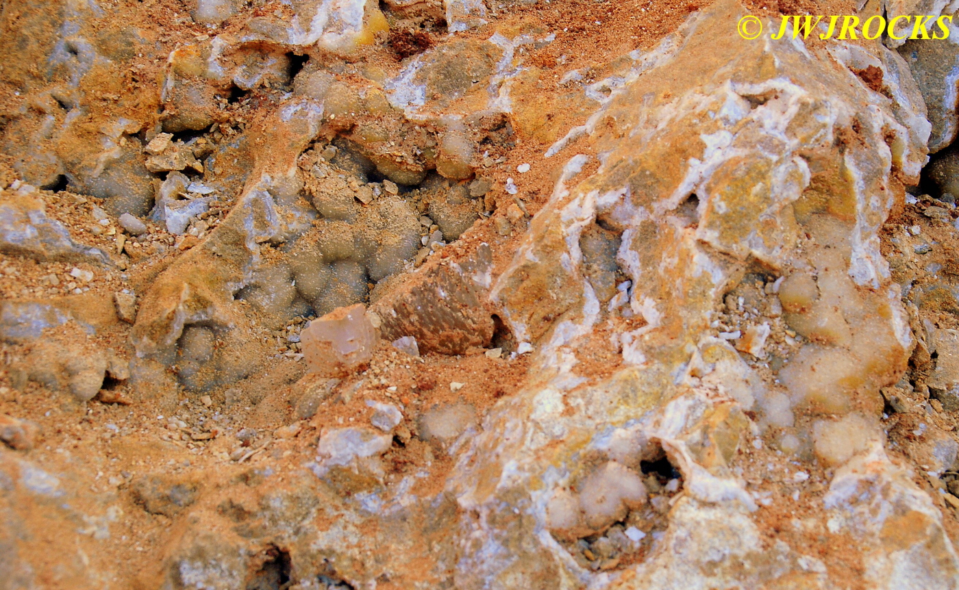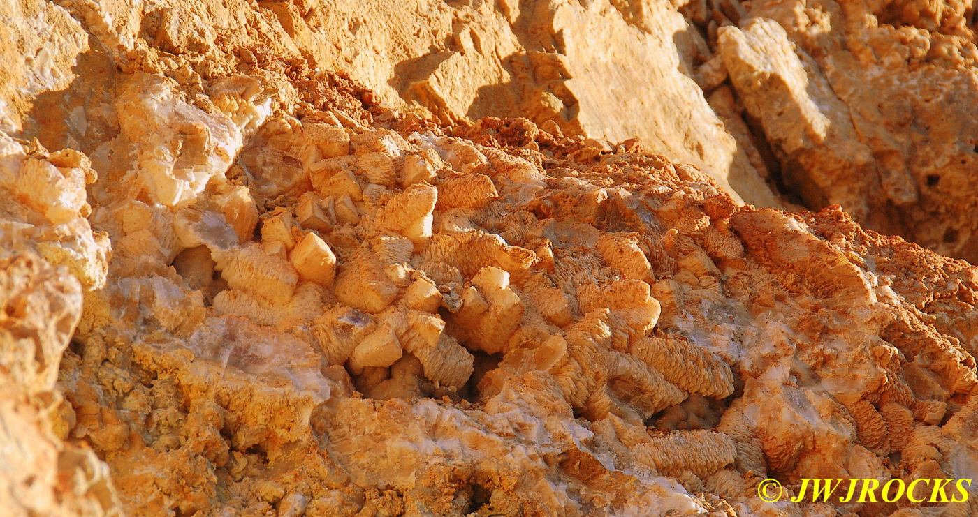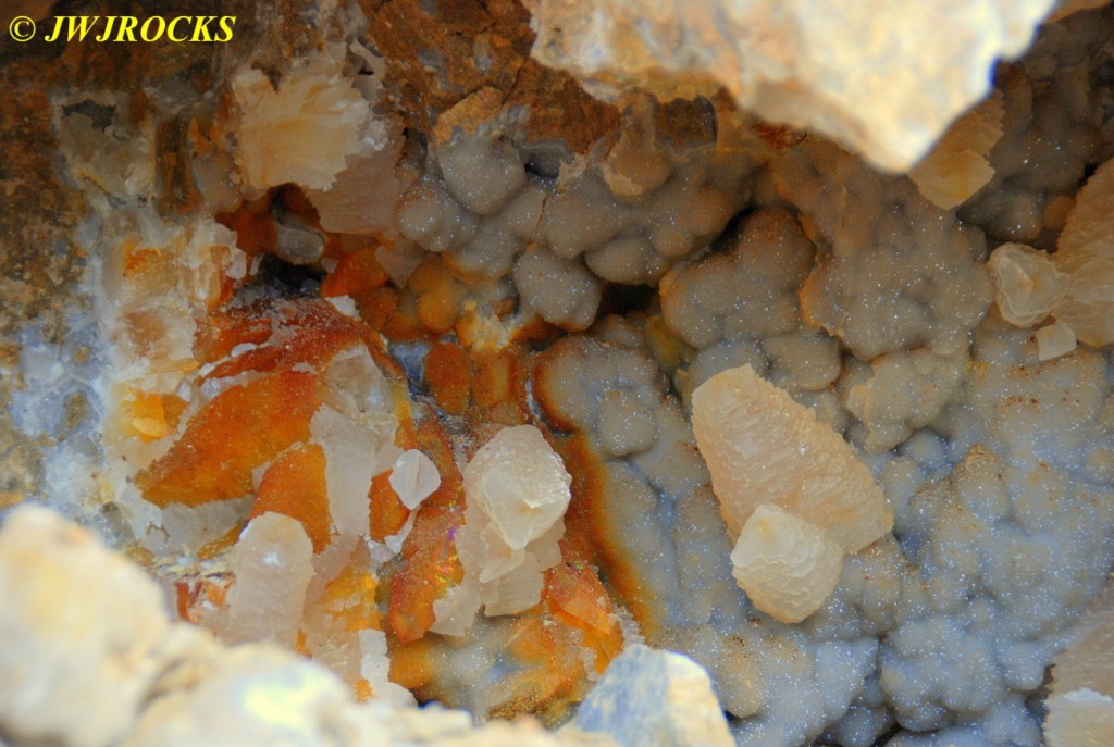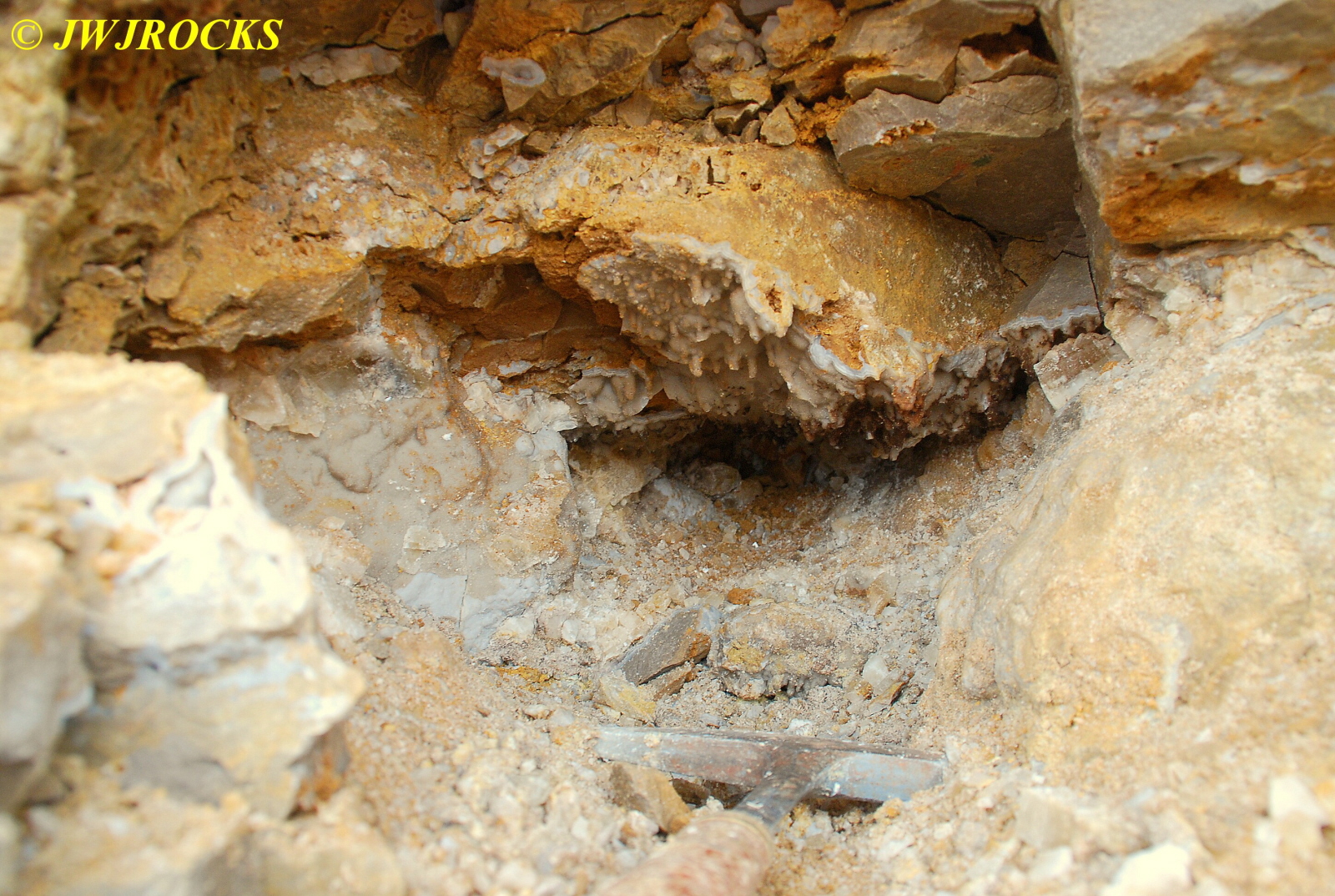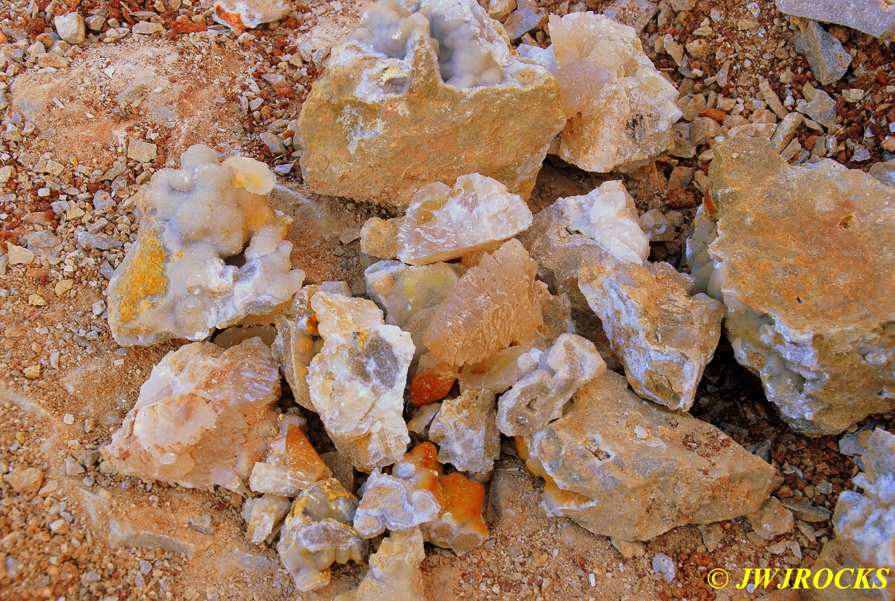 And now for the rest of the story on the history of this mine, told to me by several sources down there….several years ago, Ocus sold his remaining lease on the mine to Jimmy Coleman, who took his digging equipment up there and dug down into the sandstone and dirt…. discovering a huge crystal cavern, with large crystals in single points, doubles, and clusters with VERY BIG crystals attached to the walls and the ceiling…they removed as many as they could and took them to the Tucson show, where he made a huge profit selling them. The story I was told…by two different people who dont know each other but know that area well…was that while removing those crystal clusters, a hole opened up in the back wall behind that cluster… they took a flashlight and looked inside…. saw a cavern even bigger and deeper than the one they were standing in, also loaded with crystals and clusters, some of them looking like they would fit on a pallet just fine. They covered the opening to the original cavern with plywood and dirt…. and made plans to return to excavate the second cavern, but alas, the Forest Service refused to allow Jimmy back in nor honor the remaining time left on his lease. After hearing what he had paid the Forest Service for that lease, I can well understand why many people have no respect for our Forest Service any longer. Things like this can leave a bad taste in your mouth.