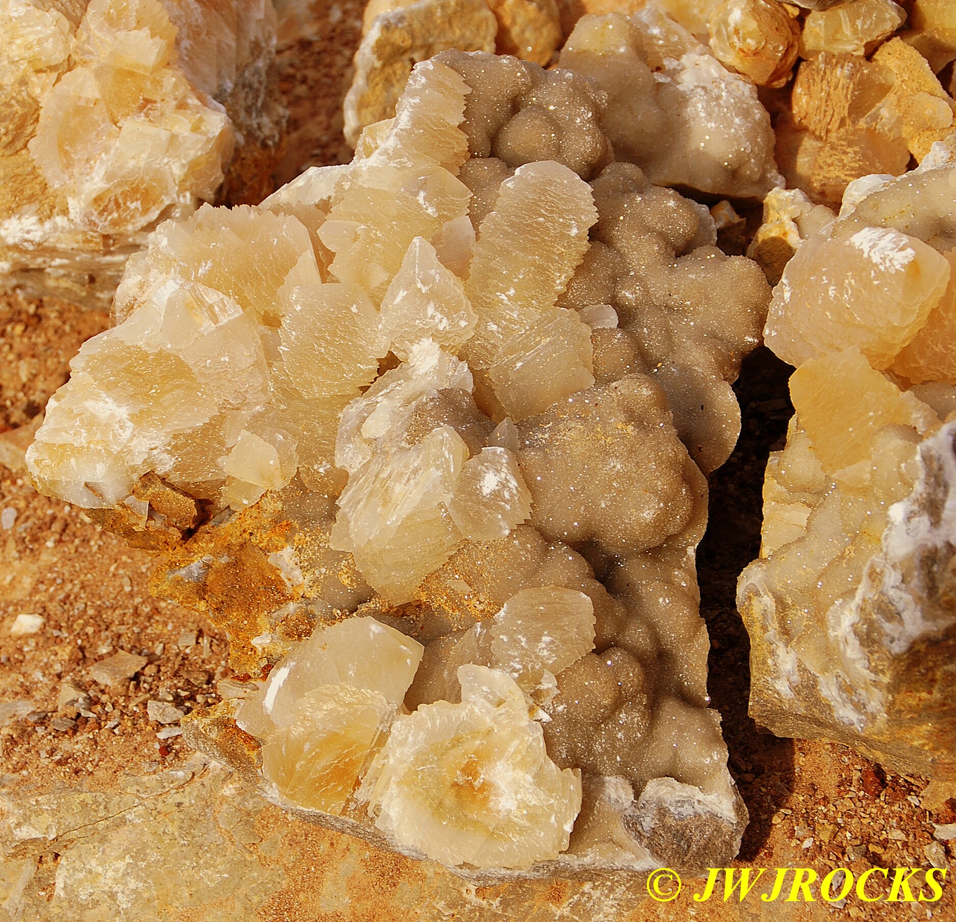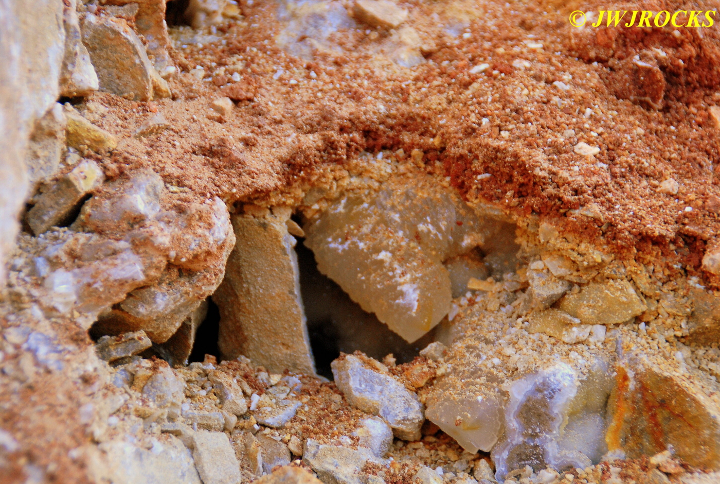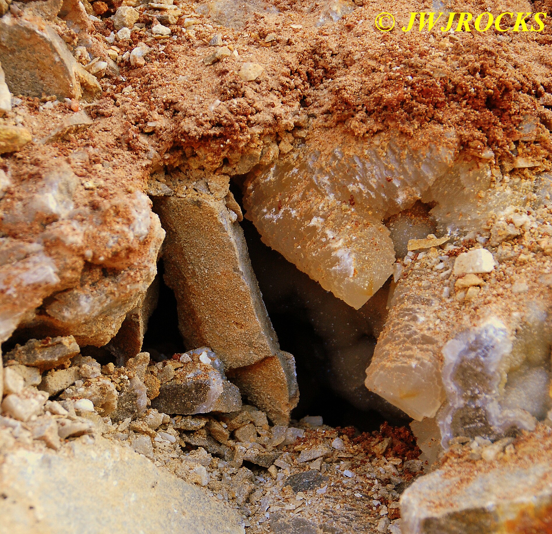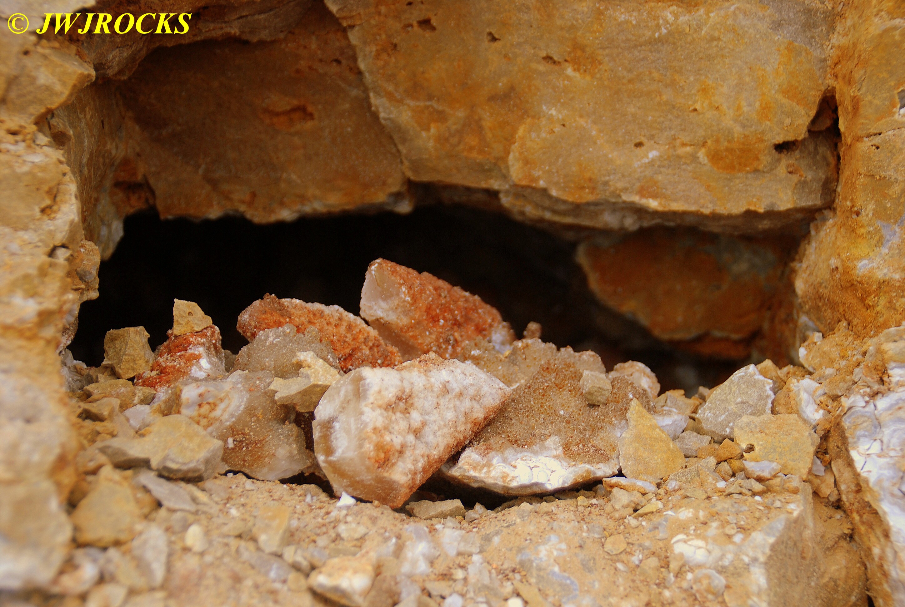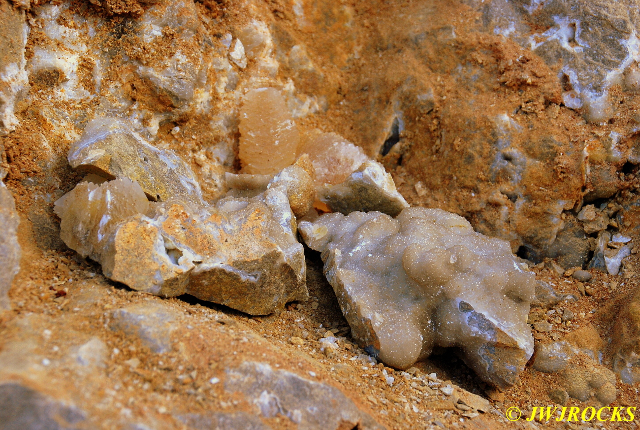 And now for the rest of the story on the history of this mine, told to me by several sources down there….several years ago, Ocus sold his remaining lease on the mine to Jimmy Coleman, who took his digging equipment up there and dug down into the sandstone and dirt…. discovering a huge crystal cavern, with large crystals in single points, doubles, and clusters with VERY BIG crystals attached to the walls and the ceiling…they removed as many as they could and took them to the Tucson show, where he made a huge profit selling them. The story I was told…by two different people who dont know each other but know that area well…was that while removing those crystal clusters, a hole opened up in the back wall behind that cluster… they took a flashlight and looked inside…. saw a cavern even bigger and deeper than the one they were standing in, also loaded with crystals and clusters, some of them looking like they would fit on a pallet just fine. They covered the opening to the original cavern with plywood and dirt…. and made plans to return to excavate the second cavern, but alas, the Forest Service refused to allow Jimmy back in nor honor the remaining time left on his lease. After hearing what he had paid the Forest Service for that lease, I can well understand why many people have no respect for our Forest Service any longer. Things like this can leave a bad taste in your mouth.