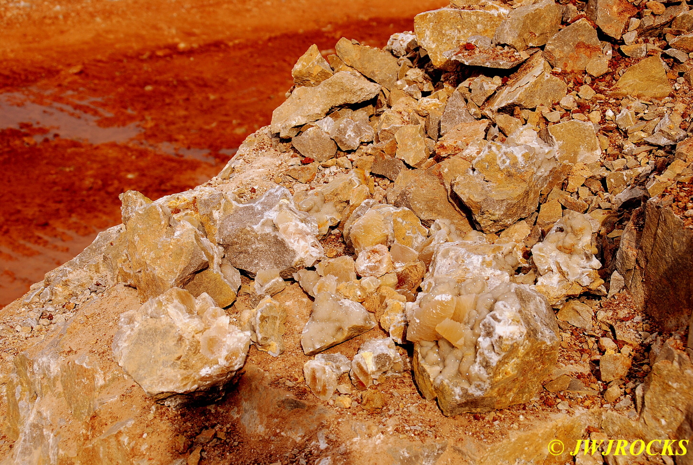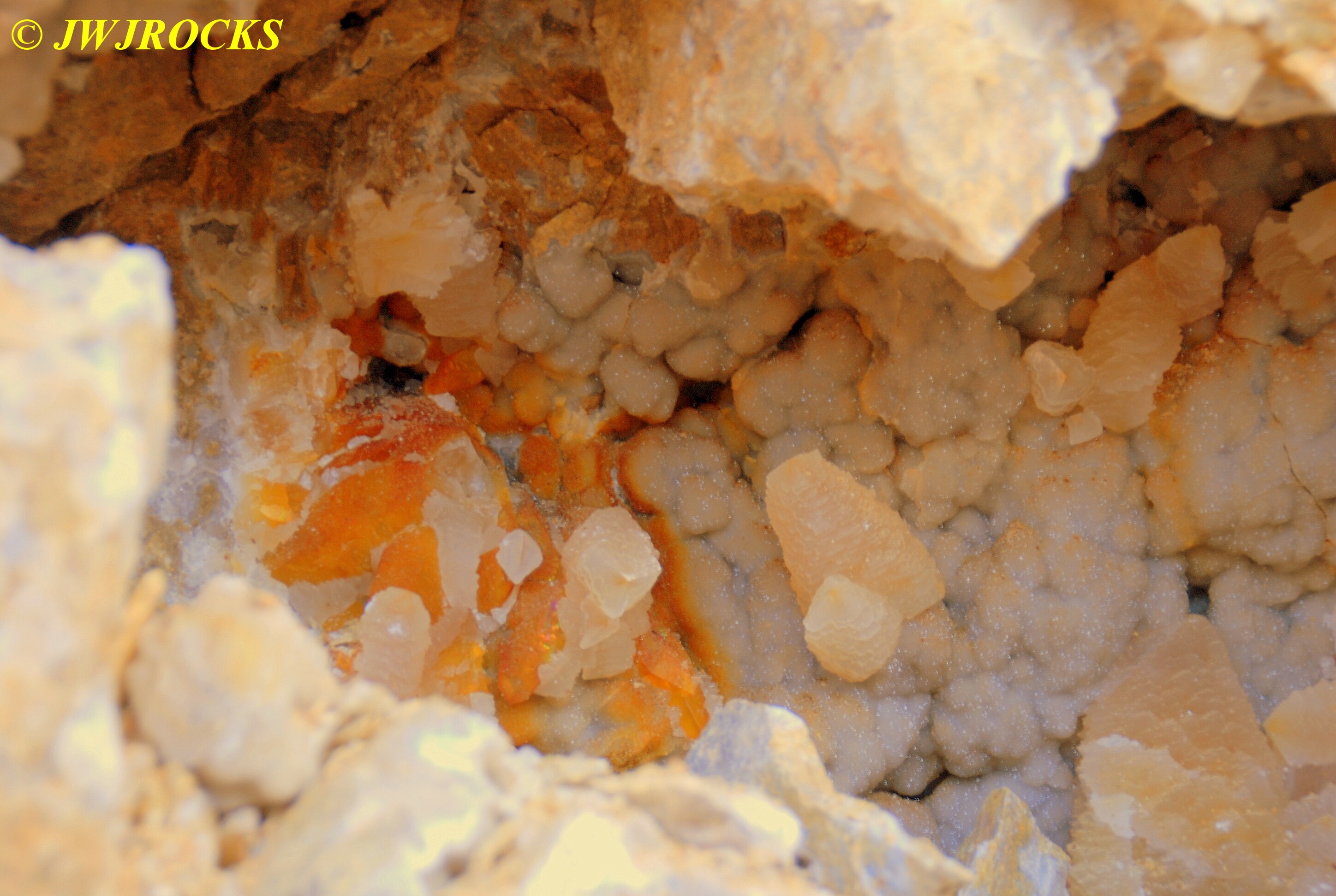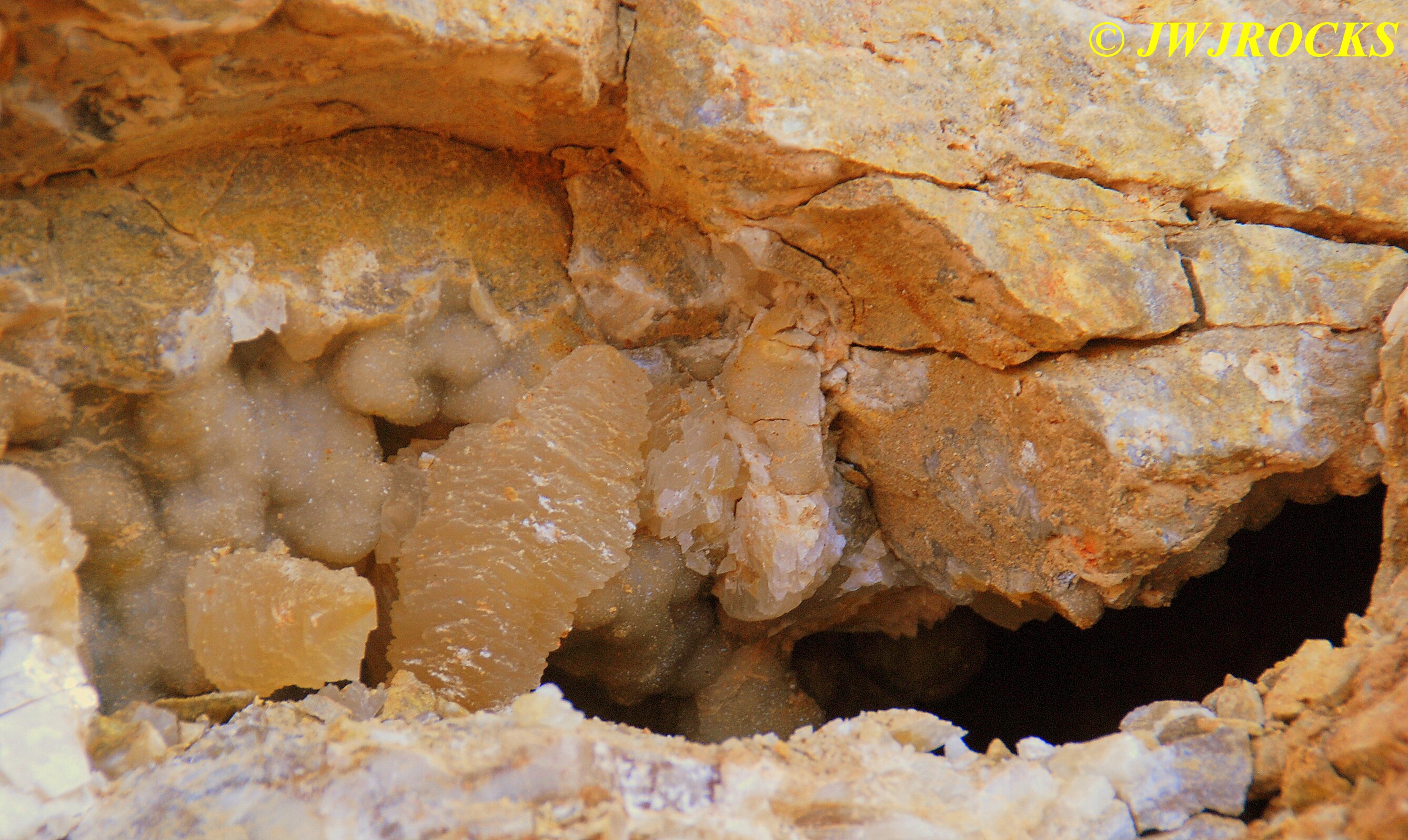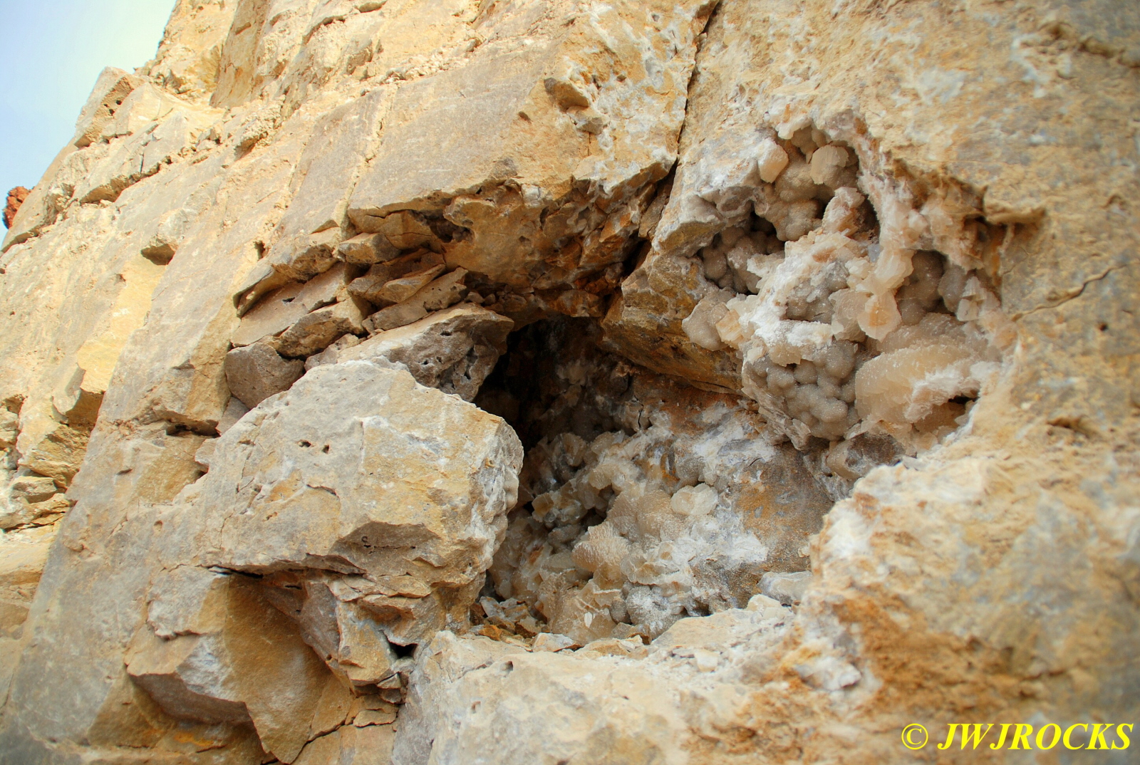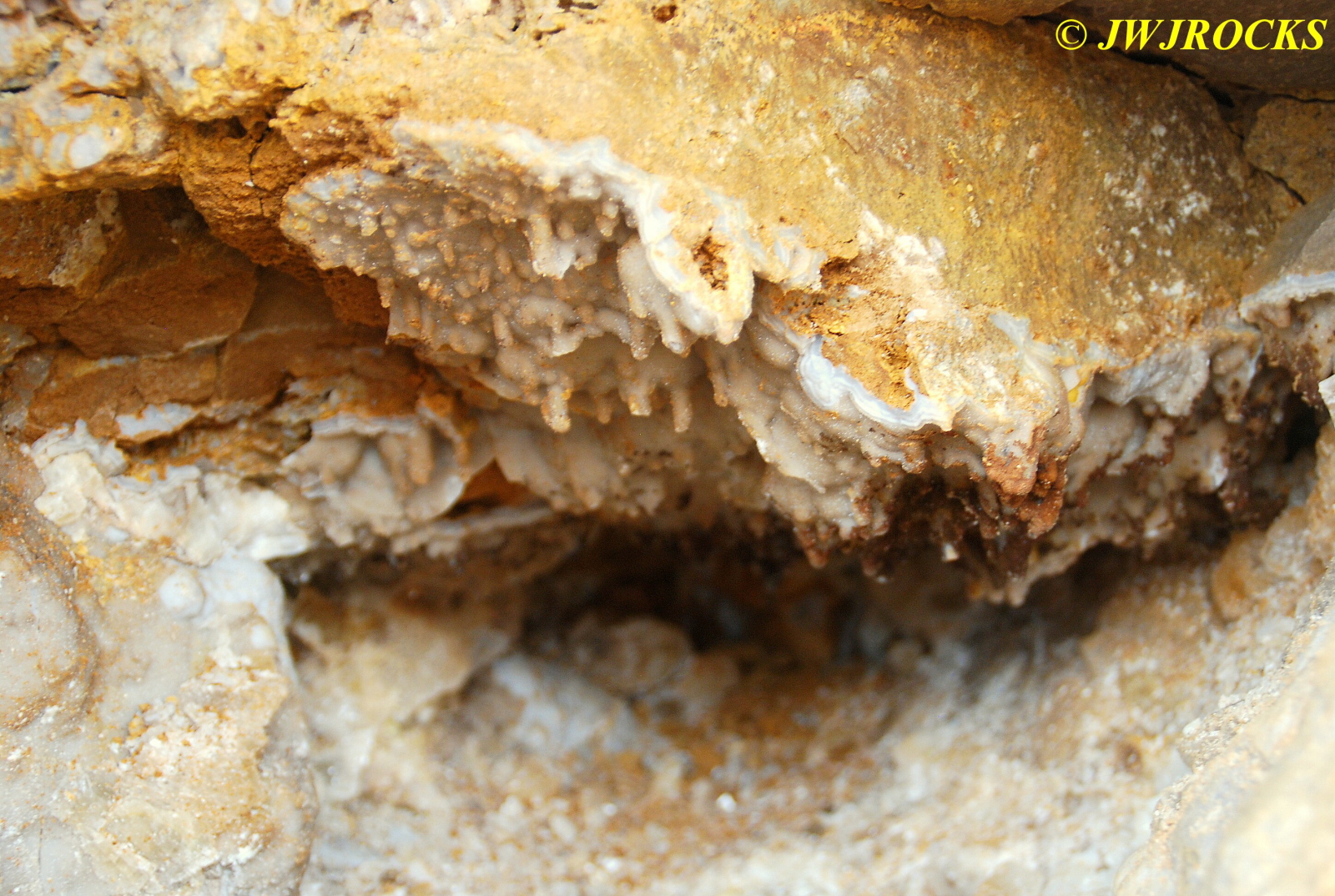 And now for the rest of the story on the history of this mine, told to me by several sources down there….several years ago, Ocus sold his remaining lease on the mine to Jimmy Coleman, who took his digging equipment up there and dug down into the sandstone and dirt…. discovering a huge crystal cavern, with large crystals in single points, doubles, and clusters with VERY BIG crystals attached to the walls and the ceiling…they removed as many as they could and took them to the Tucson show, where he made a huge profit selling them. The story I was told…by two different people who dont know each other but know that area well…was that while removing those crystal clusters, a hole opened up in the back wall behind that cluster… they took a flashlight and looked inside…. saw a cavern even bigger and deeper than the one they were standing in, also loaded with crystals and clusters, some of them looking like they would fit on a pallet just fine. They covered the opening to the original cavern with plywood and dirt…. and made plans to return to excavate the second cavern, but alas, the Forest Service refused to allow Jimmy back in nor honor the remaining time left on his lease. After hearing what he had paid the Forest Service for that lease, I can well understand why many people have no respect for our Forest Service any longer. Things like this can leave a bad taste in your mouth.