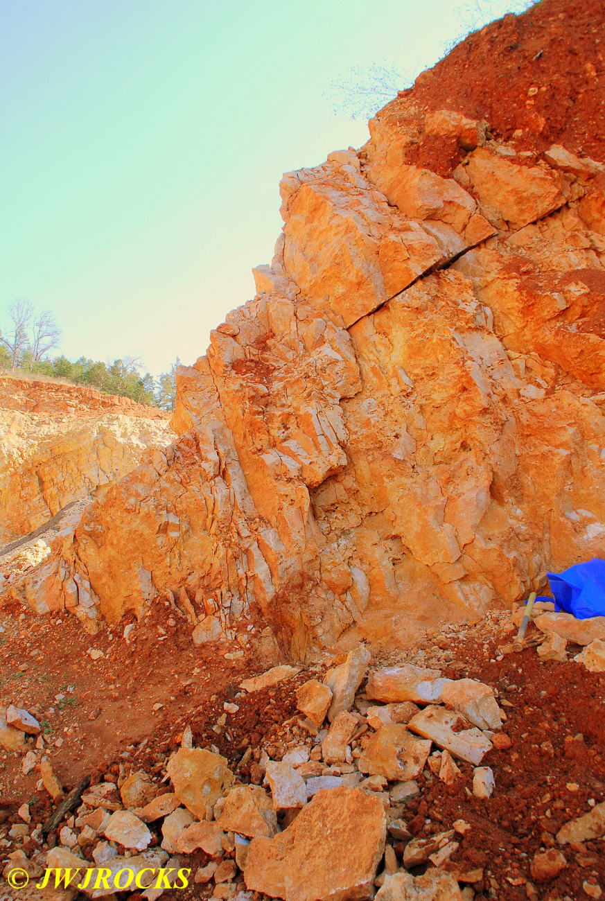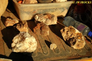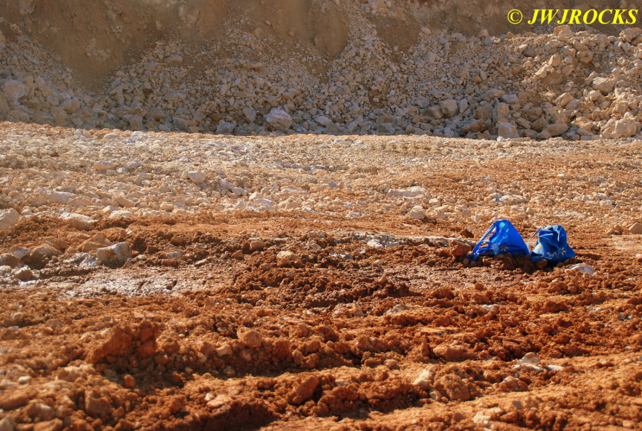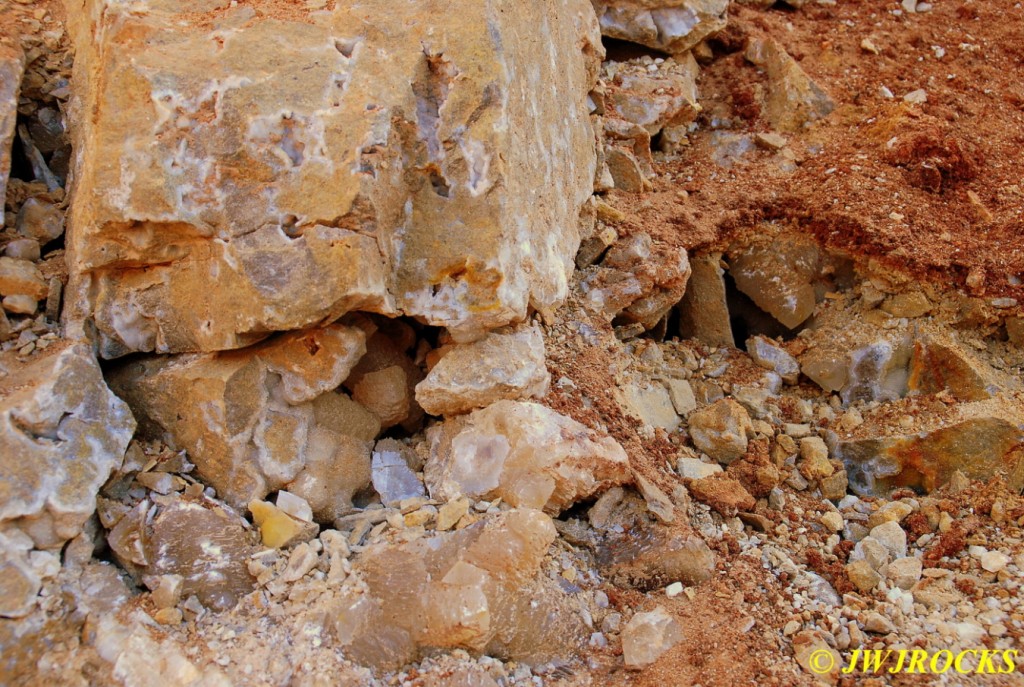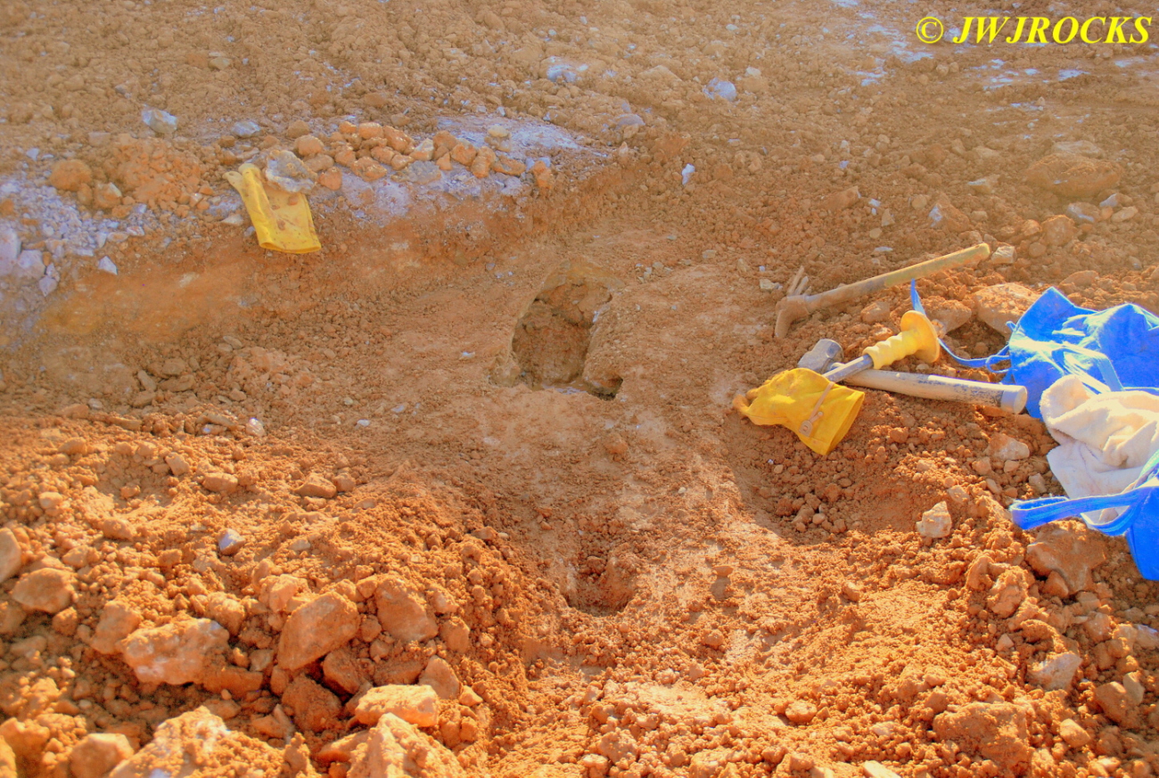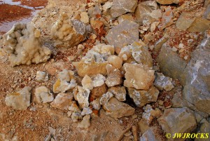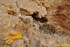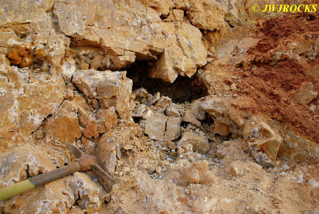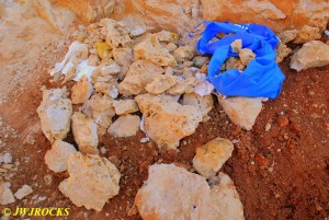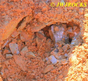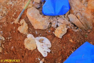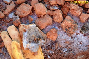 We walked down to the east end and only found more rock down there, no easy digging, so we returned to the main area and began looking for some potential areas to dig into……we met up with Larry Badger and the rest of his club party there…they had done quite a bit of digging since arriving there at 9 am, but hadnt found much and were preparing to head to a known locality for wavellite.