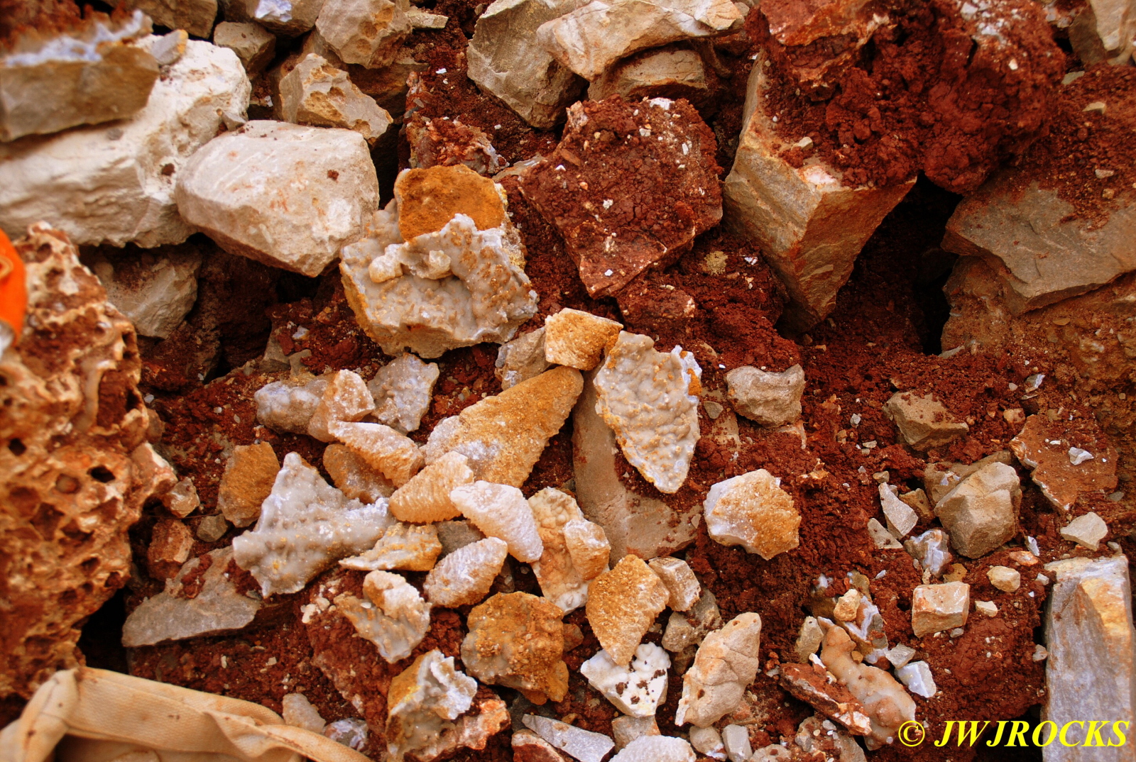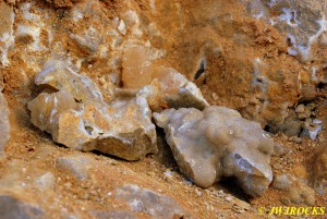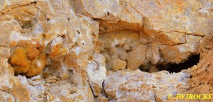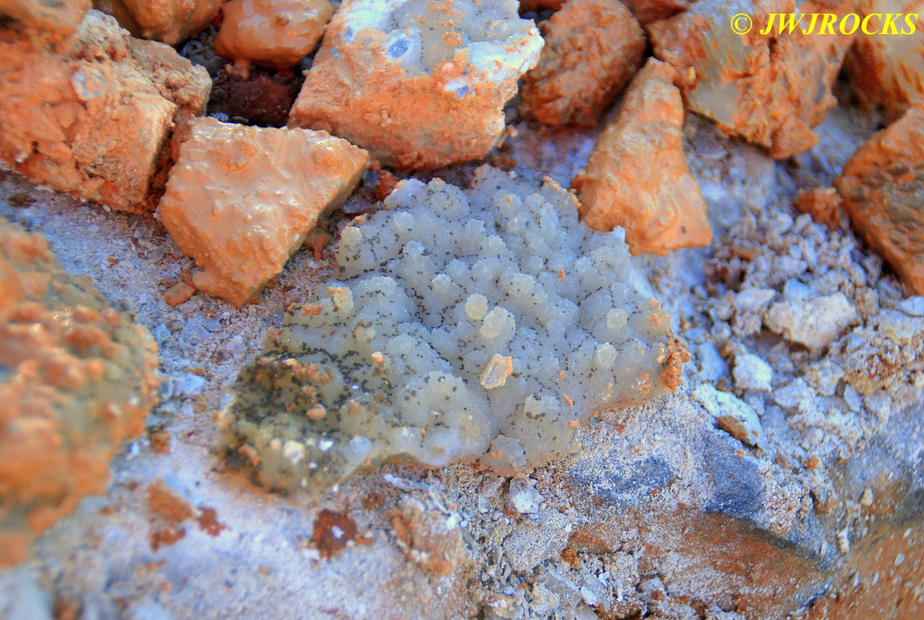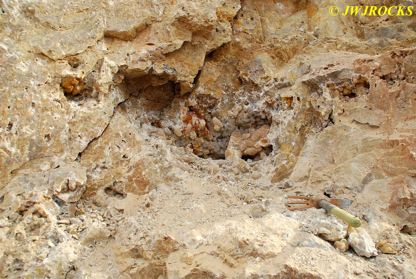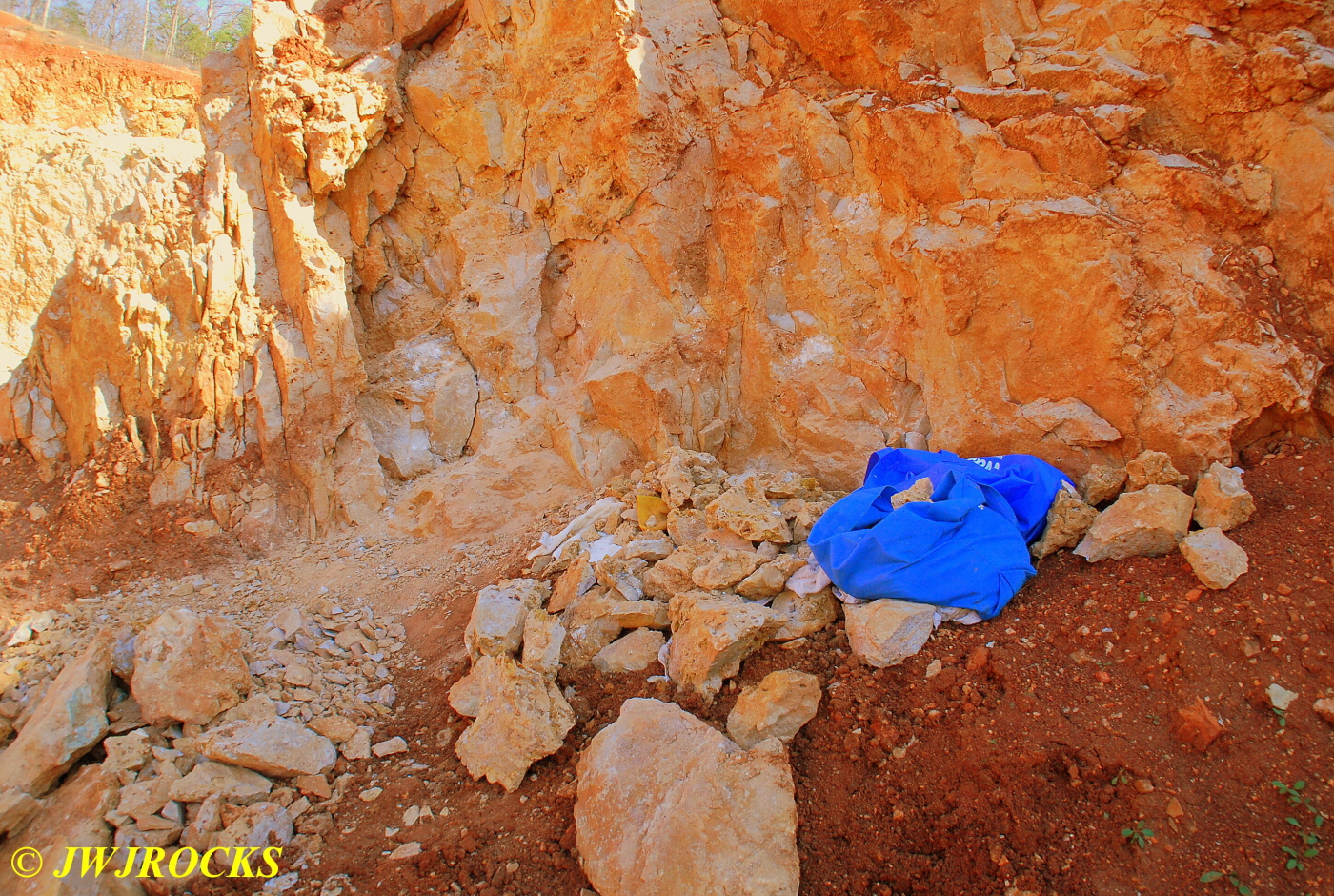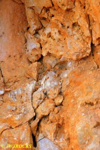 We walked down to the east end and only found more rock down there, no easy digging, so we returned to the main area and began looking for some potential areas to dig into……we met up with Larry Badger and the rest of his club party there…they had done quite a bit of digging since arriving there at 9 am, but hadnt found much and were preparing to head to a known locality for wavellite.