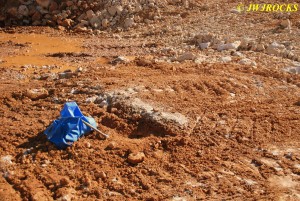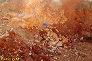 We explained to him that we were interested in getting into a pocket of crystals and he told us that two pockets had been discovered the day before. He took us down to the track hoe and showed us a few boulders that he had dug out the day before that were covered with some nice two and three inch long crystals..they were still covered in clay mud but you could tell they were nice sized. He also pointed out the location of the pockets in the pit below the track hoe, one up above a shelf and the other believed to be below the shelf and under a boulder that weighed a thousand pounds or more. I walked back up the hill to grab my camera and as I did, I looked around on the ground to see if I could spot any crystals laying around…seeing nothing more than alot of generic rock, dirt, and a few damaged crystals here and there occasionally. I have never been to a mine where nothing collectible was laying on the ground…til today.