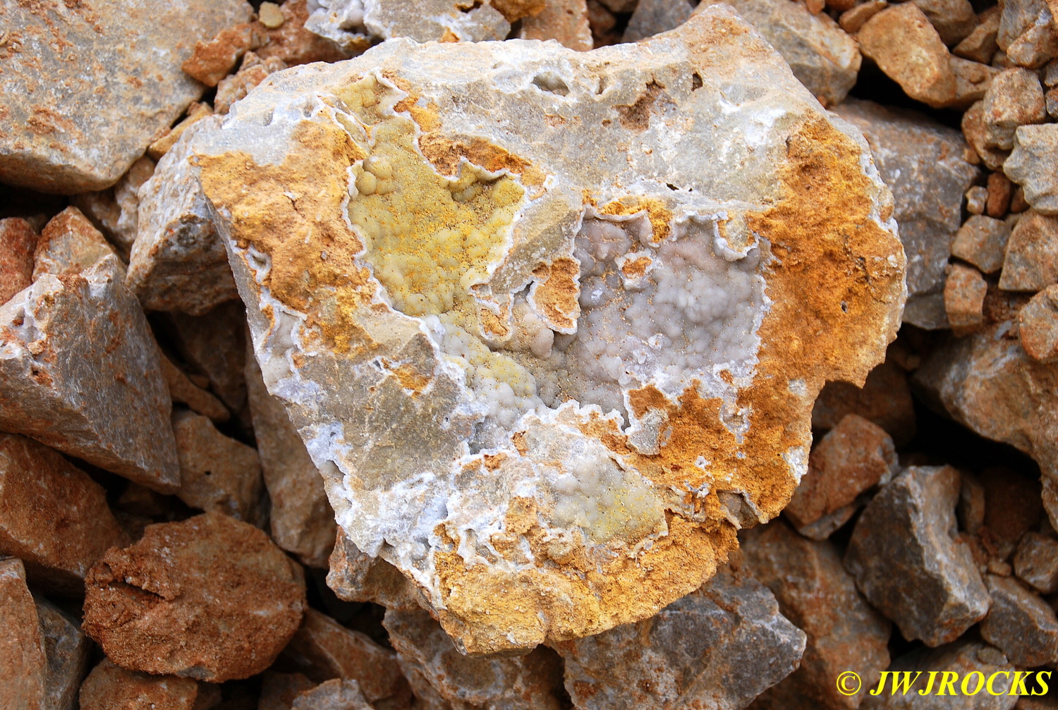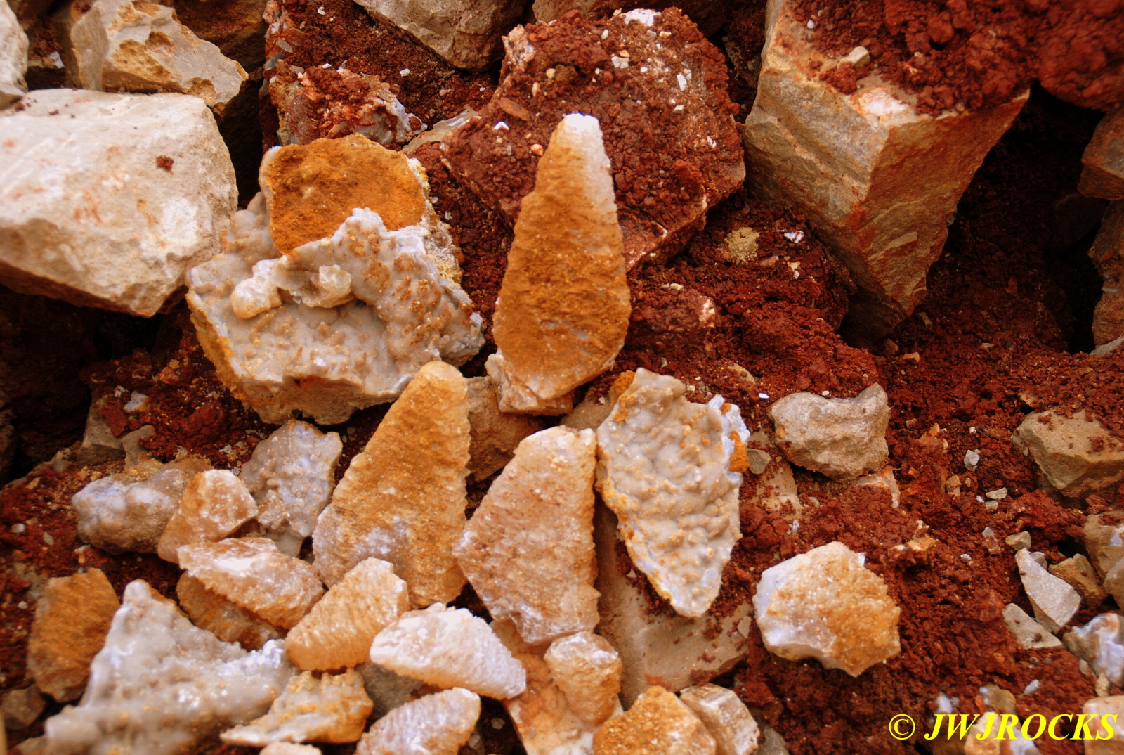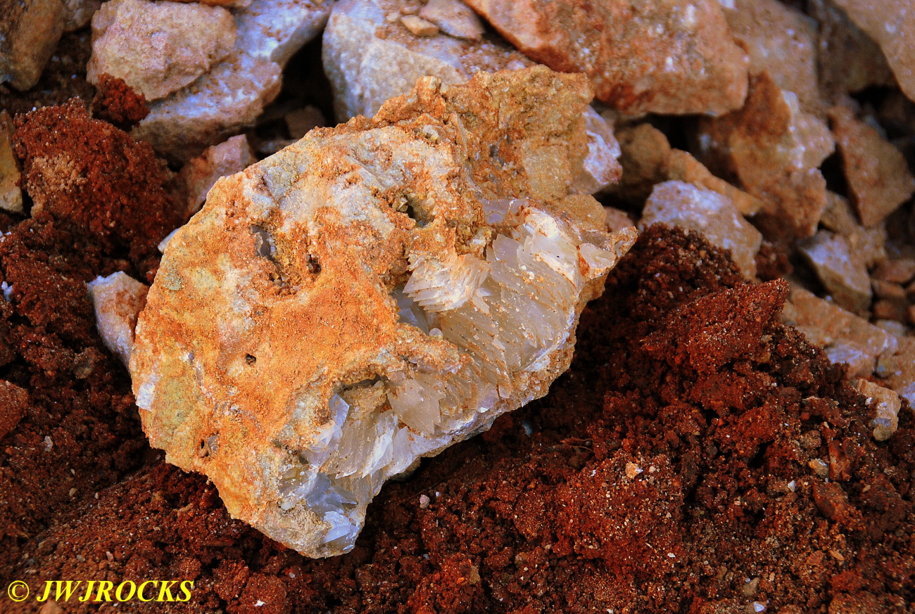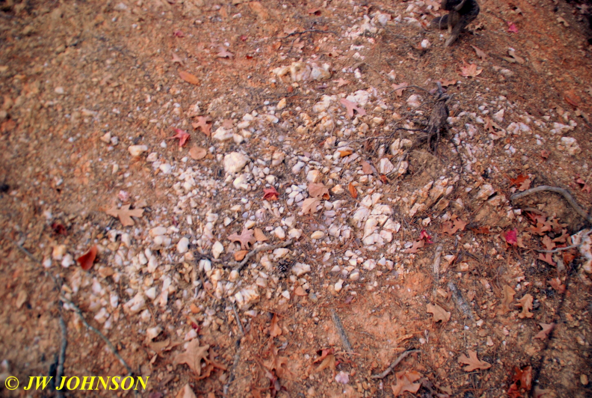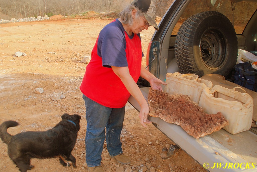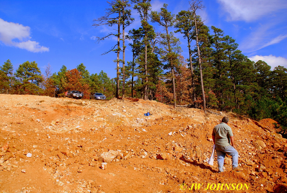…so by this time I am definitely up on the dirt above the piles and working my way to the west, away from the entrance…and by this time we have been joined by another couple, Larry Badger of Kansas City, and his sister, who left there at 5 am and drove straight down to Miller Mtn Mine. Larry told us that he had talked to a country gal named Docia from the Salem, Missouri area and she told him he should drive down in the fall to get some Arkansas quartz…so he took her advice and brought not only his sister with him, but a couple of the Independence Rock and Mineral Club members as well. I told him Docia is one of my best rockhunting friends and we often rockhunt together, but this week is deer season and she cant be pried away from the woods in central Missouri this time of year.