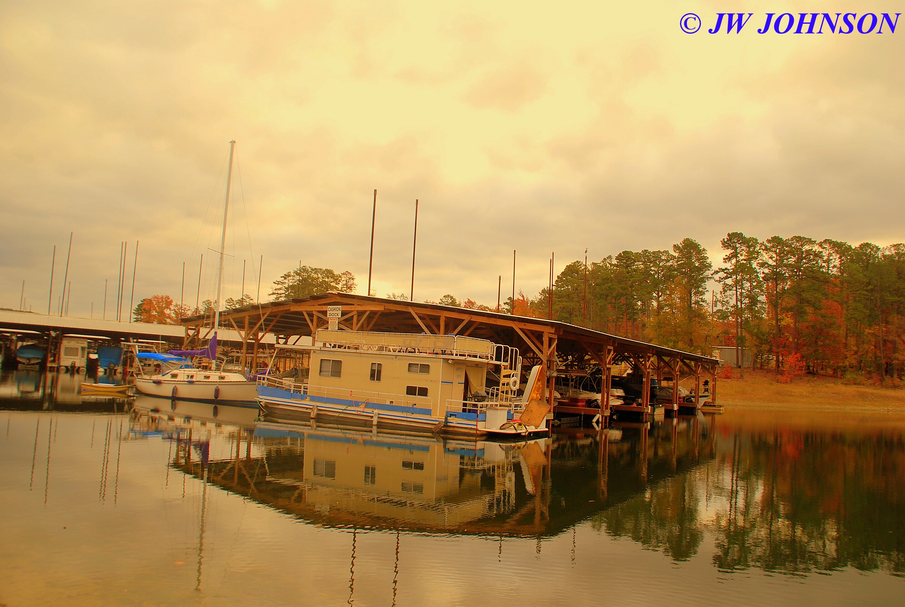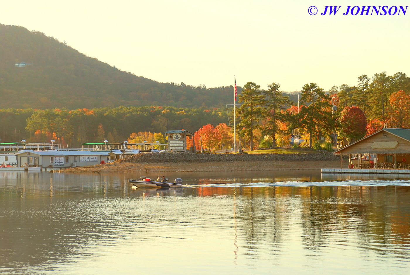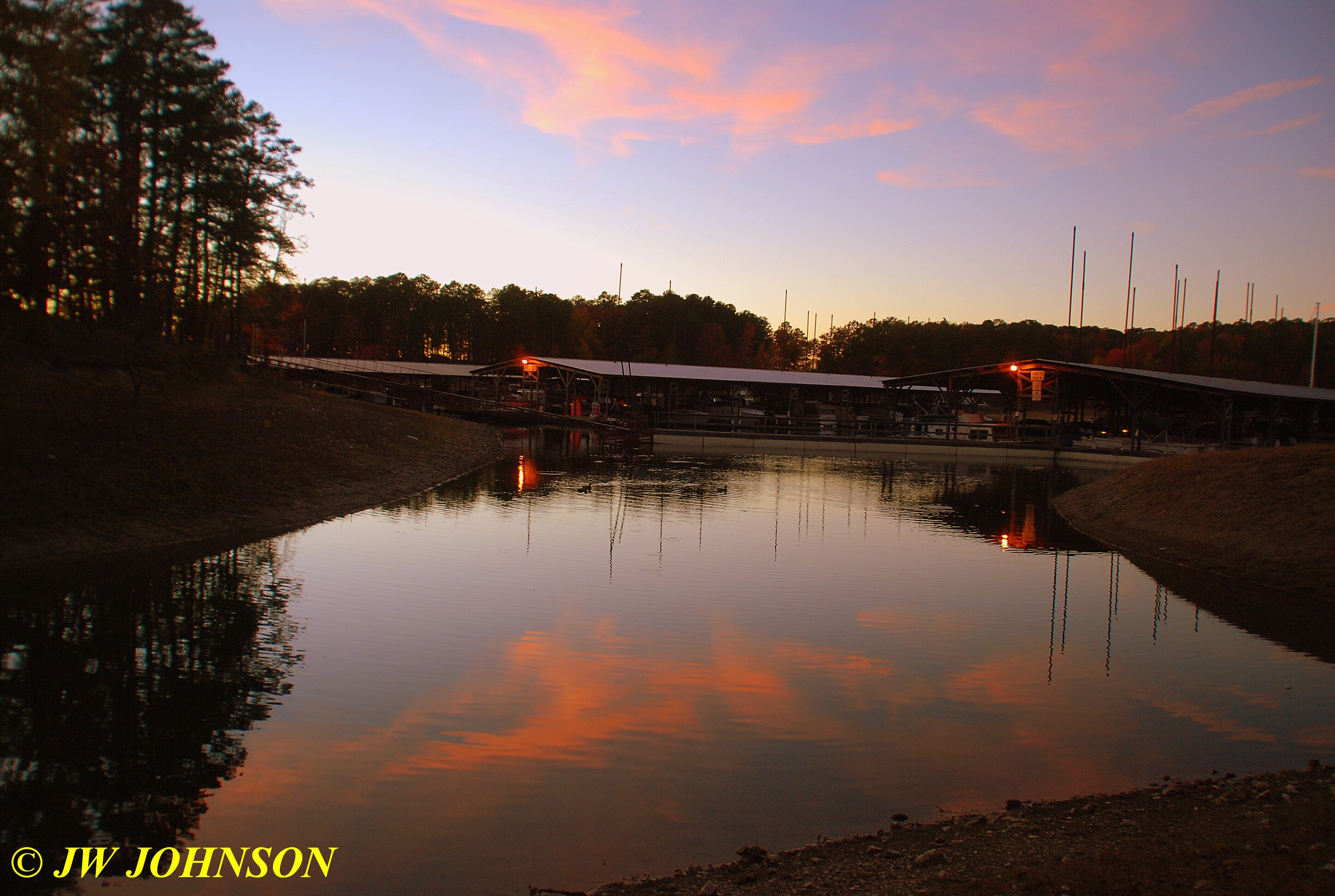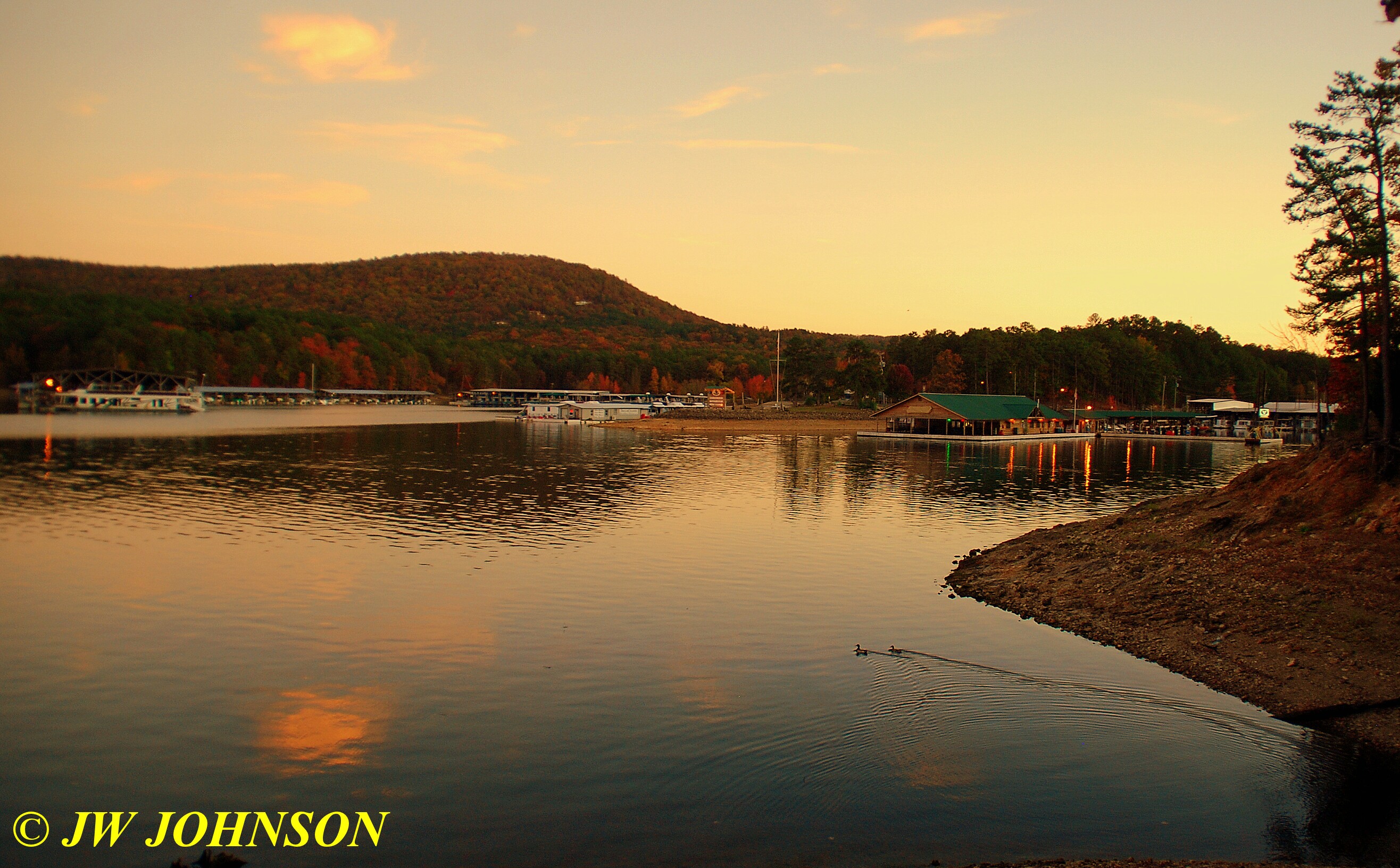 Missy and I woke up at sunrise and got a good hike in, walking the north lakeshore as the sun was coming up, this view of the main marina right off our cabin`s back deck…