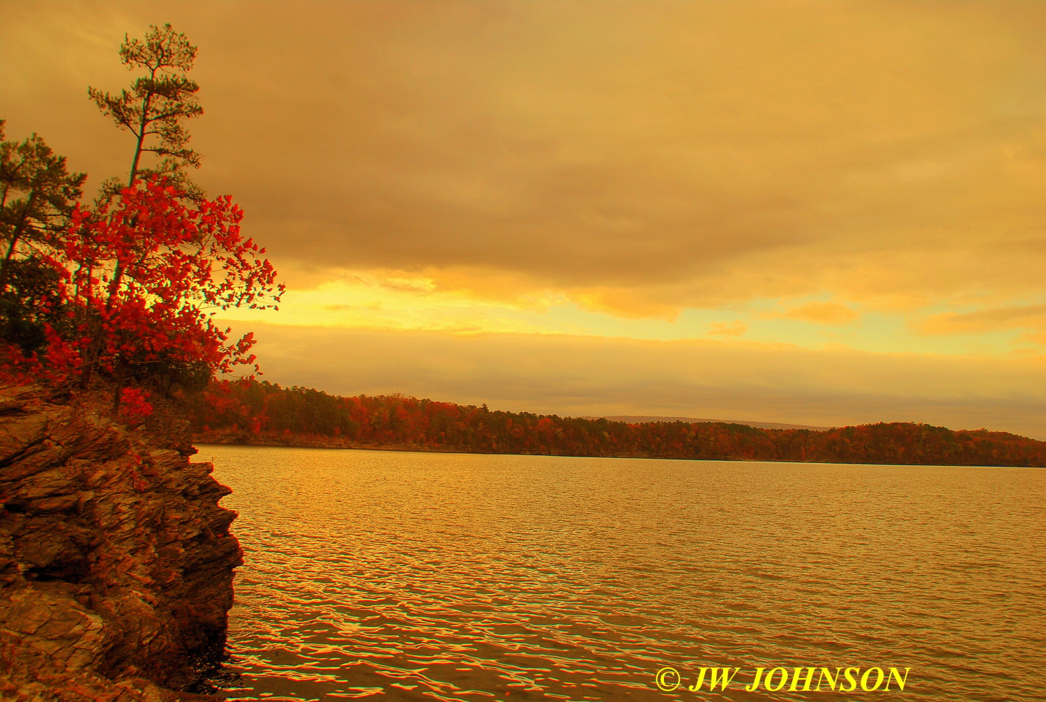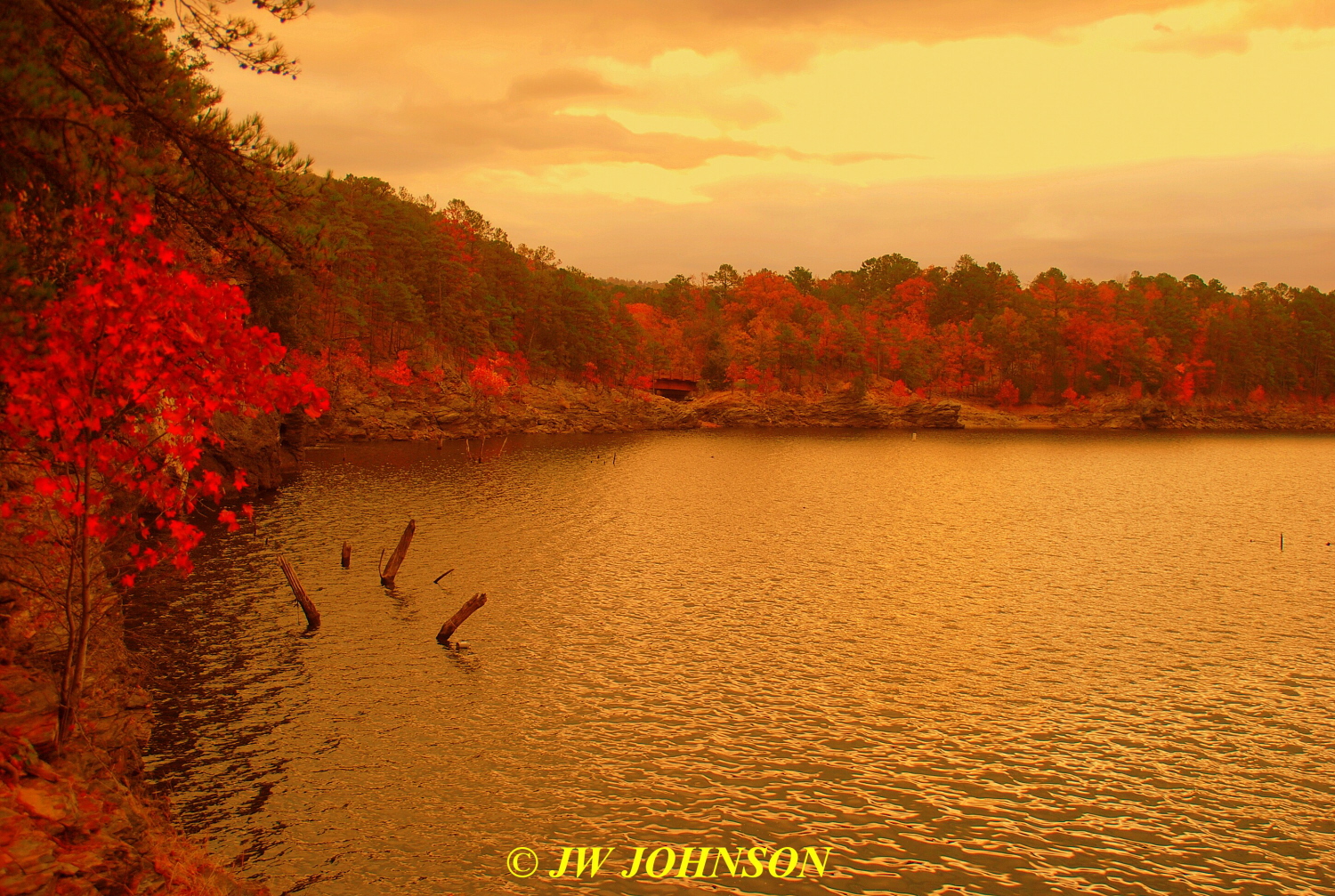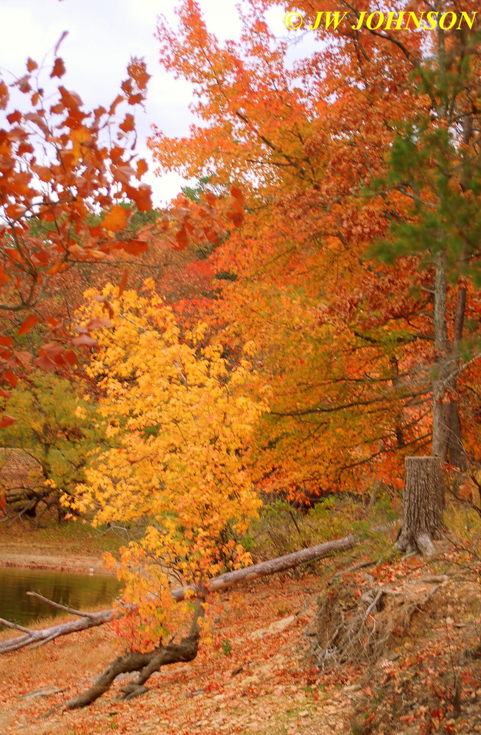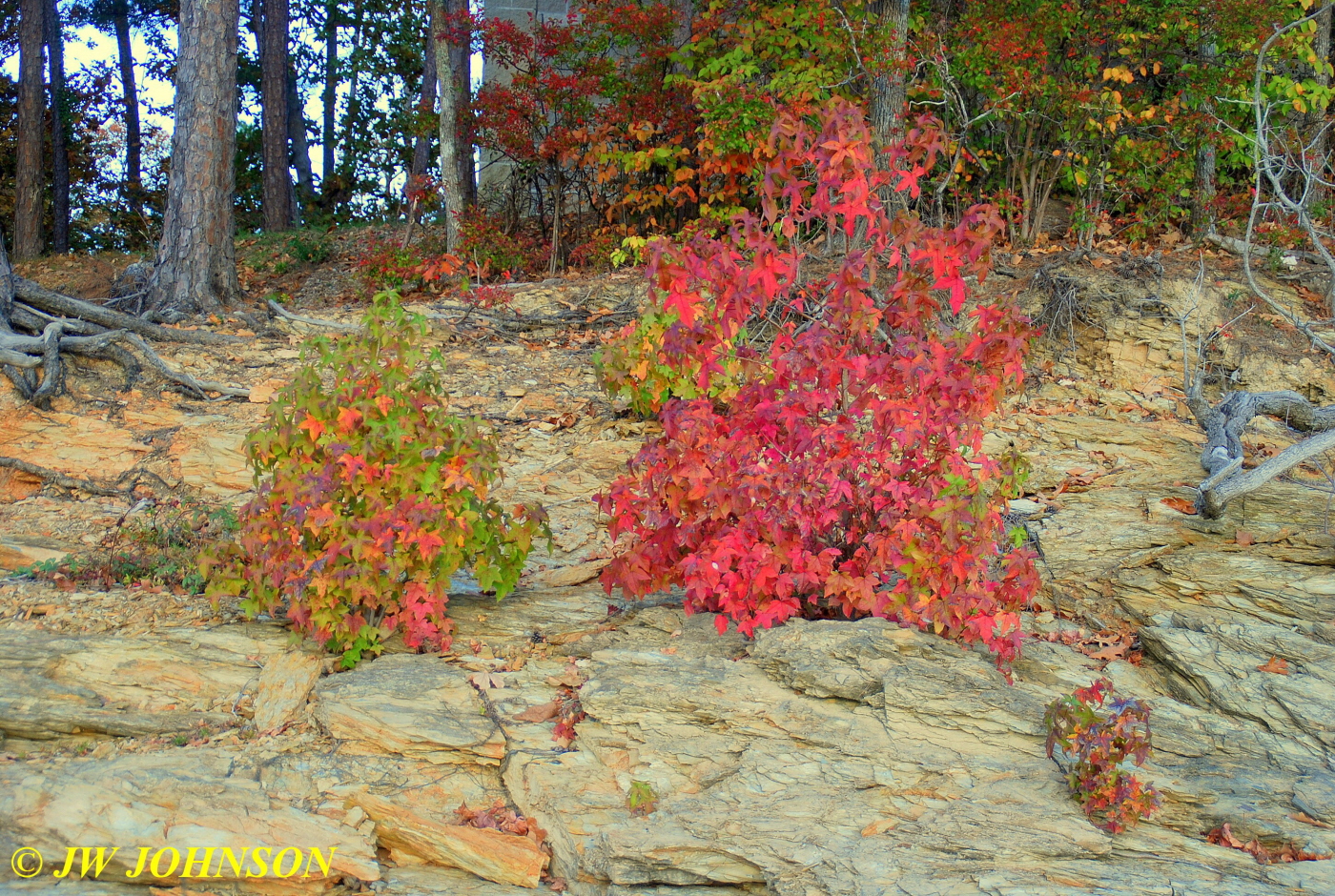 ..most of the lakeshore was made up of a shale shelf that stairstepped down to the water`s edge…this one shows two nice maple shrubs cloaked in fall colors….