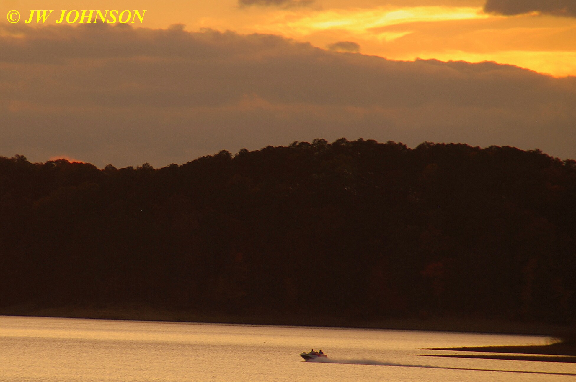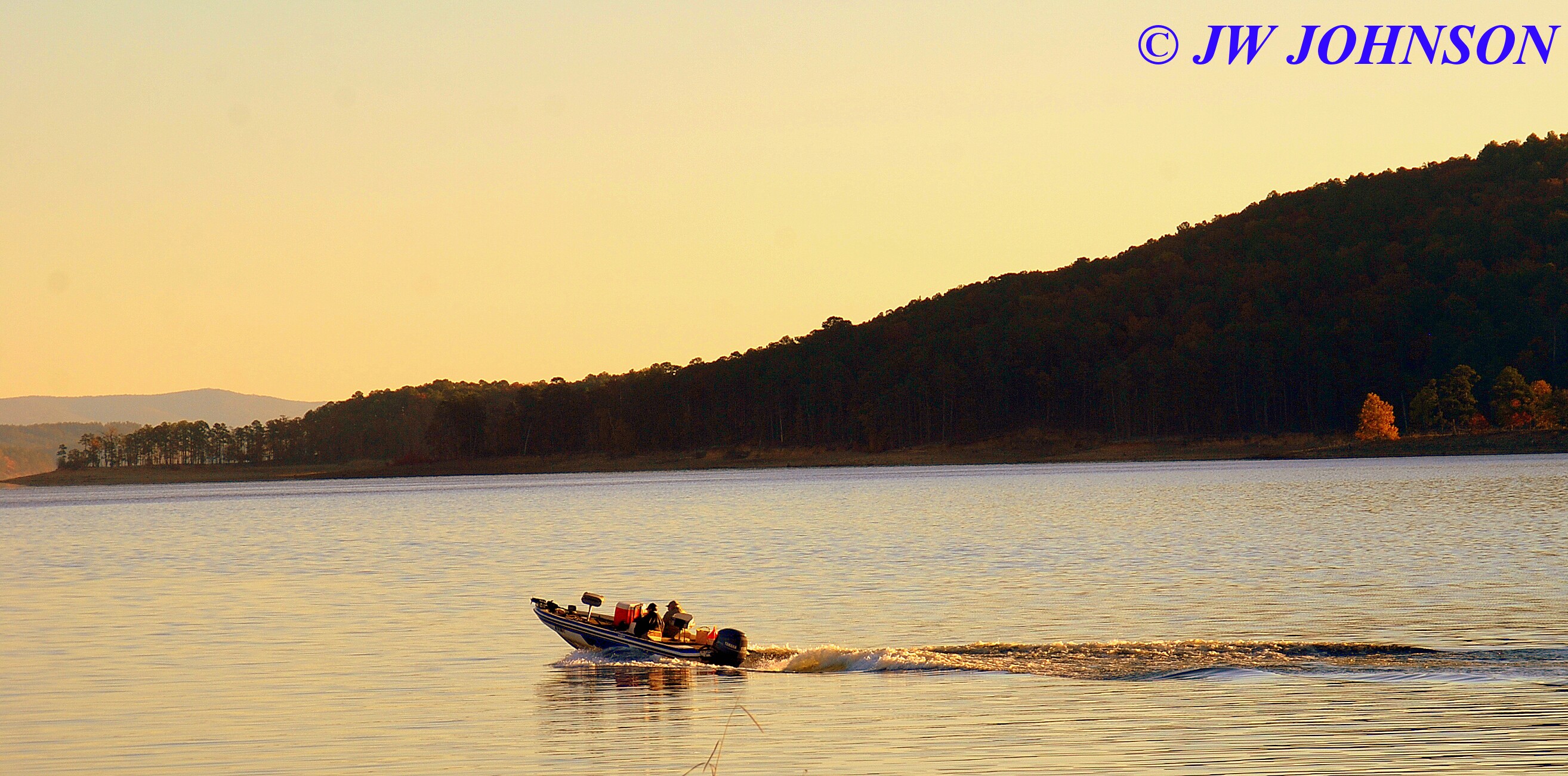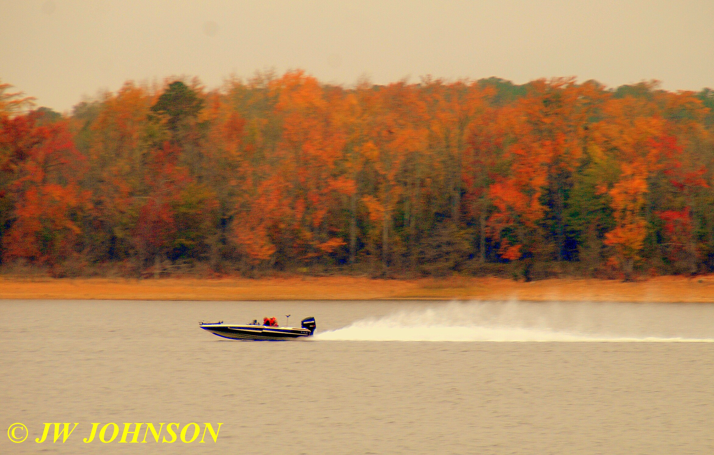 …then heard a speedboat coming down the lake behind us, so turned around and snapped these guys speeding along against a wall of colorful fall foliage on the far shore….