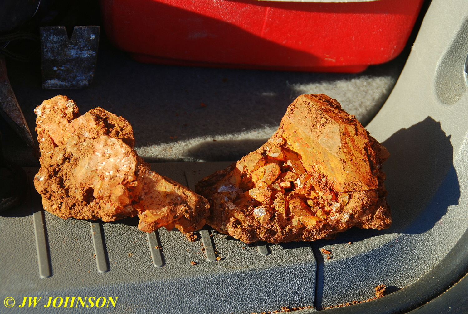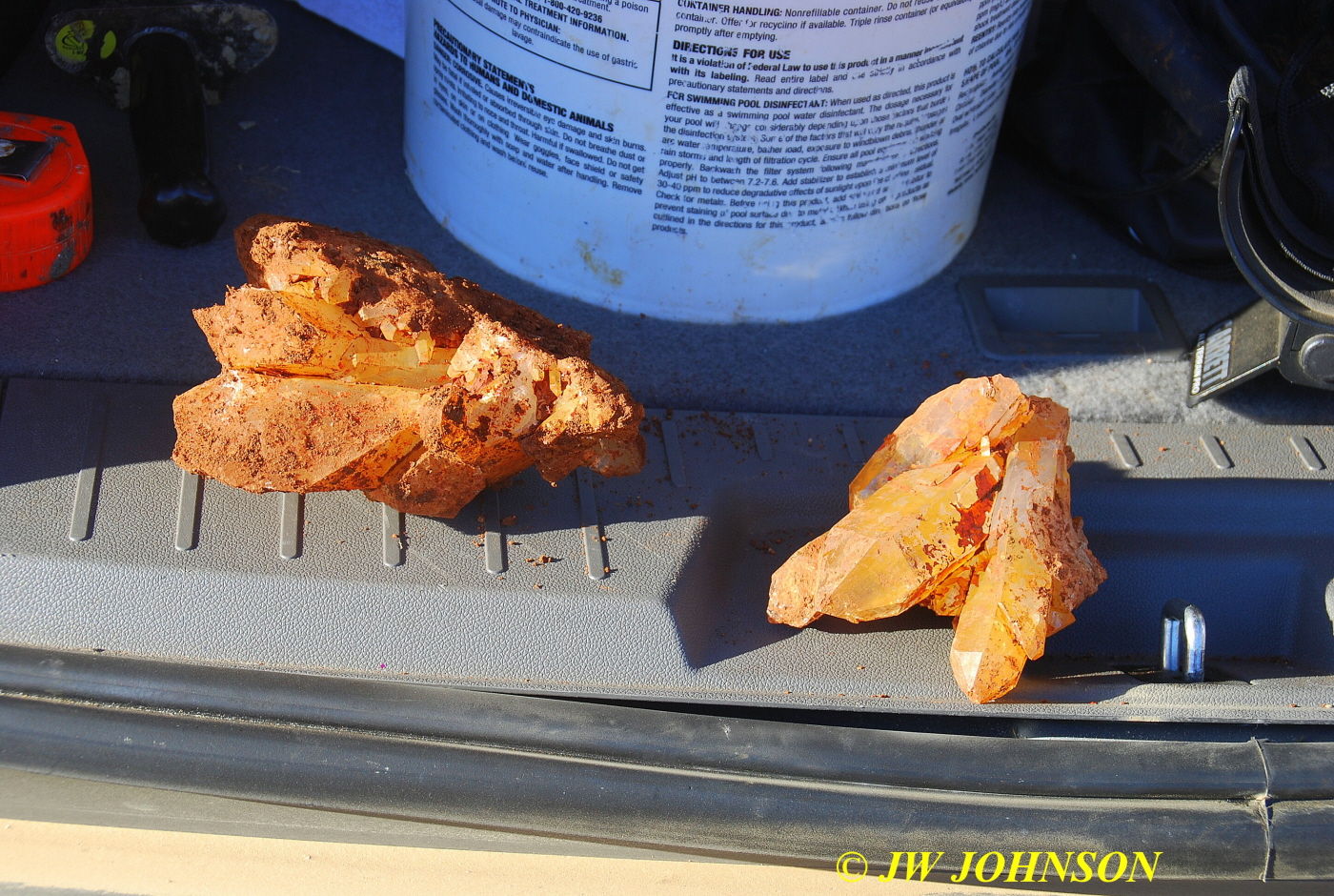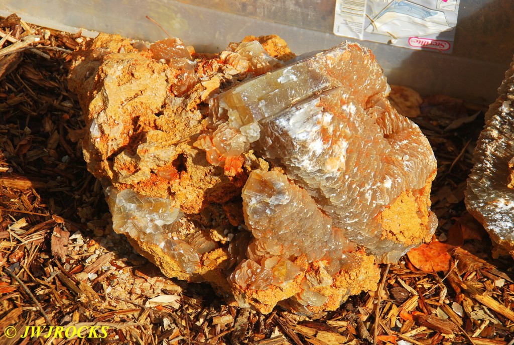 …the cluster on the right up above, has a very large single crystal laying down above a multitude of smaller crystals…he was pulling out all of them amidst several oohs and ahhs from the rest of us…in all a total of five basketball sized clusters of golden healers and some smaller ones as well. We continued to dig and pick up crystals and clusters for the next hour, both of us finding several larger plates covered in a thick clay mud and some softball sized chunks as well. We took off about 4 pm after picking up a couple of baskets and bidding Bill and Faith good byes and see you laters.