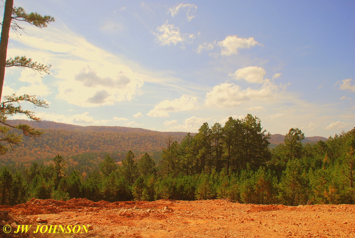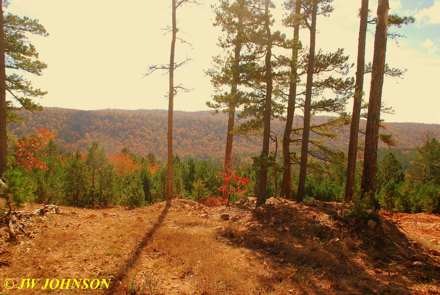 We ascended three times and leveled off three times in the mile and a half drive from the gate to the mine clearing…with a few scenic views of the mountains and valleys as we went…I had been told this might be a rough road, but as I pleasantly discovered, the lane was a thick carpet of oak leaves and pine needles under making for a soft ride instead with just an occasional rough spot along the way.