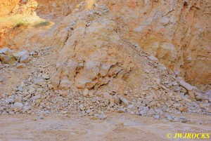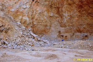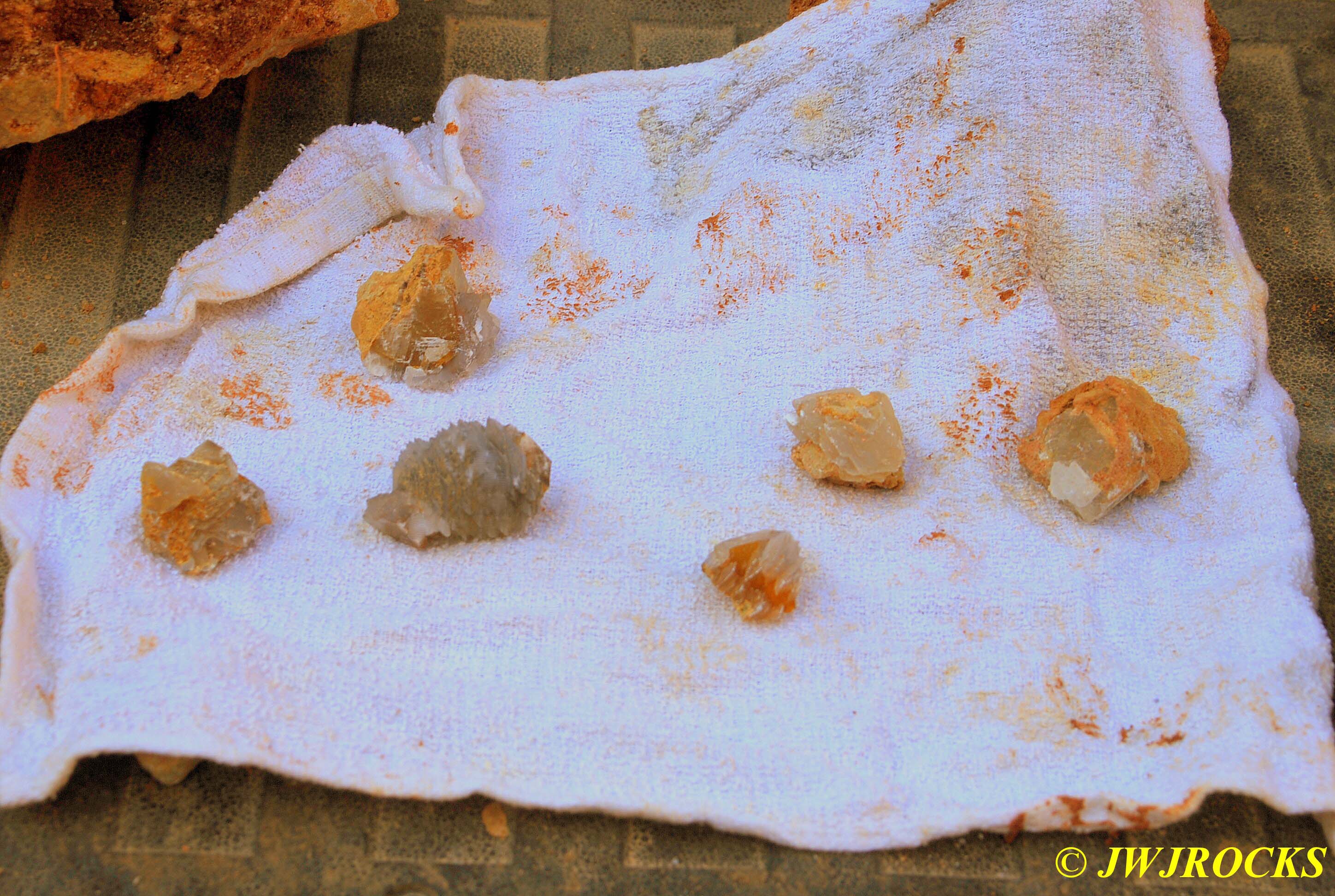 It was 10:30 am before I finished cleaning it out and by then I was not only tired but famished as well, not having had any breakfast other than a can of Arizona green tea on the way down. I drank some more tea and then decided to check the pile on the right of the cove, where the machinery had been removing some of the base of the pile, and I started finding black poker chip singles, and small clusters all over the place, most with very little damage, some with some matrix attached. I filled my shirt up, as I hadn`t brought a bag with me, and then carried them to the truck, wrapped them up, and headed home.
