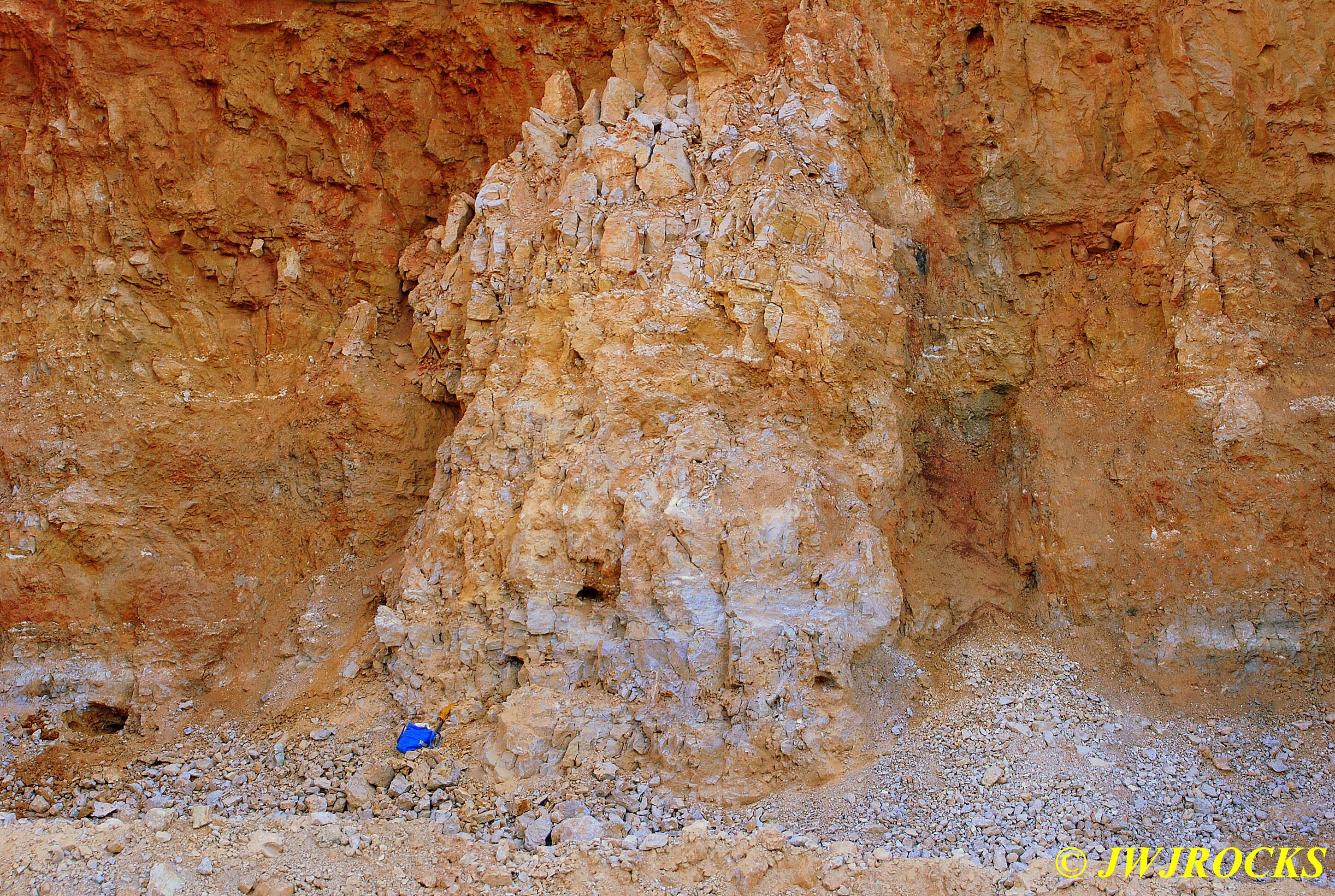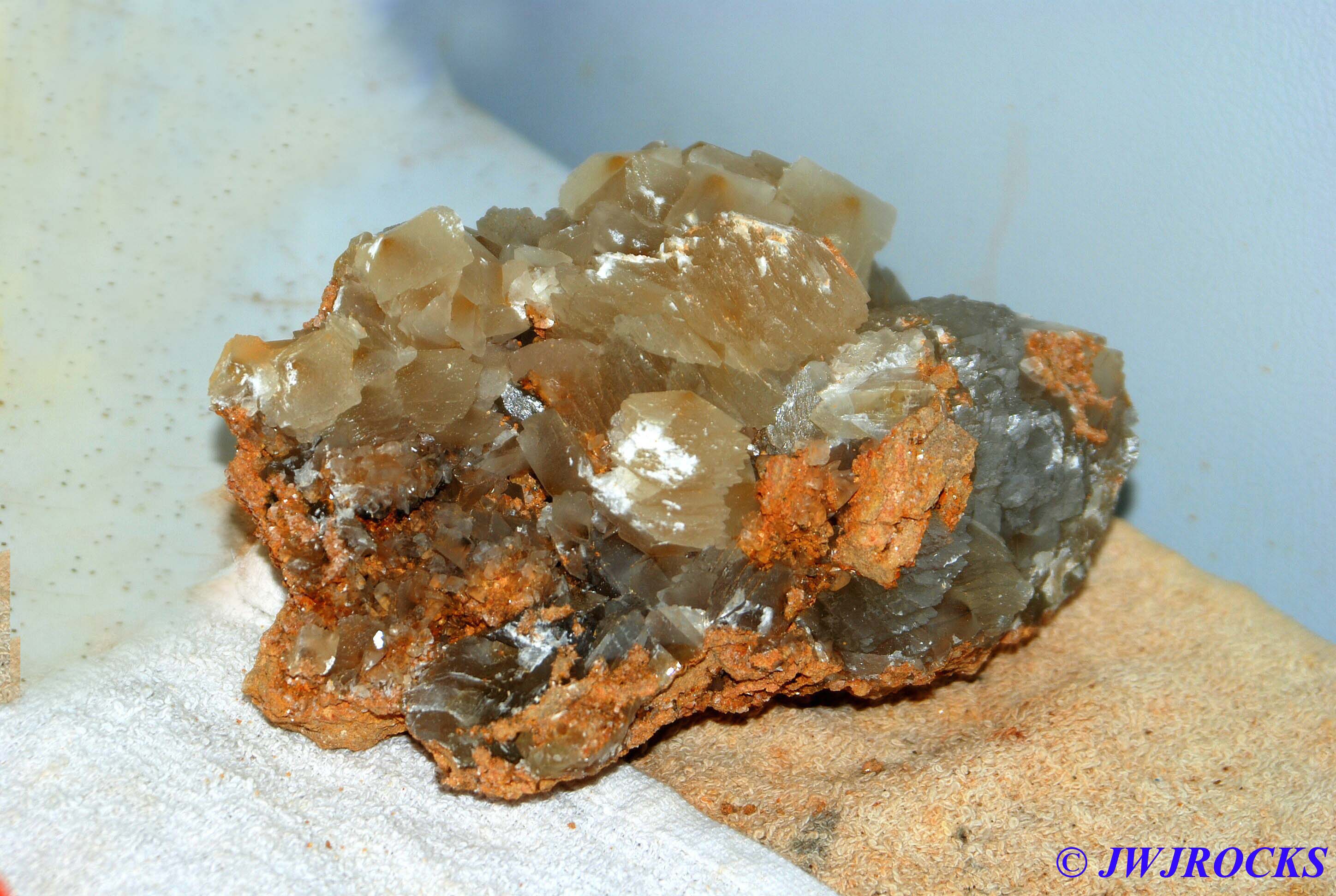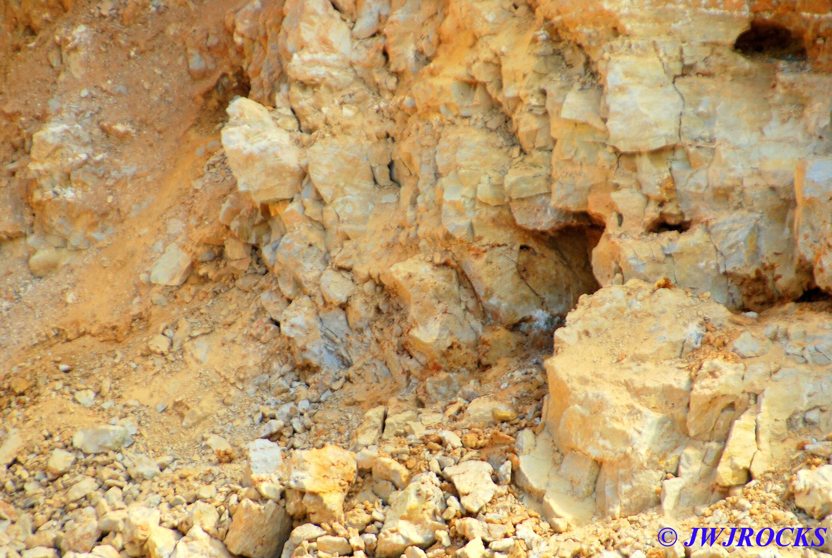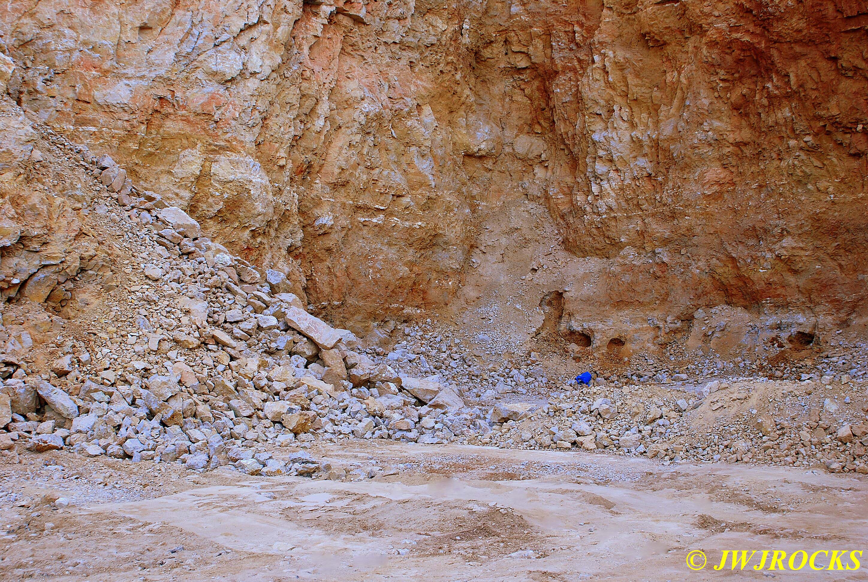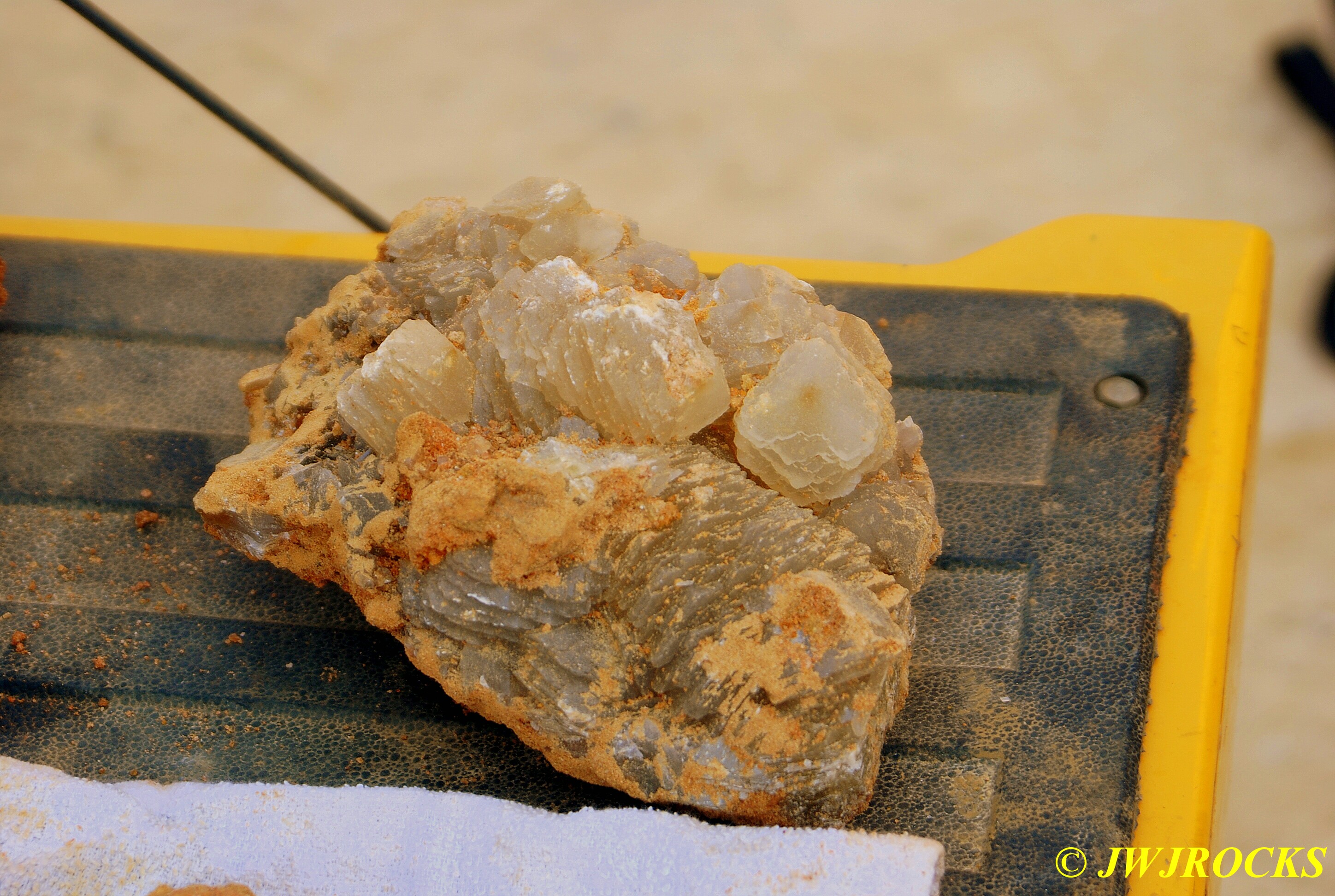 After a small cave in of rocks and gravel mix from above, and not finding much more than druse plates, I decided to move to the right and look along the wall for more pockets. I moved about fifteen feet over and found three pockets of calcite druse…