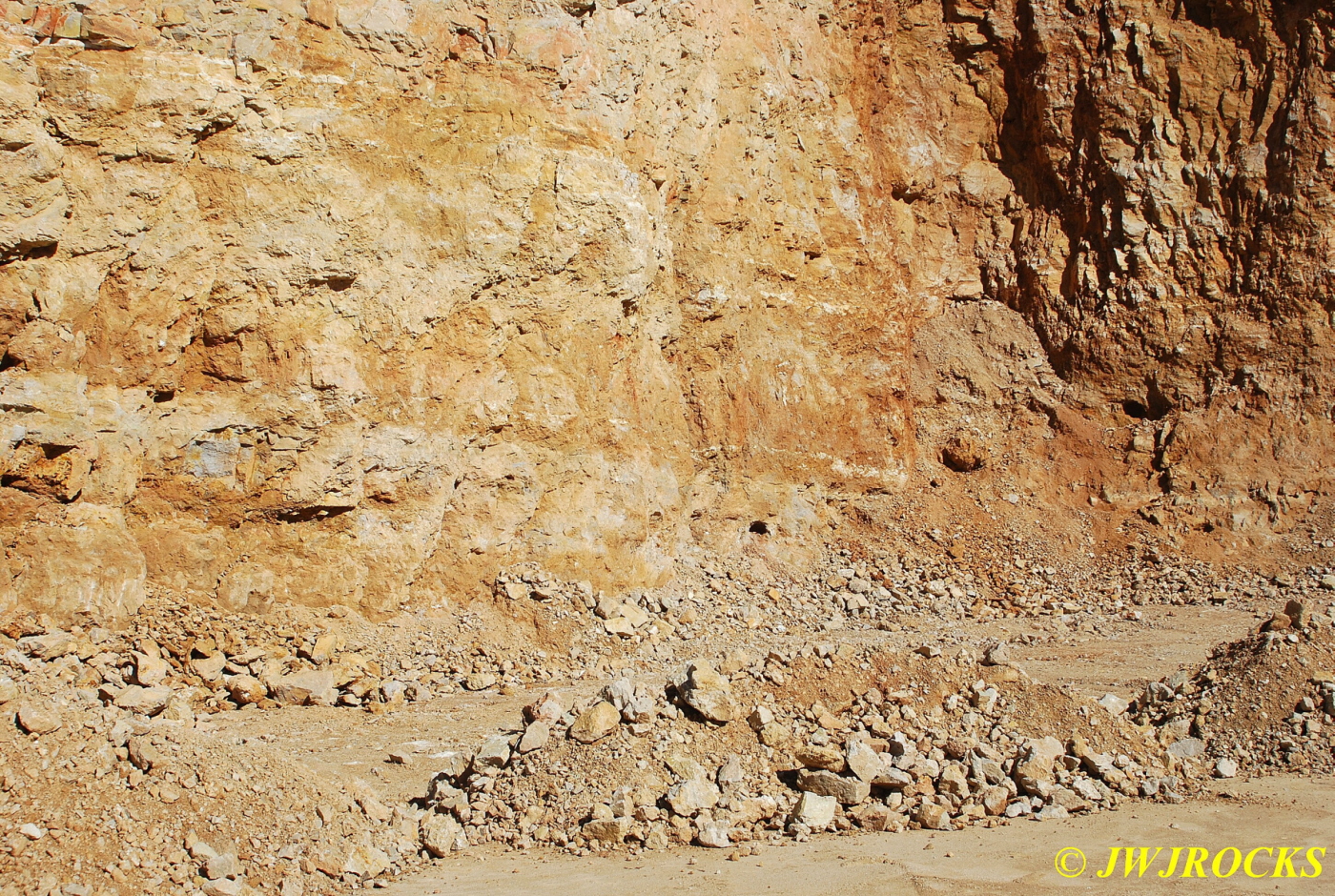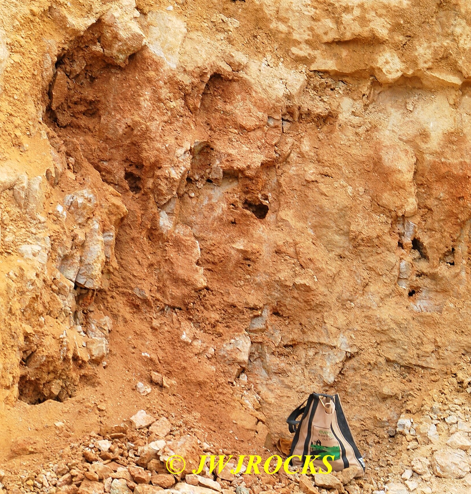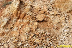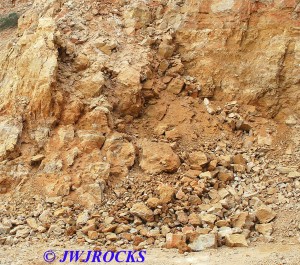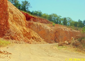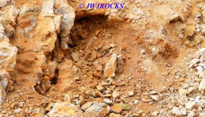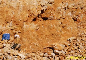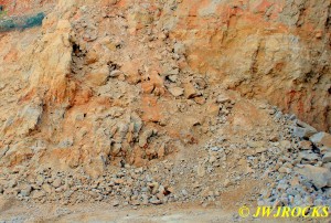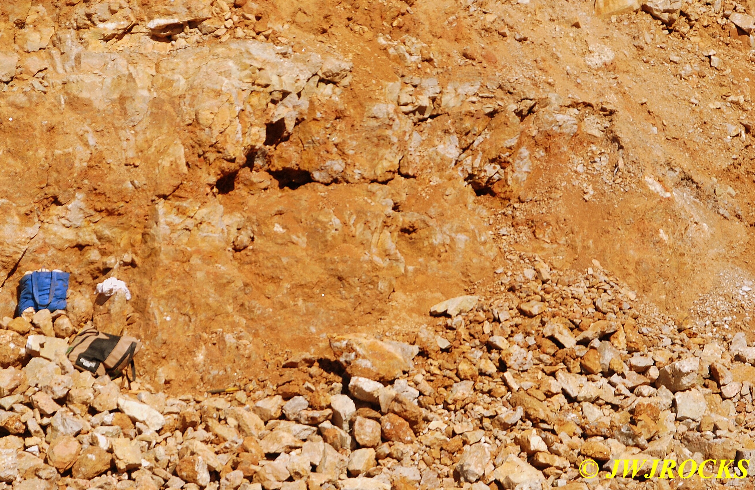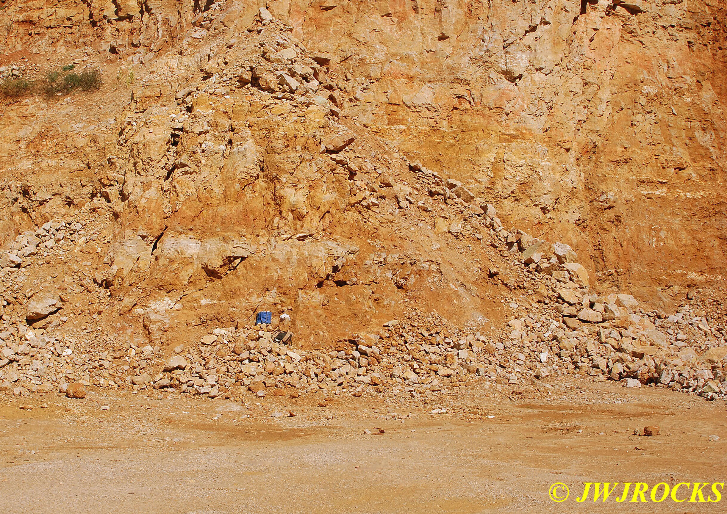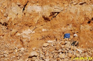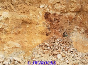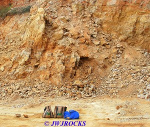 ……now just a few piles of rocks left at the bottom of the wall…we checked the piles first and found a few remnants of clusters, then checked the wall pockets and St Louis Ray spotted a pretty crystal cluster sitting about ten feet up in situ matrix…and was able to climb up and retrieve it without any problem. For the next couple of hours, we scraped along the wall and found a few pockets of small clusters….