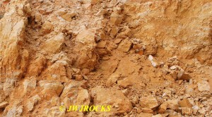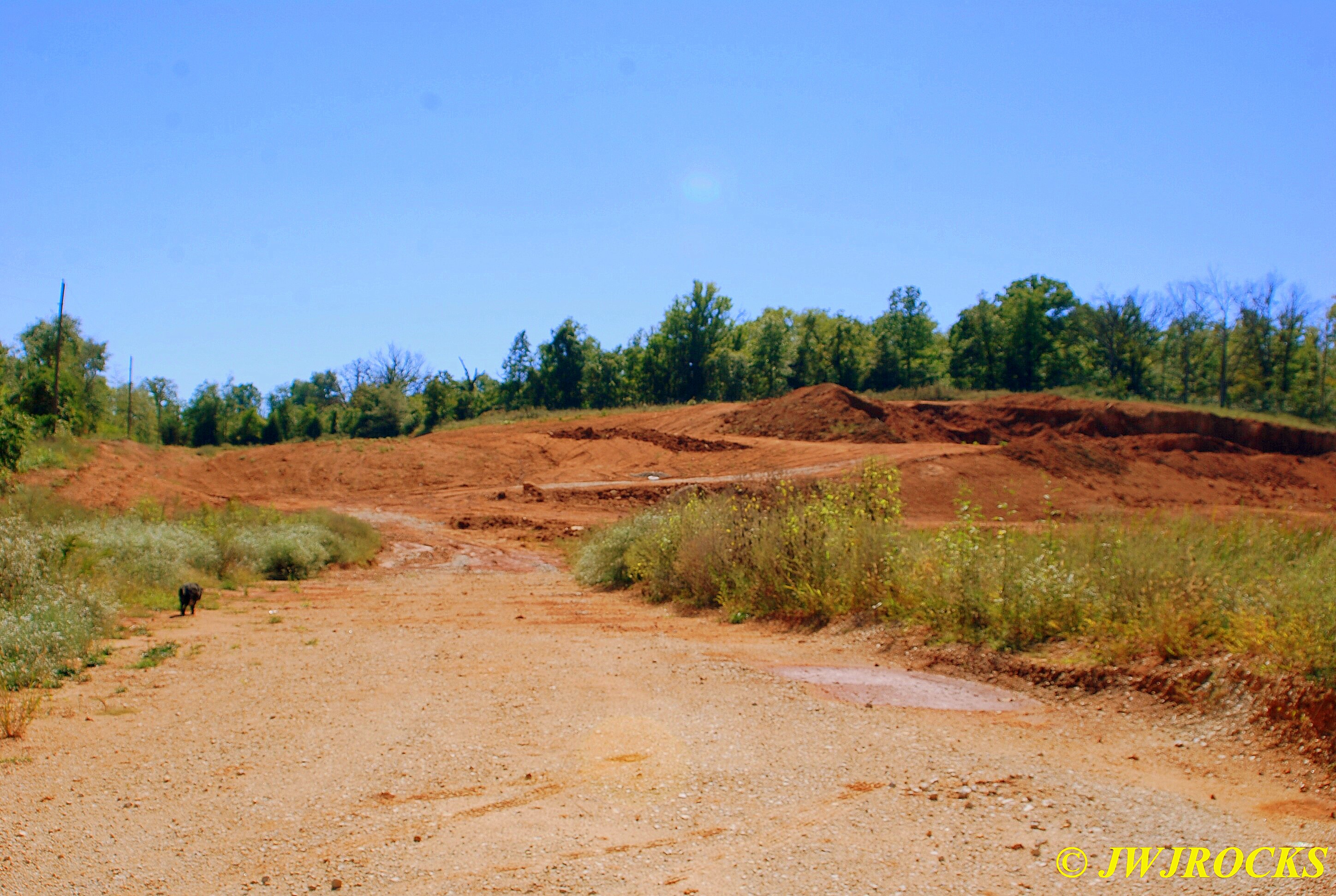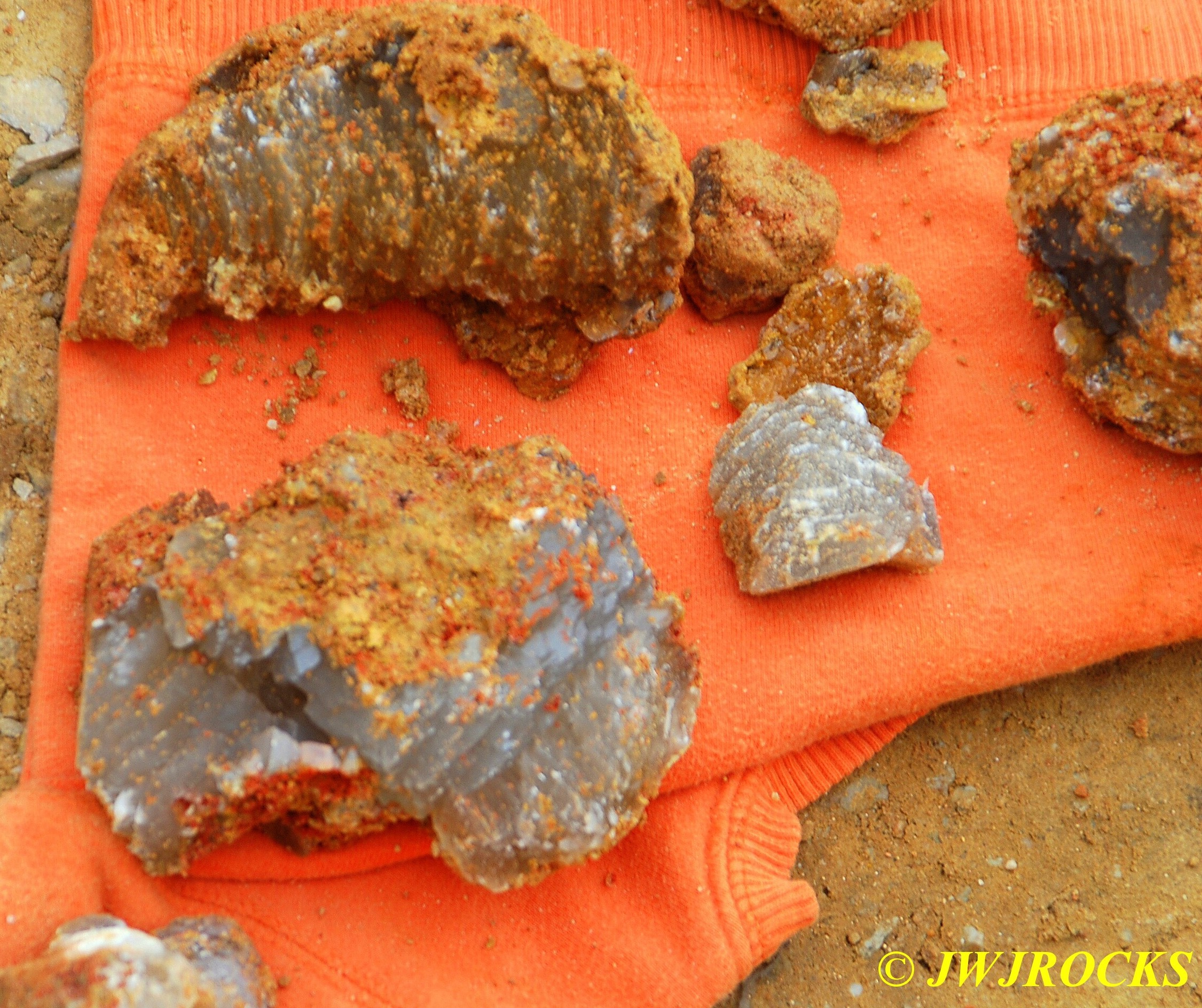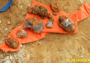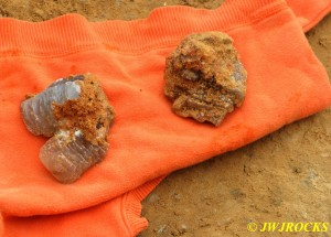 We walked up to the top of the hill as seen in the photo above, first…as I explained to Ray after arriving and getting our boots on…I have had better luck finding beautiful bubbles up there. We each grabbed a couple of bags and tools and headed up the hill with Missy in hot pursuit. I stayed to the left and walked up a trail that had been drastically eroded by heavy rainfall and Ray went up the little road going up the hill to the right….within thirty minutes, I spotted a pile of dirt and on closer inspection, found several plates of smokey colored druse quartz…one of my favorite colors there…I walked back to the truck to get more bags and wraps and returned to wrap them up.