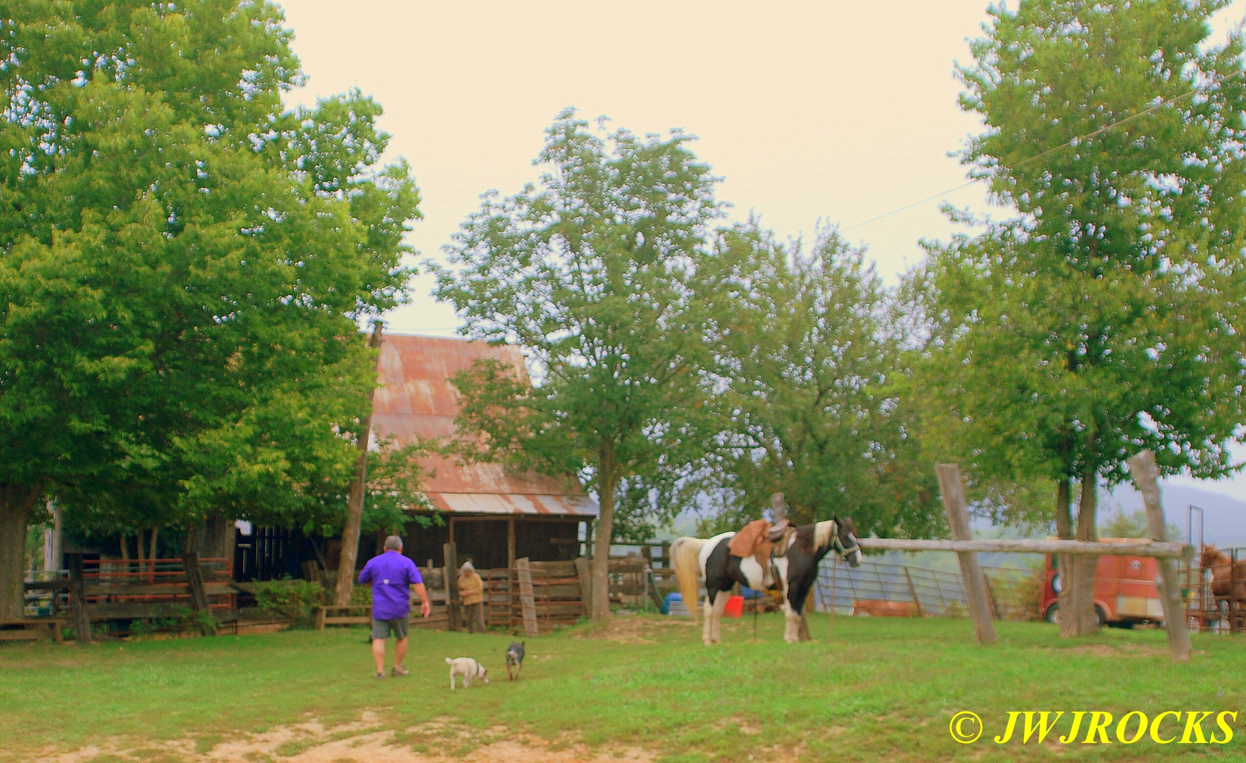 …and a beautiful white picket fence surrounding it….it`s like a bright beacon from the roadway and is just as pretty on the inside as it is on the outside. We arrived at the farm a little after 10 am and found Carol and Jerry saddling up horses for us…Ray was no sooner out of my truck and walking across to meet Carol…..