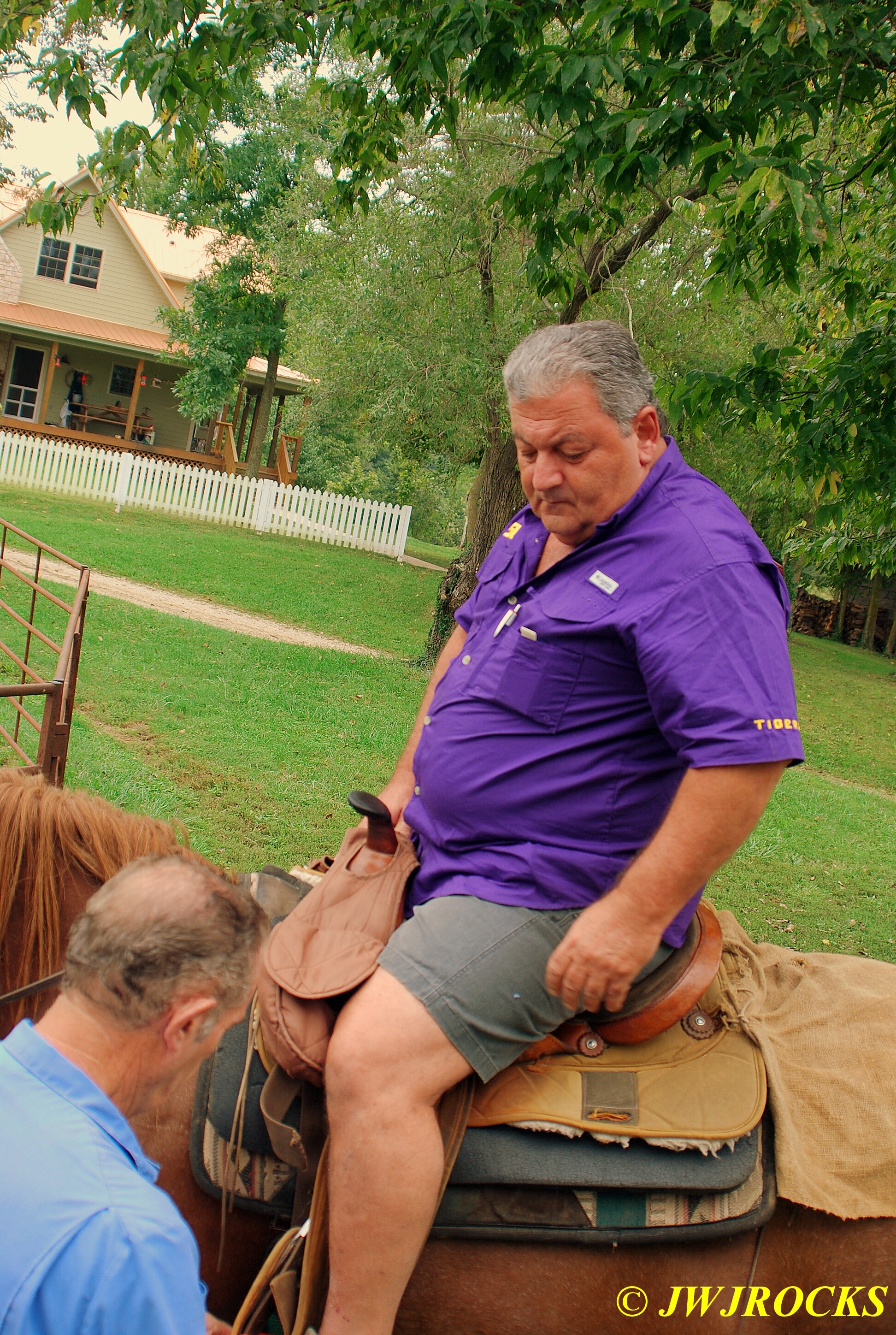 We signed the releases and got saddled up while waiting for her to arrive. Here you see Jerry adjusting the stirrups for Ray as he is sitting on his horse….