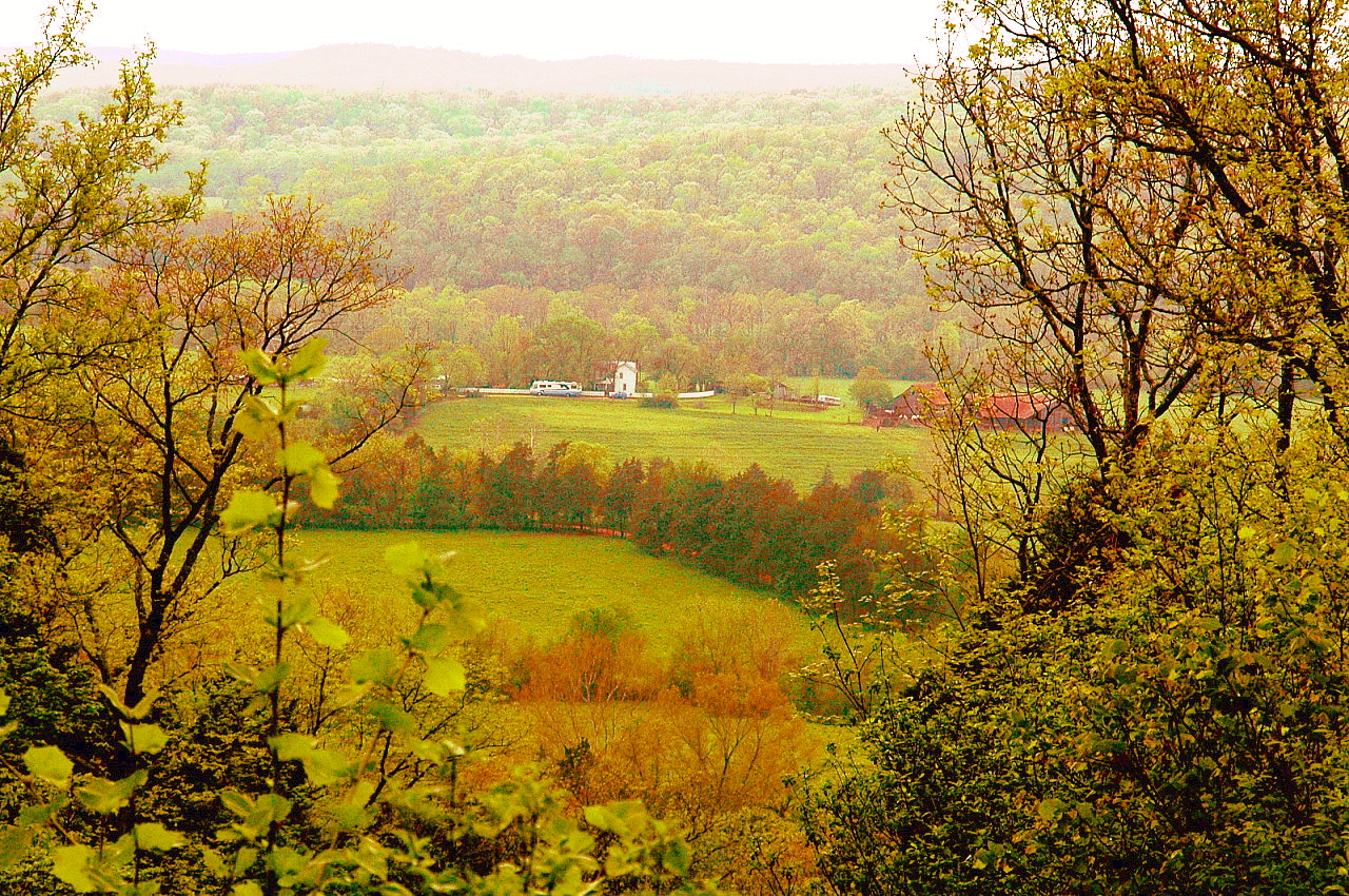 Ray came over to my house bright and early on Wed morning…ready to go horseback riding…..I asked him where his jeans were cause he was wearing shorts, and he said he figured he would be okay in shorts…lol…he rode with me up to my friend`s horse farm out of Bourbon, the Meramac Farm Bed and Breakfast Horse Farm….its a Century Farm, over 100 years old, they have a few horsebarns there, one is over 125 years old and built with wooden pegs instead of nails…you can see them in the huge loft beams. They have several horses there and easily accomodate groups for trail rides with over 900 acres of farmland and forested hills. This is a view of their farm back in 2009 from one of their hilltop views….