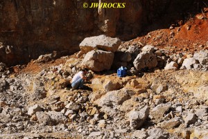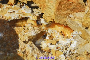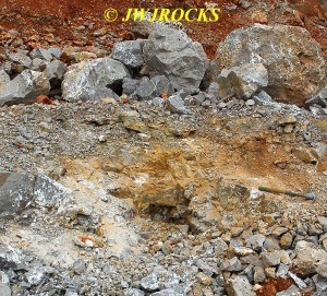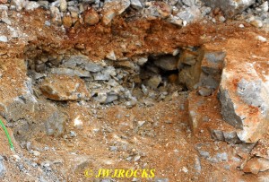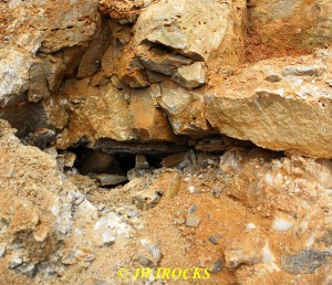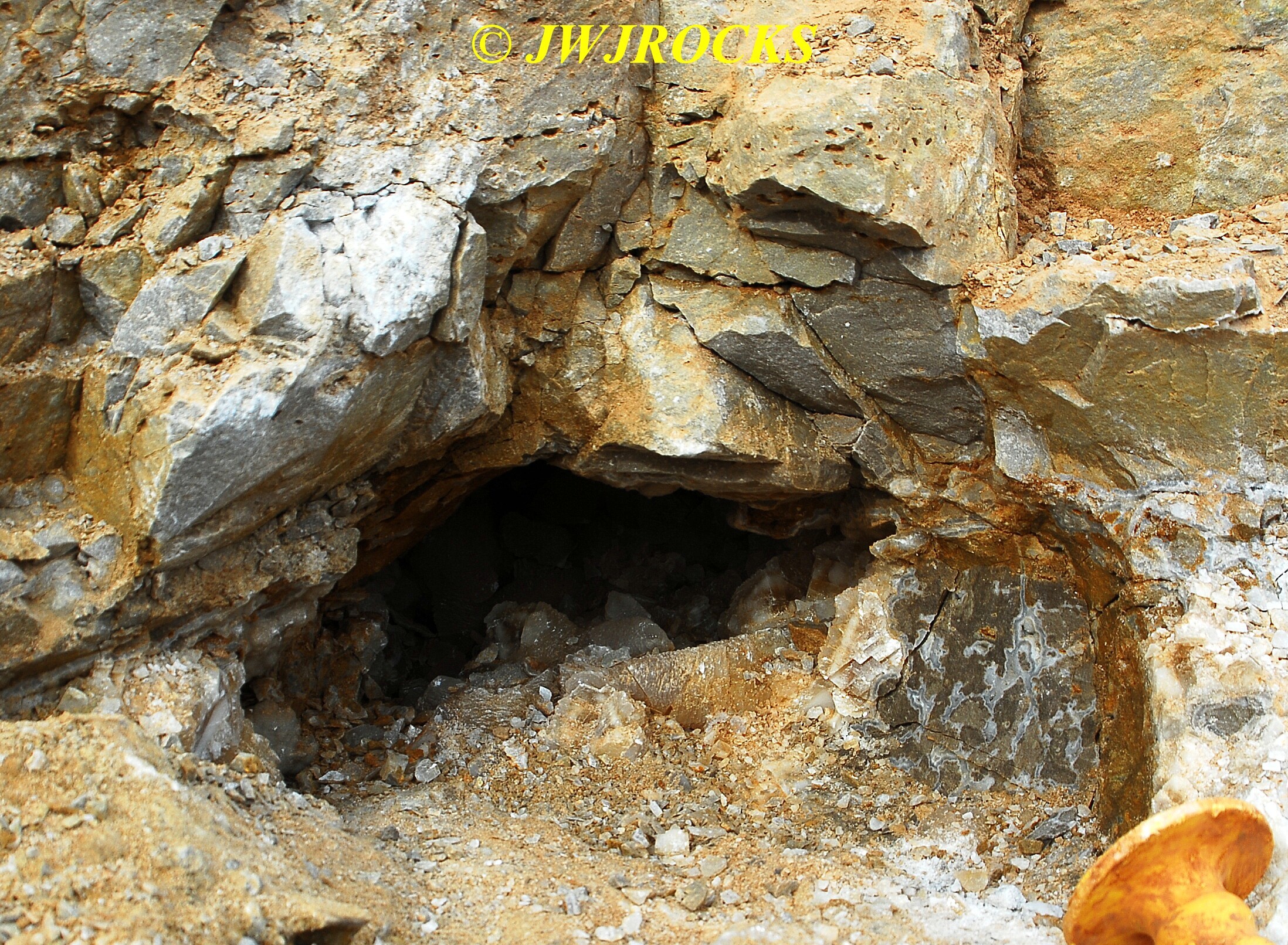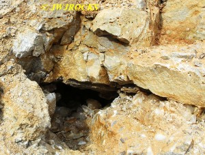 ….now, its not that hole in the center above as that is one of several that range across the bottom of that mound of rock…the pocket I located is above my mini mattox above it…here it is up closer….