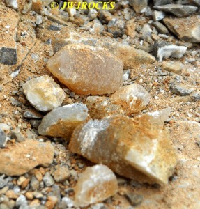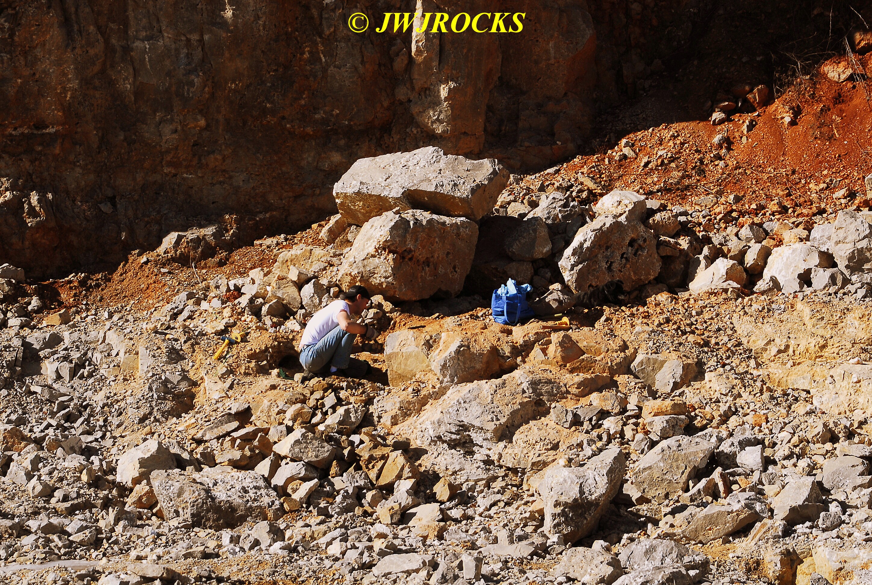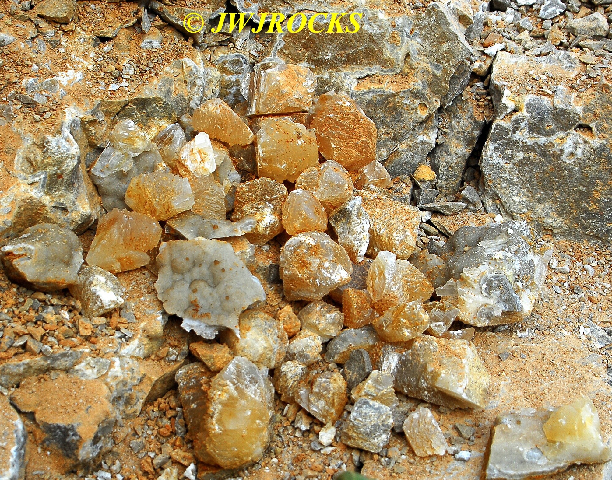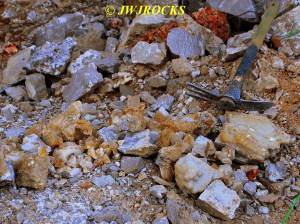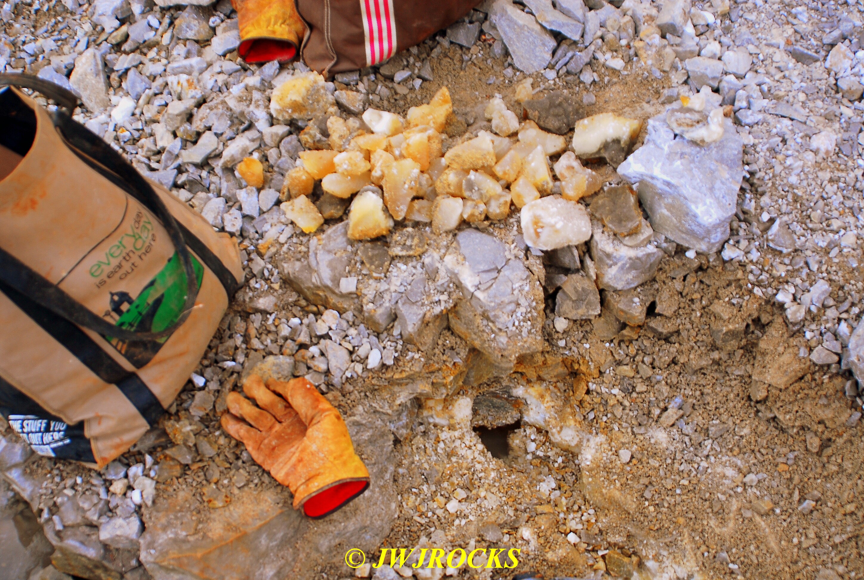 Well folks, as you can see, I am behind again…had a great dogtooth pocket weekend, I found a great pocket each day. Saturday it was just Missy and me and we arrived at the new secret spot about mid morning…we were expecting forty degrees, but the constant wind from the northwest made it feel more like 30 degrees. Once I got started digging in with my mini mattox, though, I warmed up fast and stayed right there all day, and once I started finding pockets and crystals, the weather soon left my mind. As soon as I pulled in and parked, I looked over at this mound of solid looking rock, and decided to start raking rocks down the side of it and see if I could locate an opening to a pocket, so I started to the right of if and worked my way to the center of that mound….