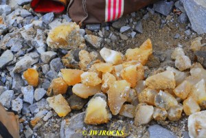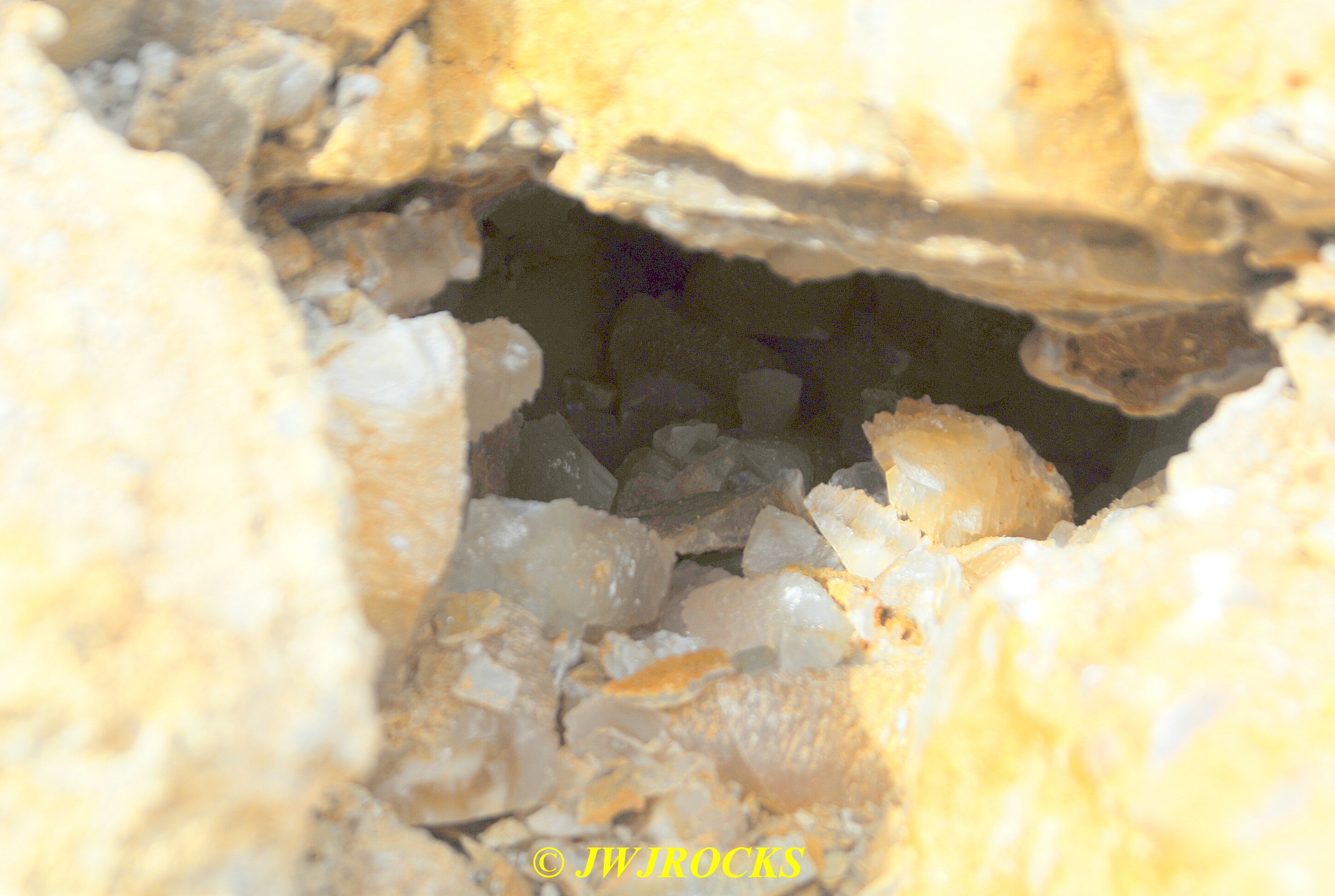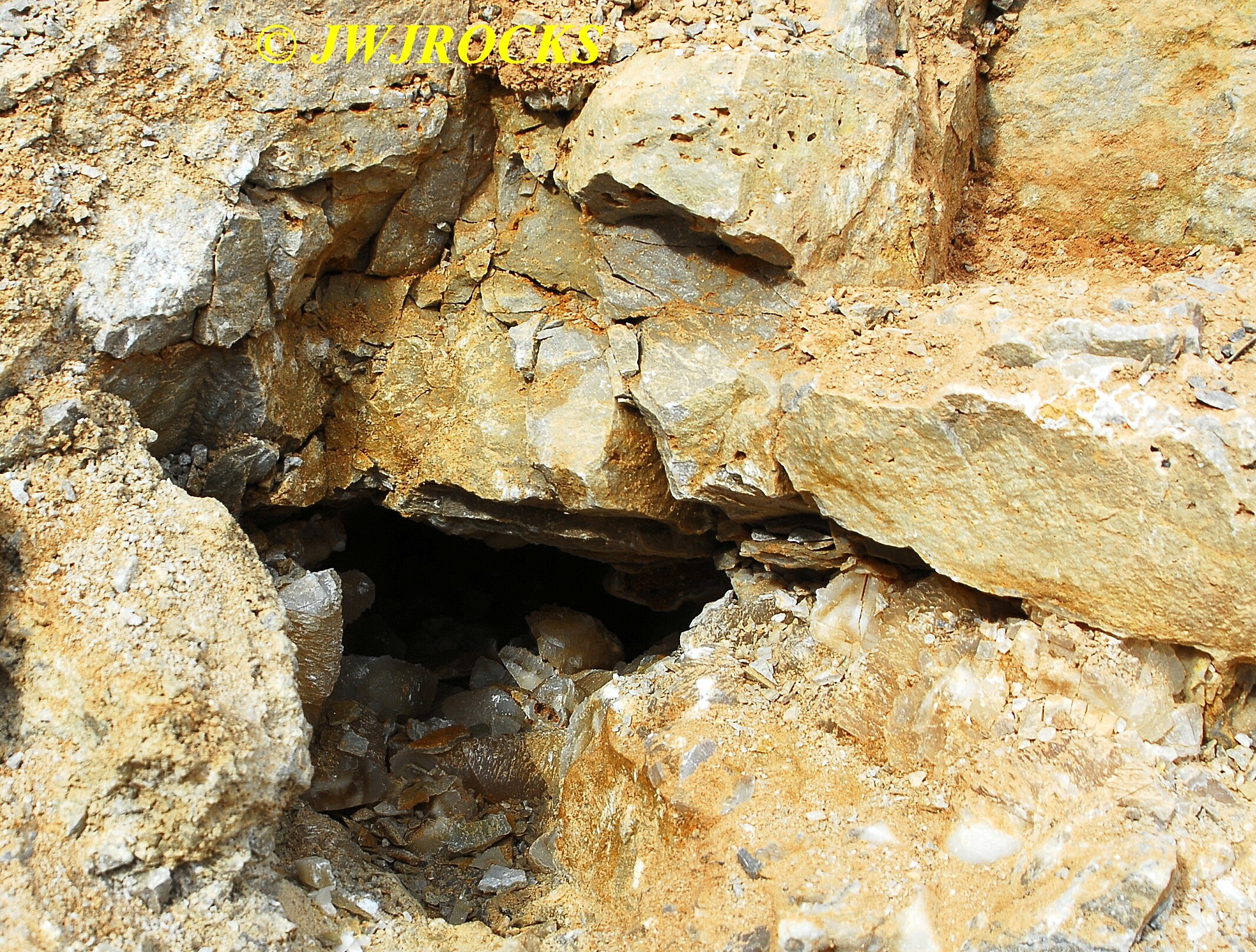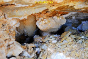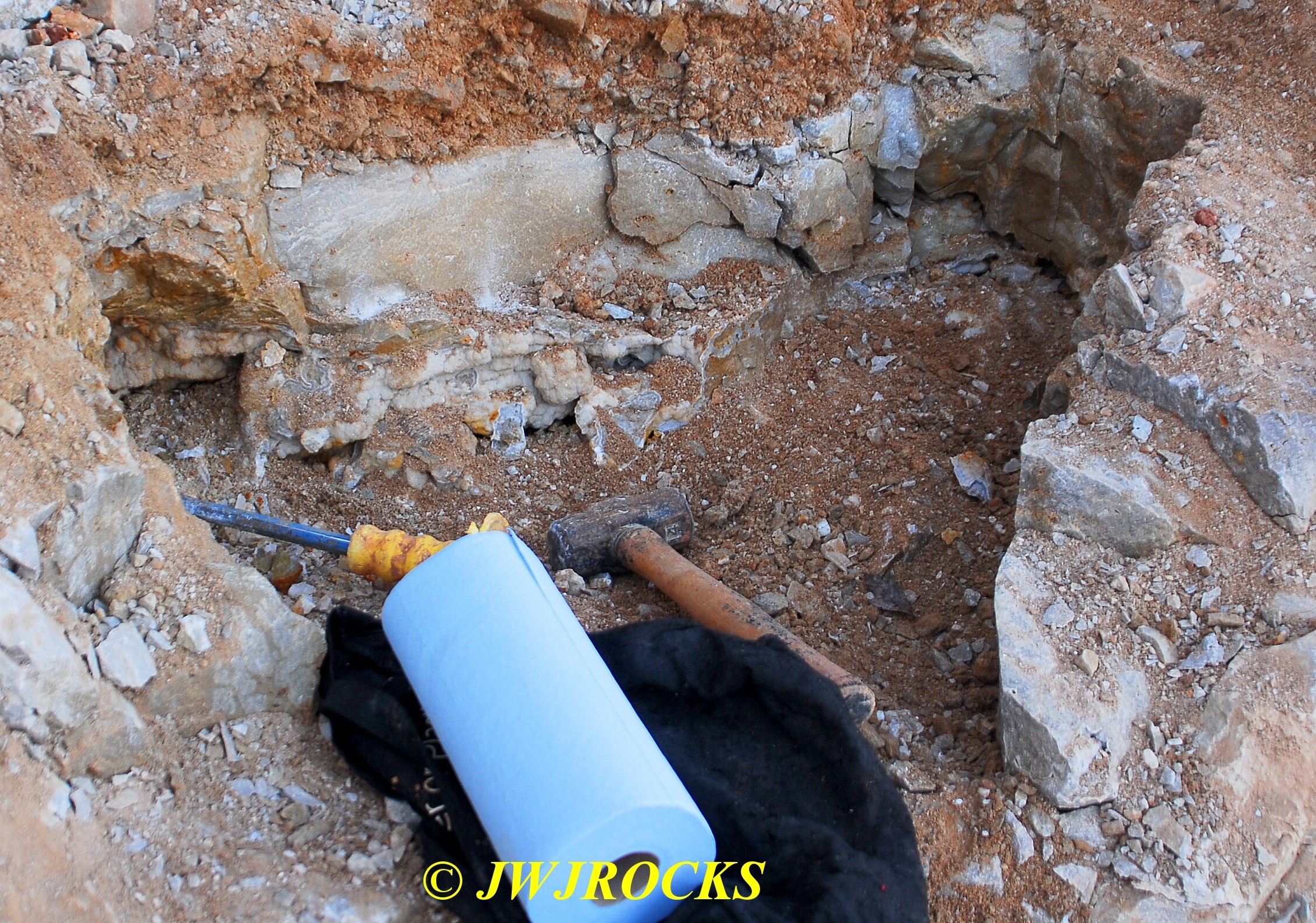 We started down Sunday morning about 9:30 am…I had told Ray the night before, that I was not leaving until at least 9 am, wanted to sleep in a bit and rest up some from Saturday`s digging…my hands were still sore even after taking two aleve and getting a good soak in the hot tub. I told him on the way down, that he could start on the pockets I had worked the day before, where I found the dogtooths, and see if he could find more, was fairly sure there were more pockets there from what I could see when I left, the downward angle on the left side and the opening under the rock on the right side. I would leave it up to him if he wanted to work it or not.