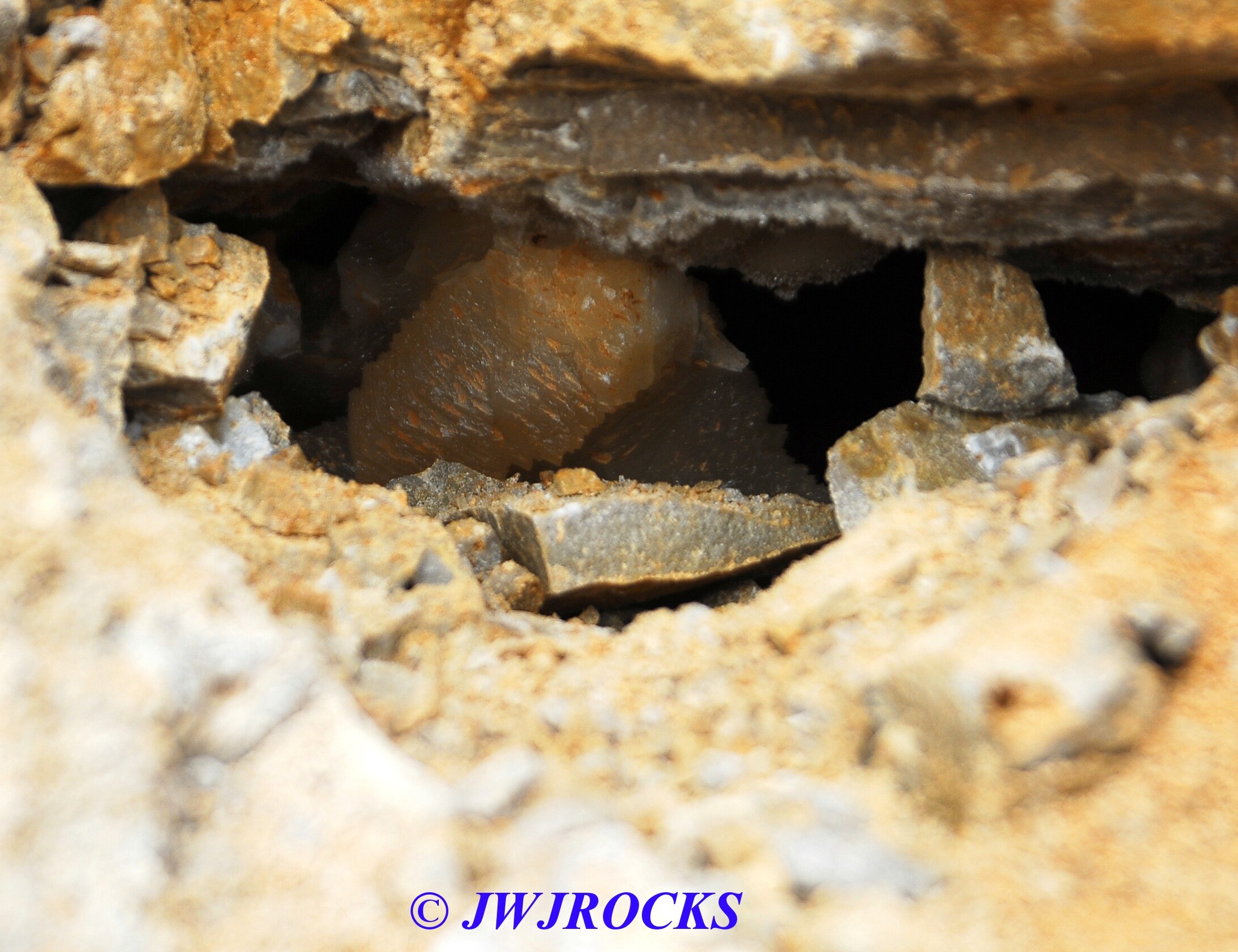 …and when I got that cleared, I looked to the right and just inside the pocket, was what appeared to be a beautiful yellow-orange dogtooth crystal….