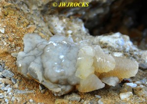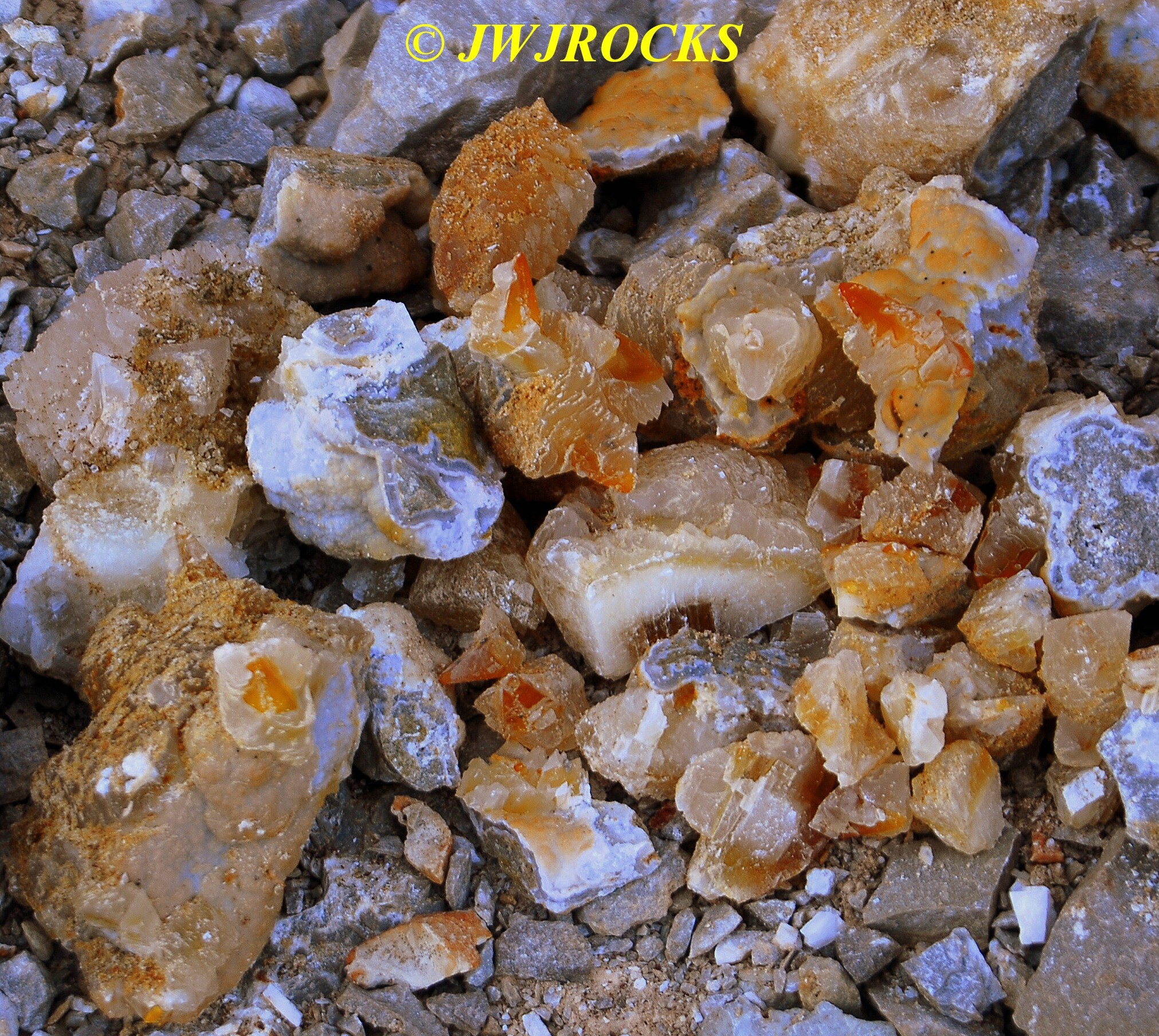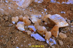By this time, Ray had walked up to the top of the hill looking for druse, chipping some plates and pieces of nice pretty white druse out of some boulders up there. I continued to the left for about another thirty feet, then walked back to some water holes, that we had dug out weeks before and looking down in one spot, discovered a dogtooth nestled in the gravels. I reached down and dug around a bit and started finding dogtooths all over the place, moved some rocks and found an entire pocket of dogtooths embedded in the gravel and under some rocks…