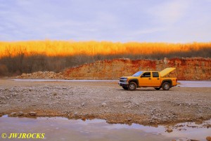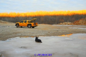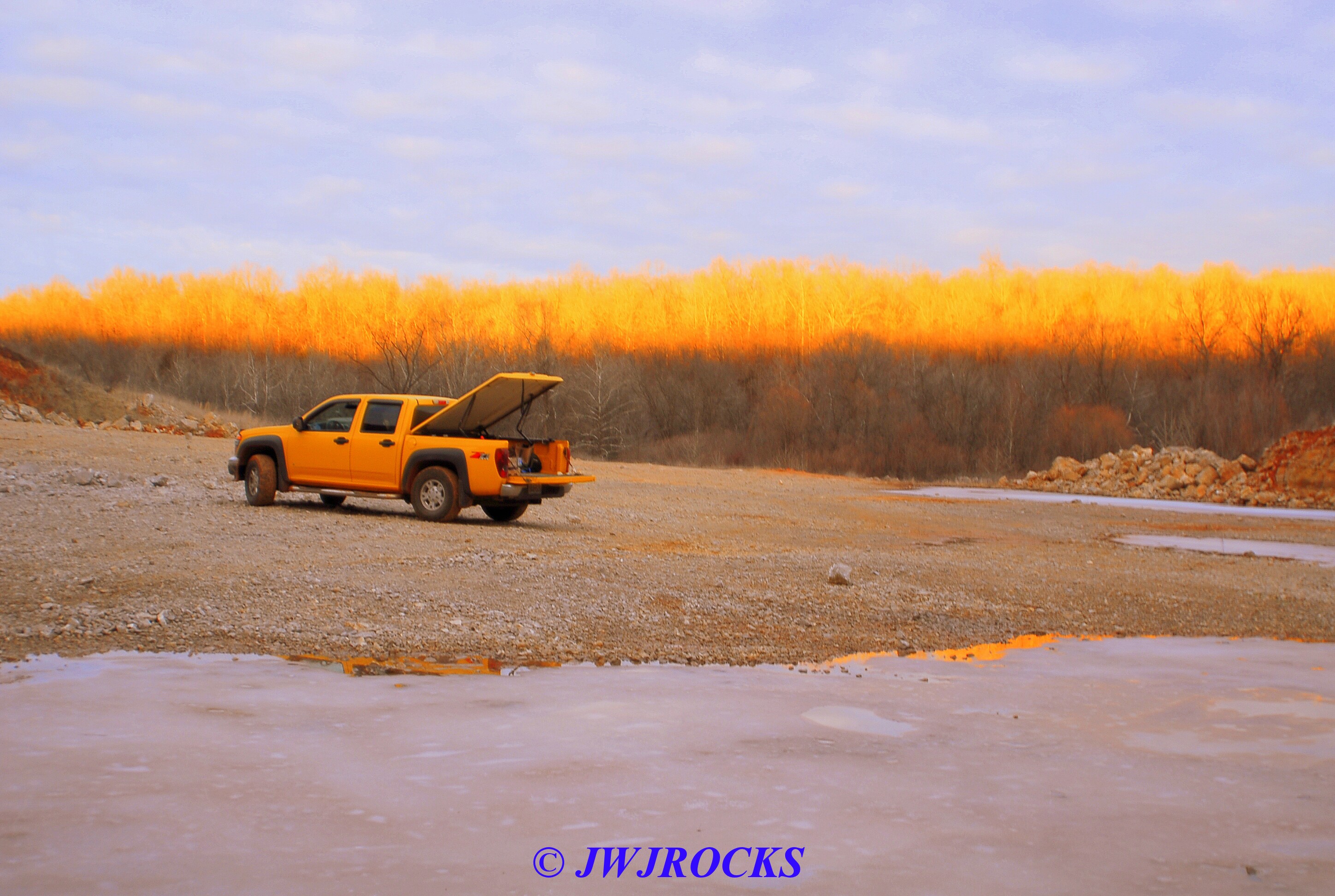 After filling another bag with my finds, I told him to take over if he wanted and see what he could find…as he was muscling out some of the rocks to see if there was another pocket below, he looked up and pointed out the sun setting on the trees on the far hill from us and my truck in the afterglow….