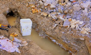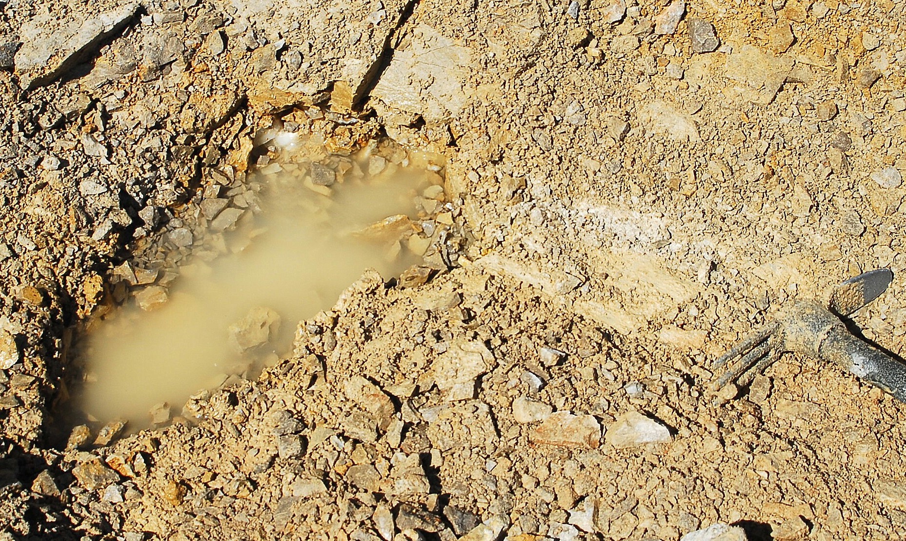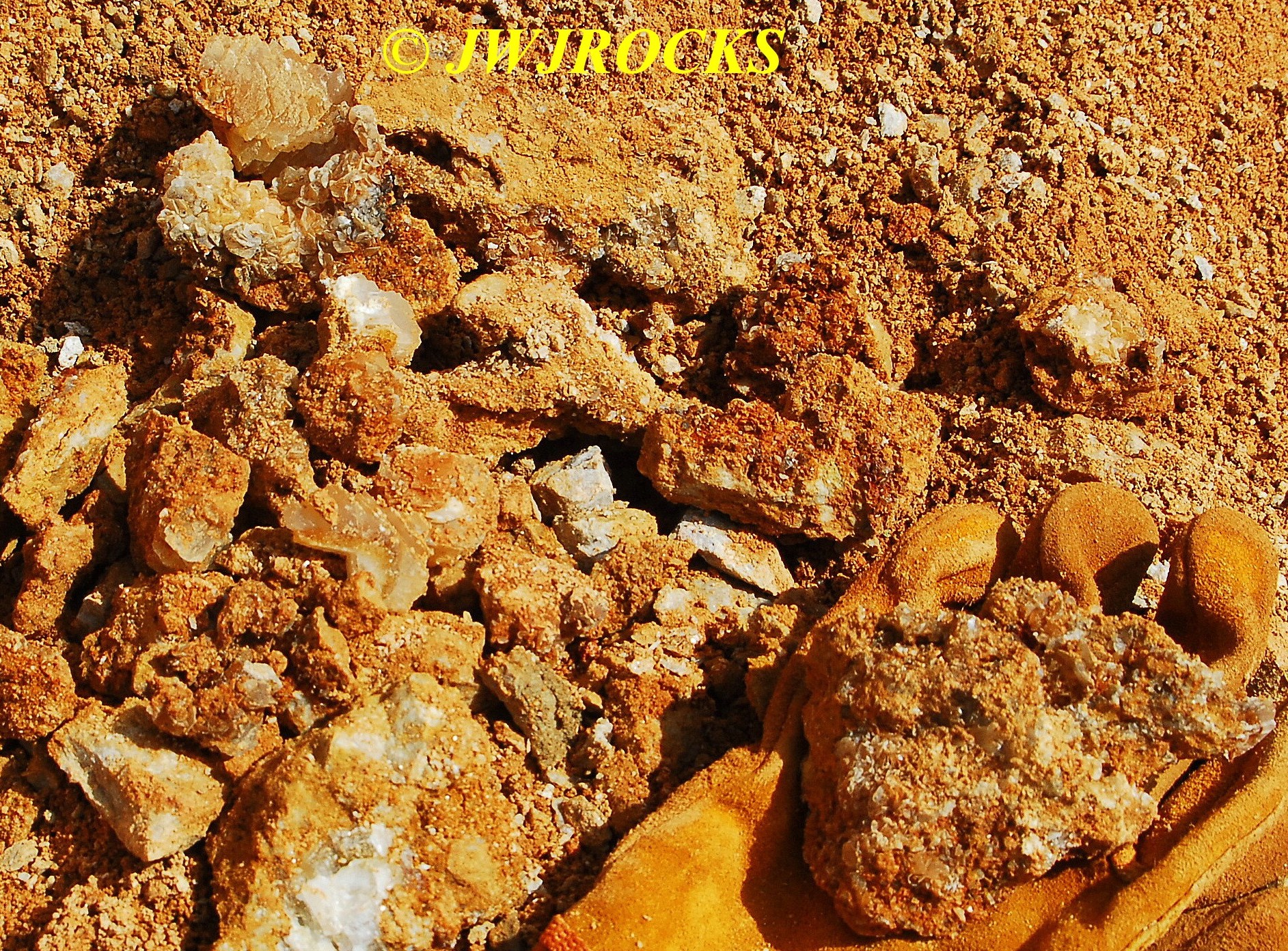 …the water in the pocket was cold….very cold…spring fed type cold….and kept filling in every ten minutes with whatever amount I took out by bailing….pretty soon it was evident that I needed something bigger to bail with, the little water bowl for Missy that I had wasnt getting the job done, so I went back to my truck and pulled out the 3.5 gallon square bucket that I keep my tools in, and began bailing water much more efficiently after that. I was taking seven to ten gallons out of that pocket every fifteen minutes and digging out crystals in between bailing times….here you see crystals just waiting to be pulled out of the loose fill and muck as the pocket kept expanding to my left….